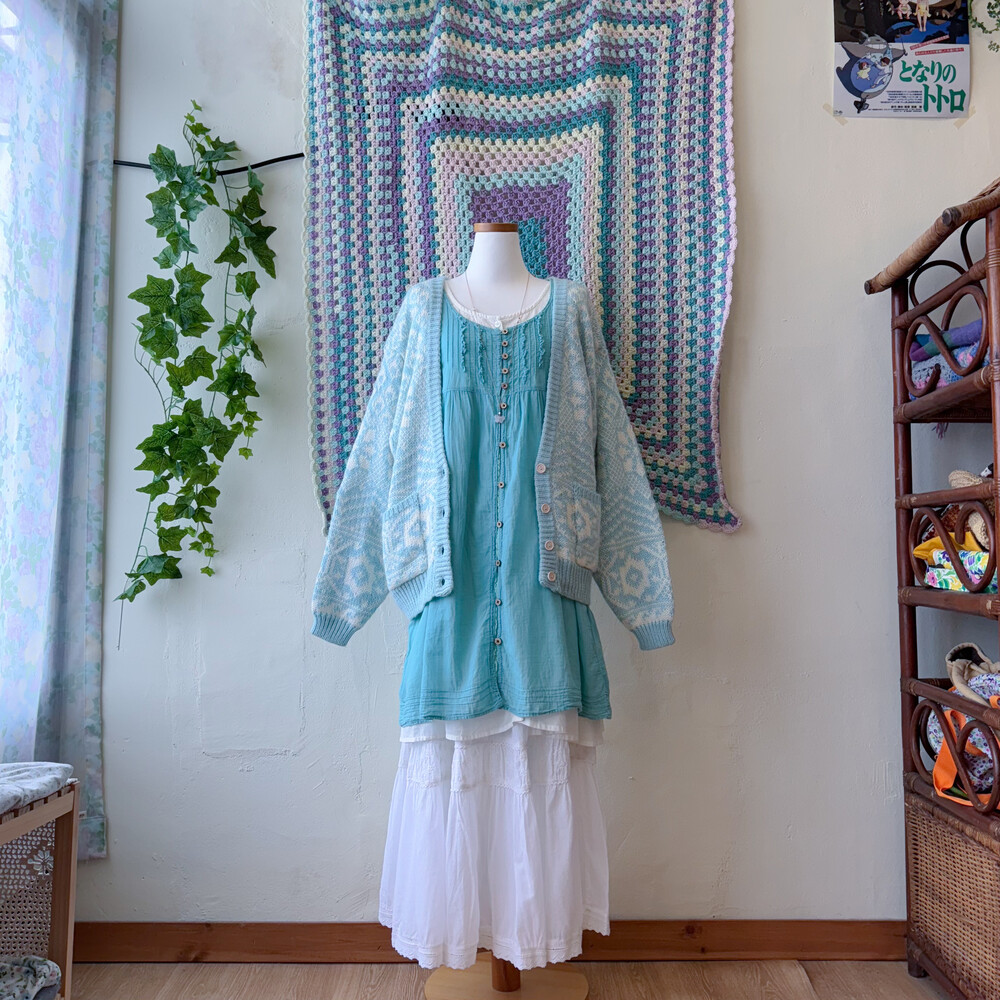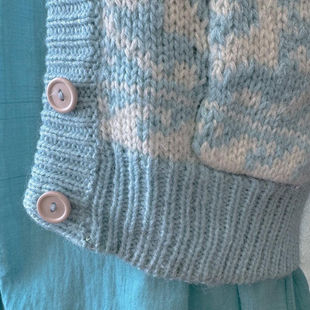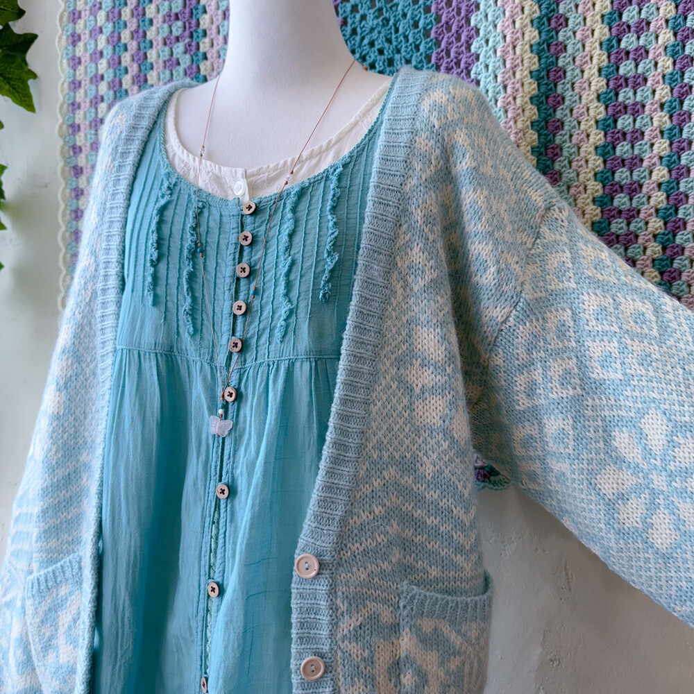 연한 아쿠아블루 색감의 패턴 브이넥 가디건이에요