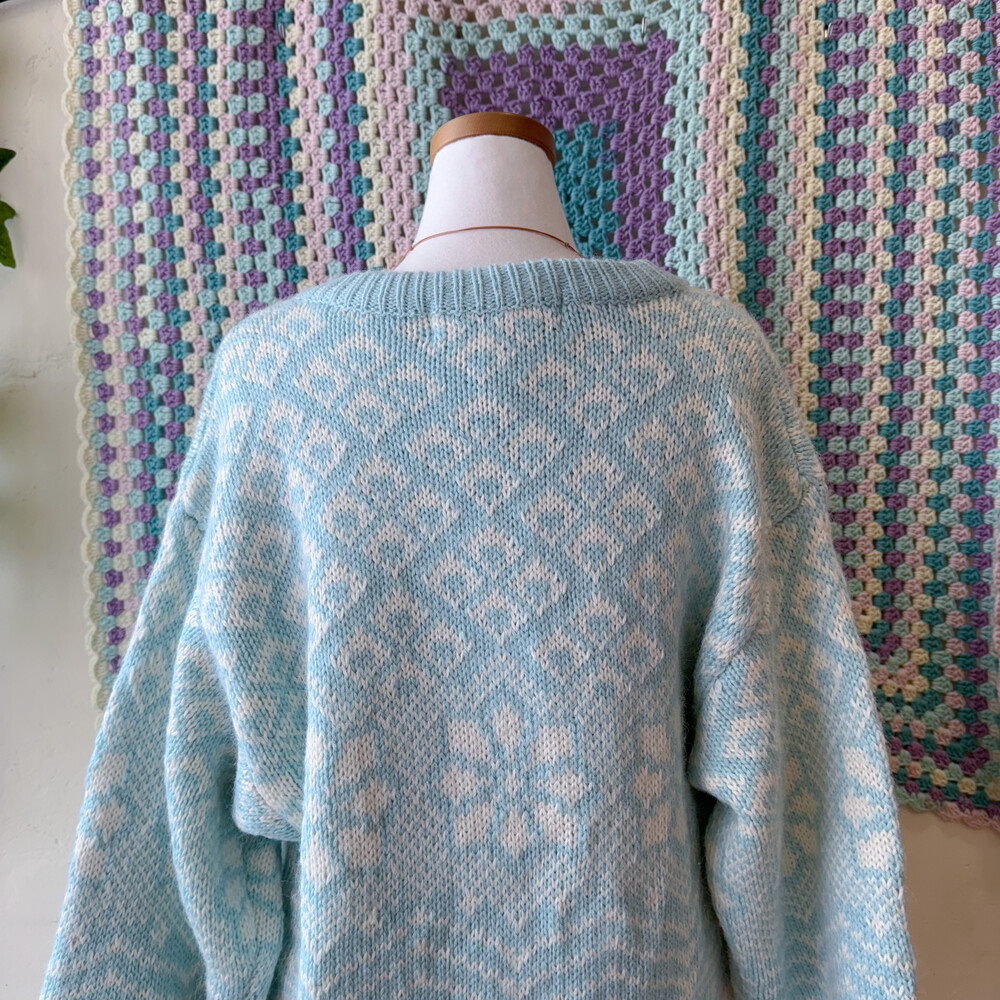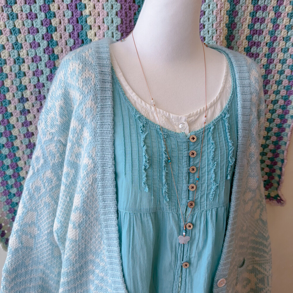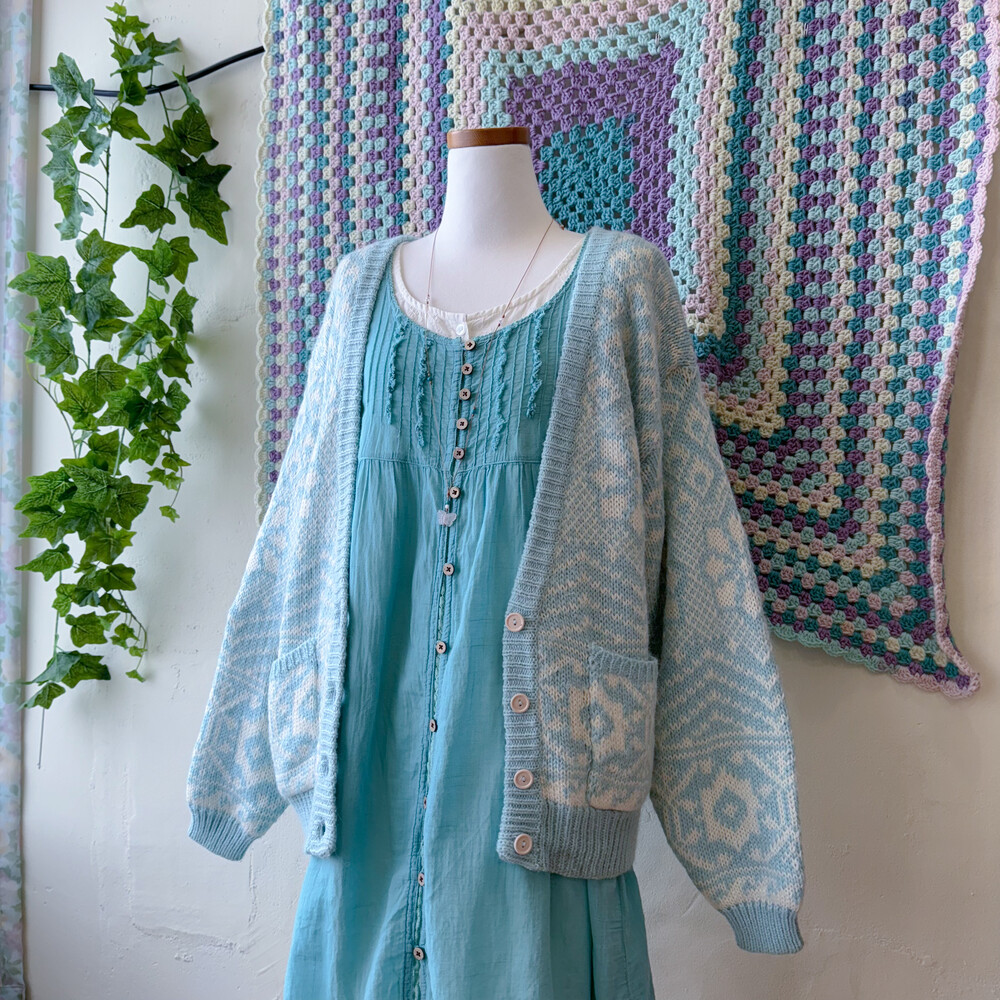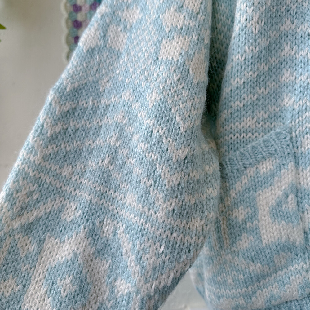 연한 아쿠아블루 색감의 패턴 브이넥 가디건이에요