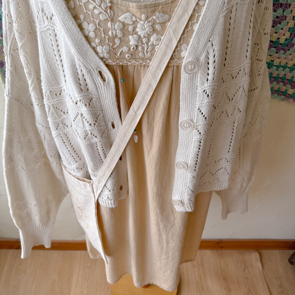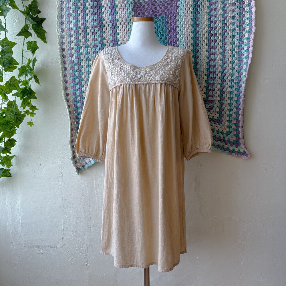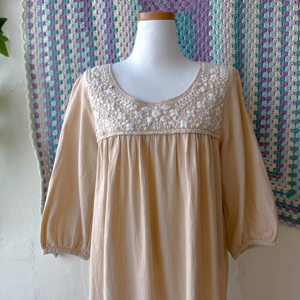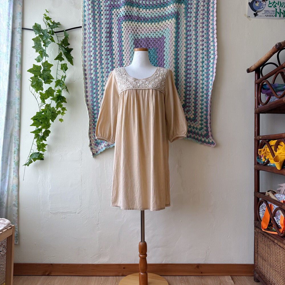 베이지 색감의 자수 원피스예요