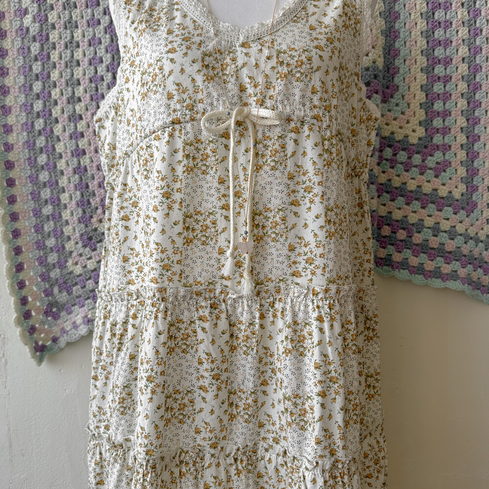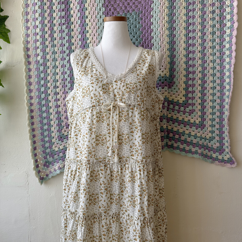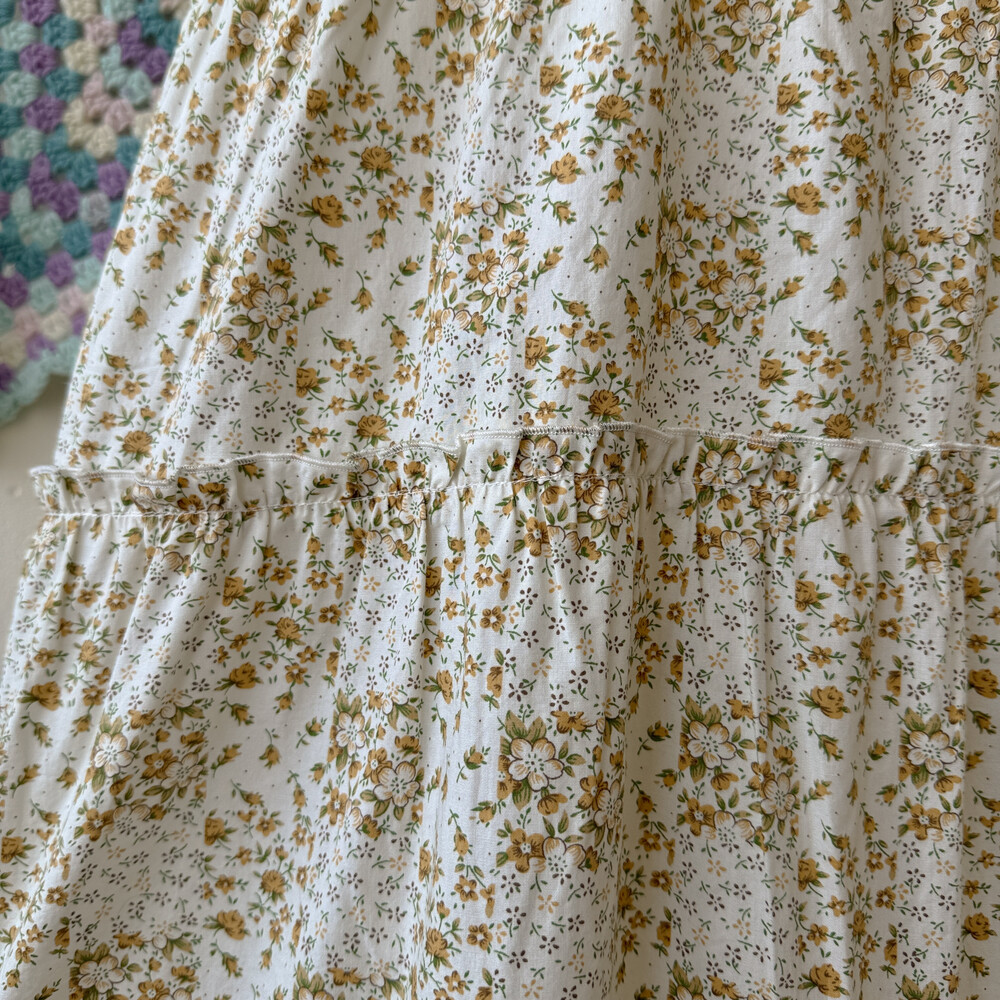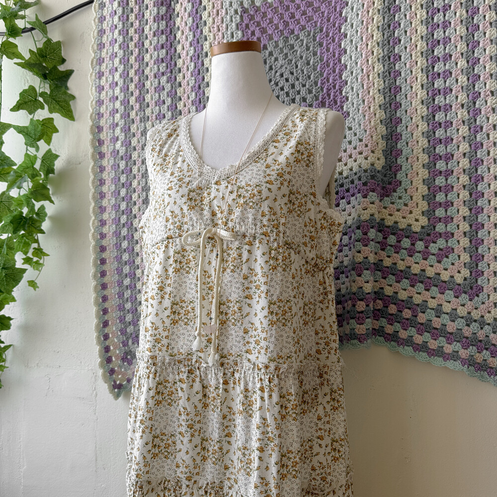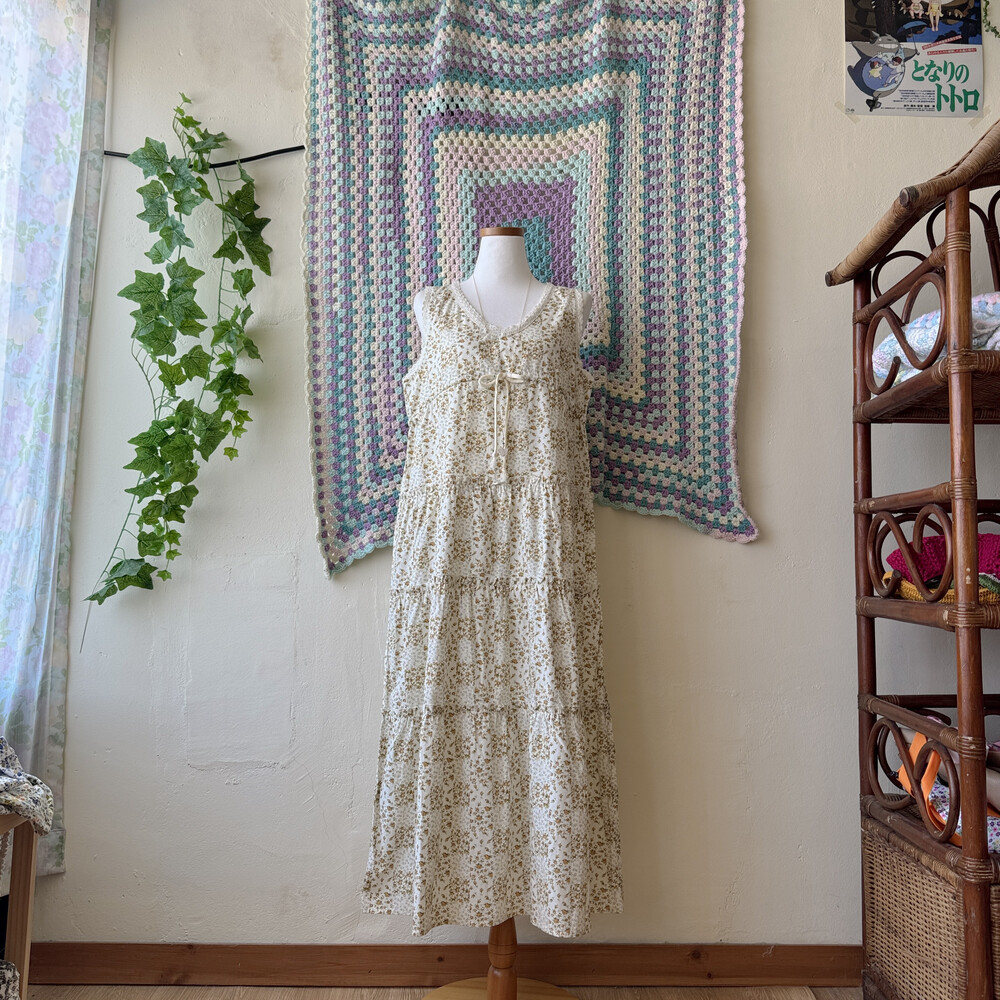 머스타드 색감의 꽃무늬 민소매 롱원피스예요