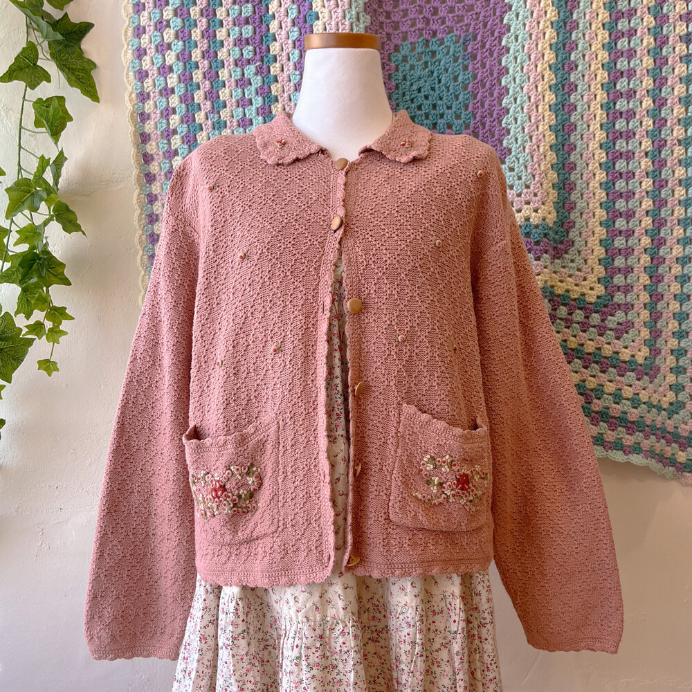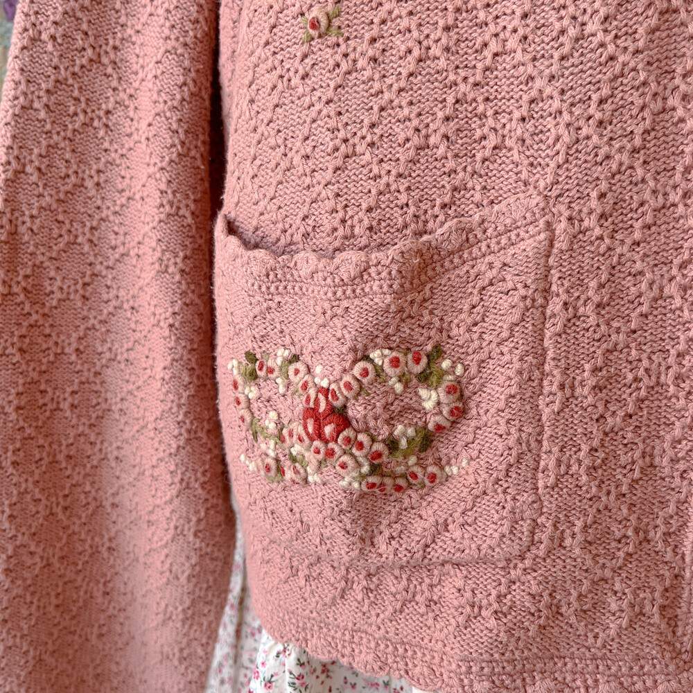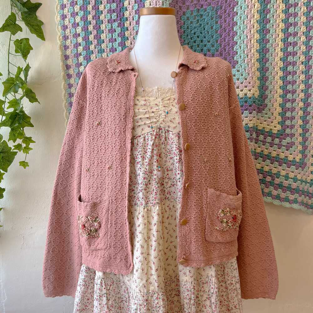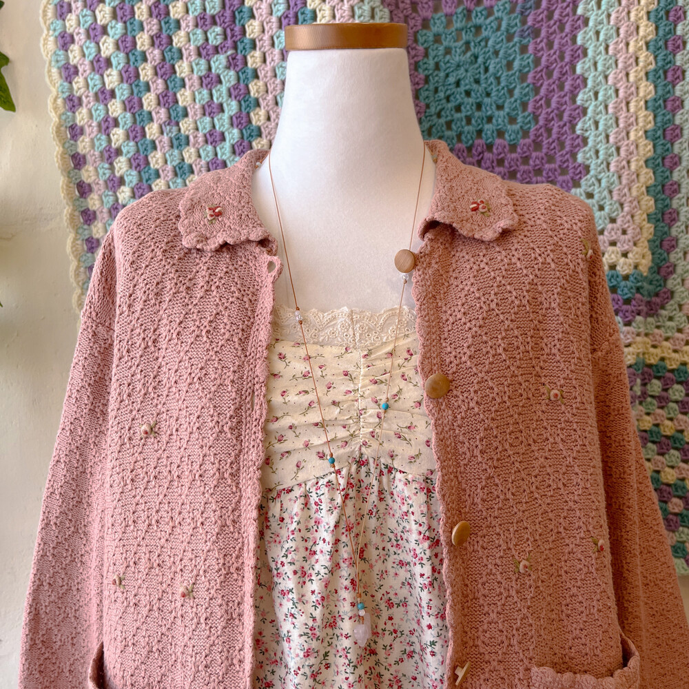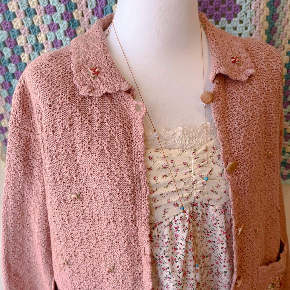 웜한 핑크 색감의 자수 카라 가디건이에요