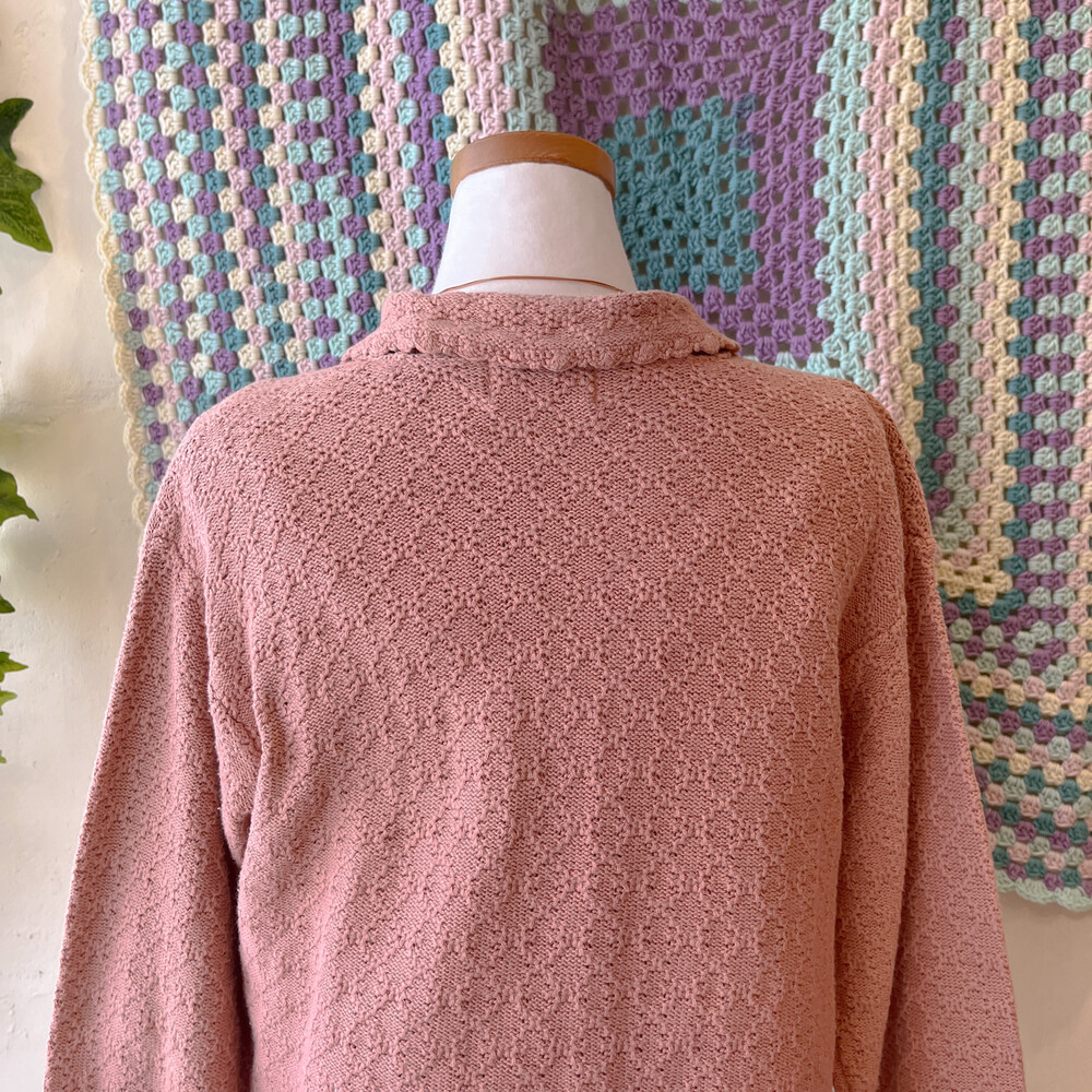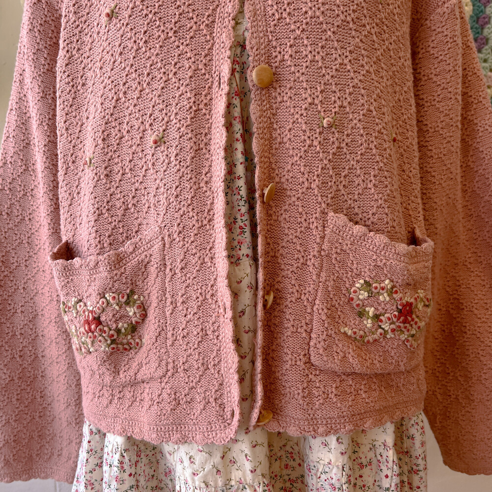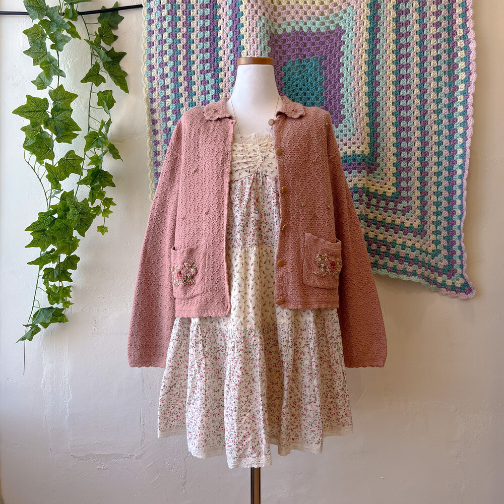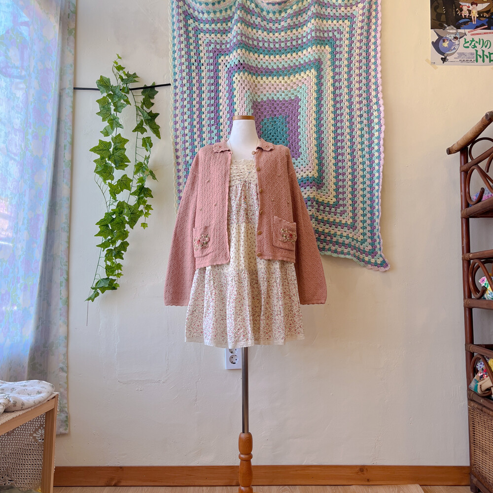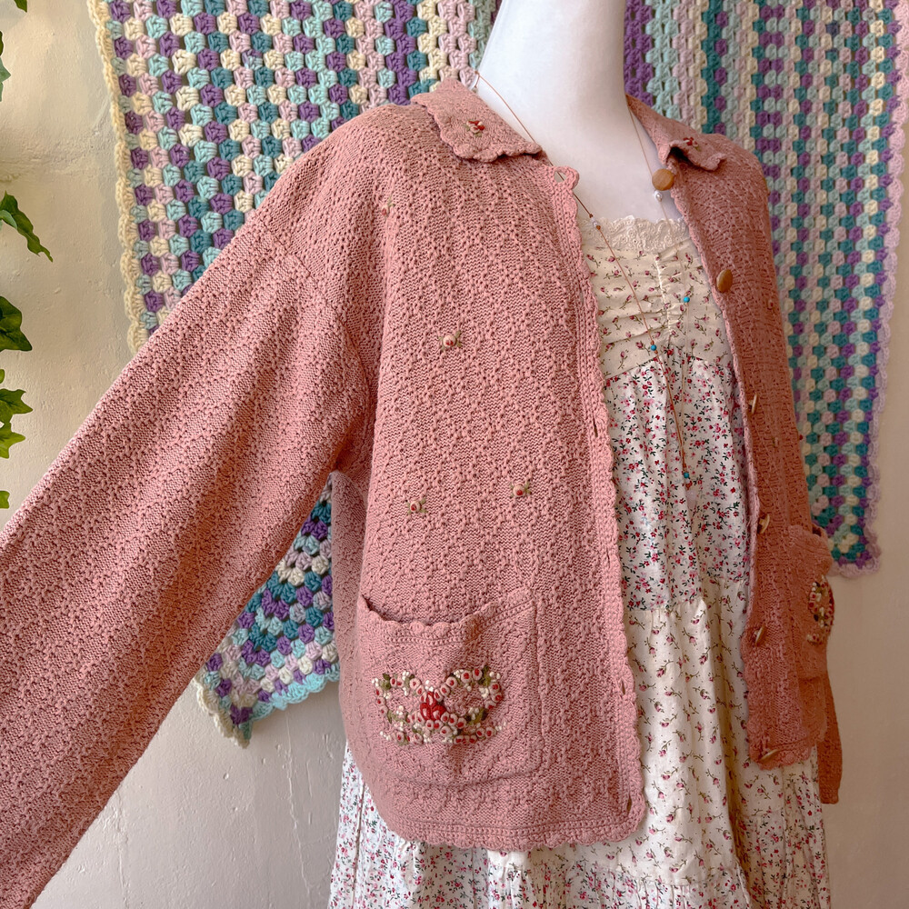 웜한 핑크 색감의 자수 카라 가디건이에요