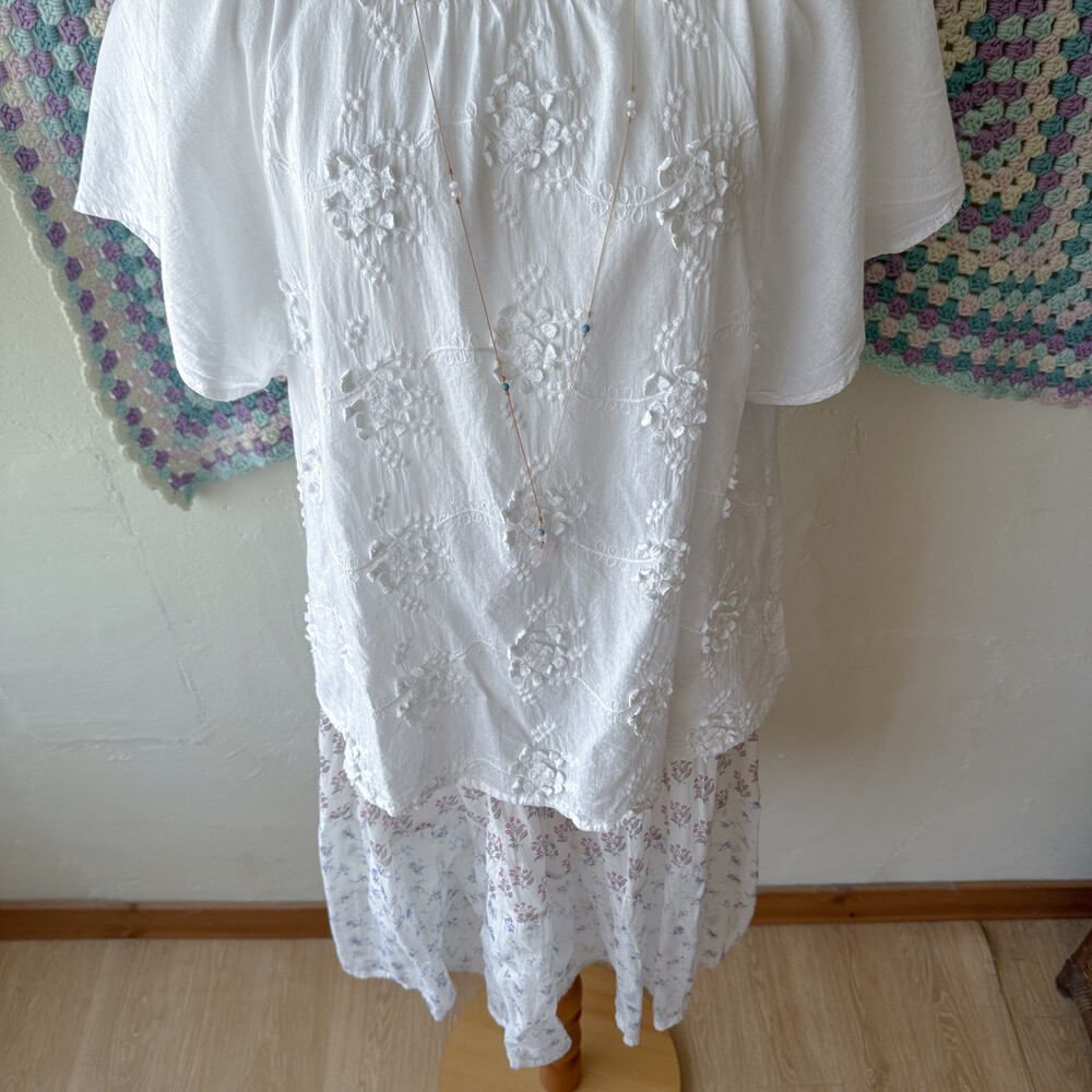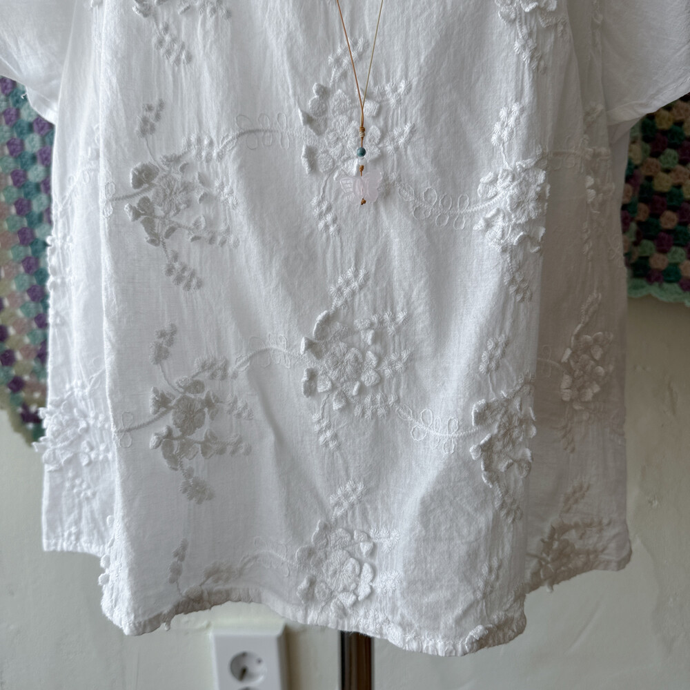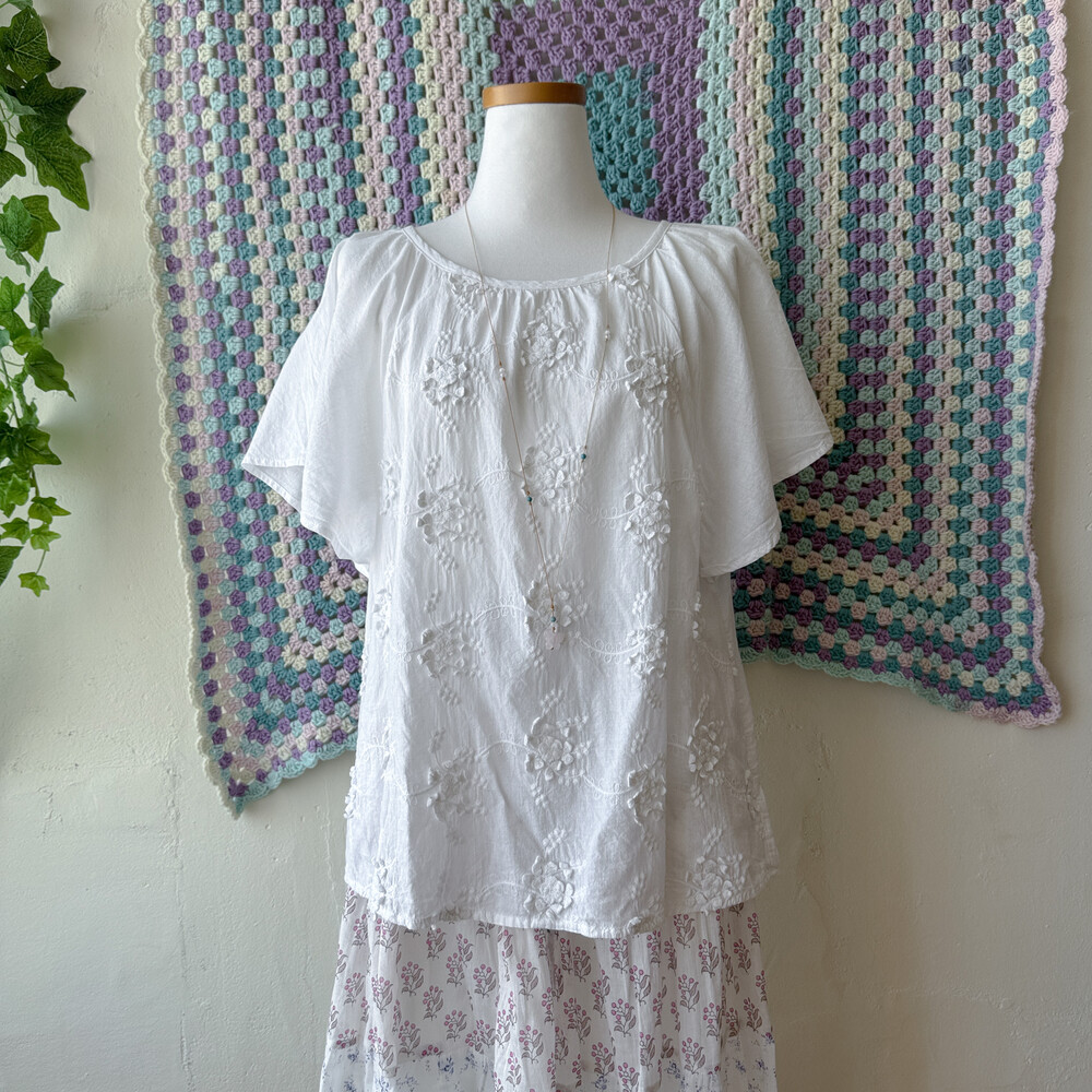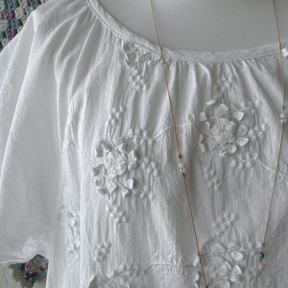 모티브 꽃이 달려있는 청순한 분위기의 블라우스예요