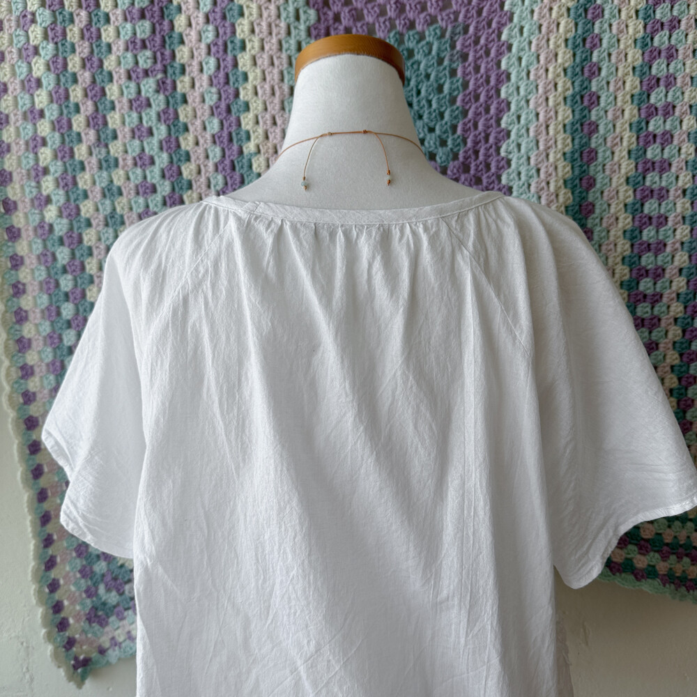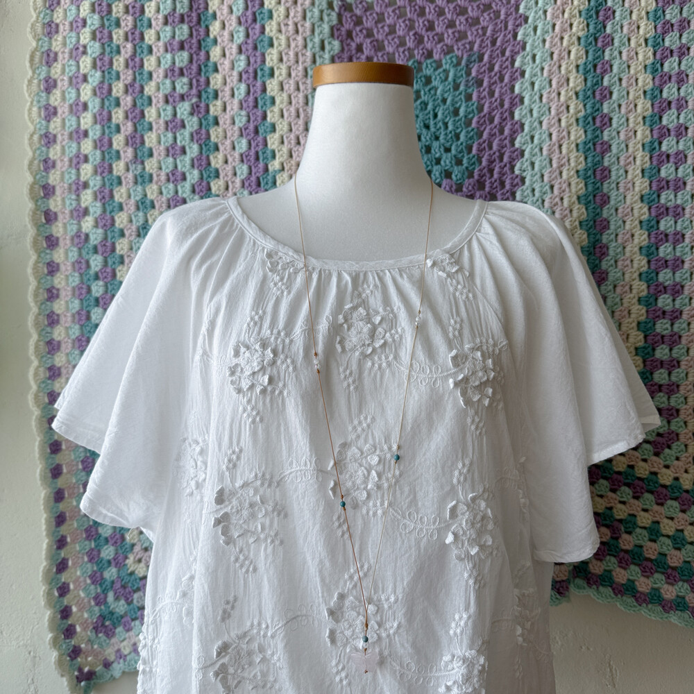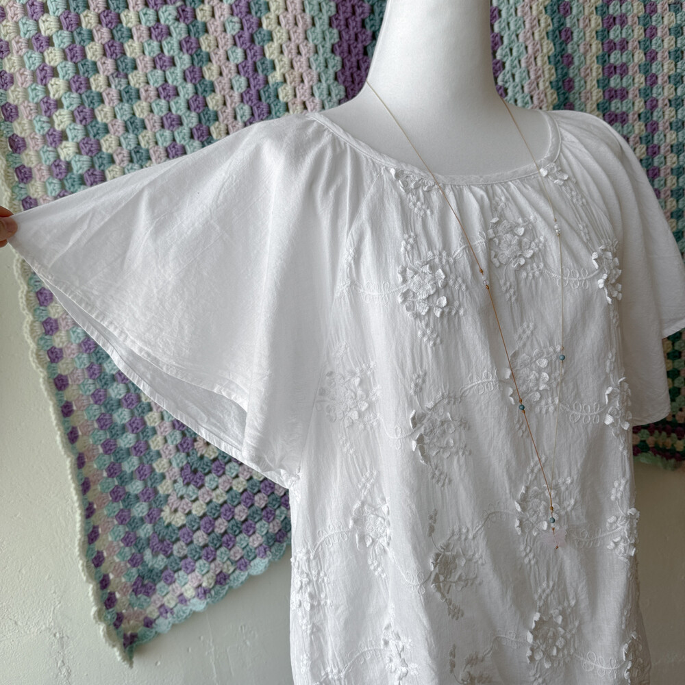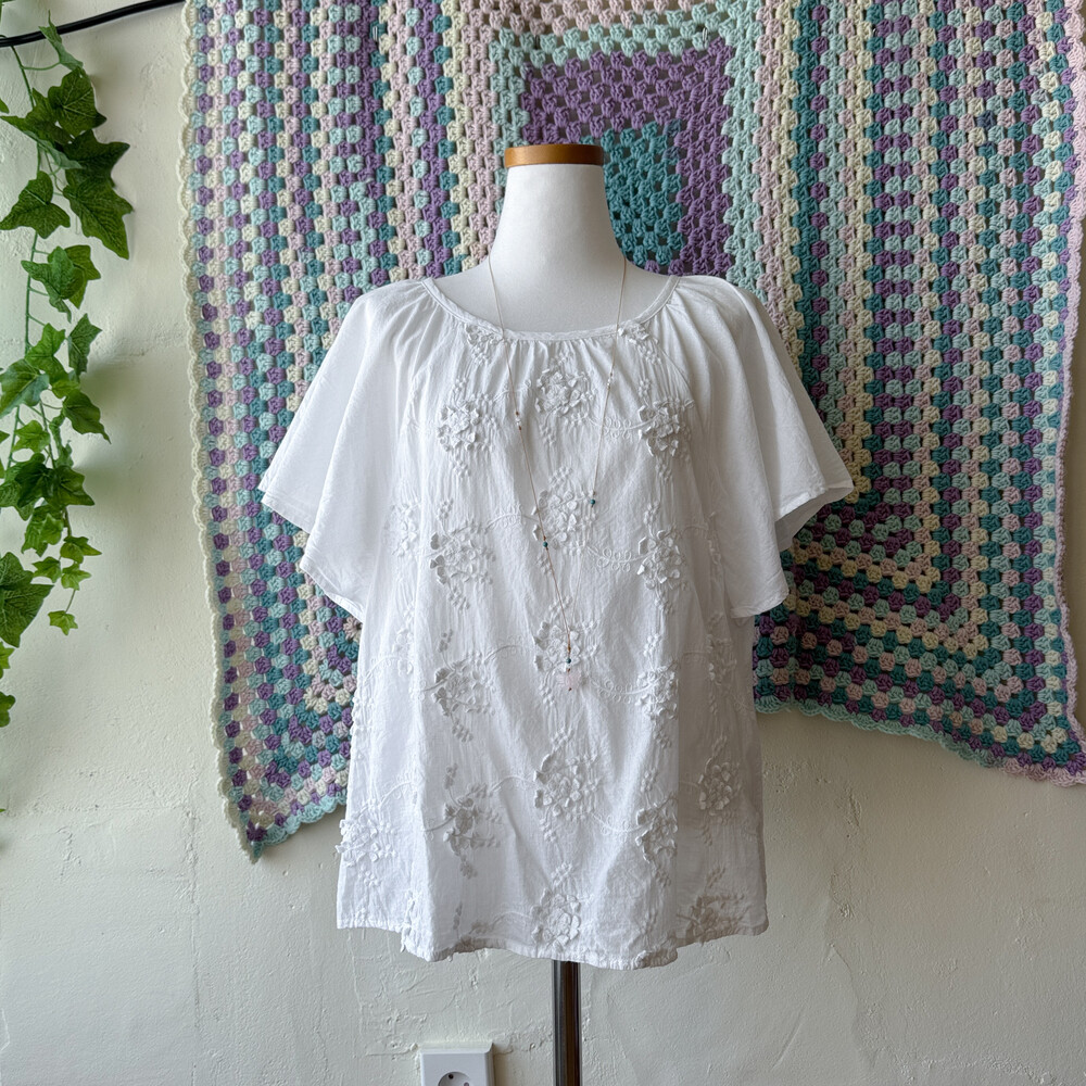 모티브 꽃이 달려있는 청순한 분위기의 블라우스예요