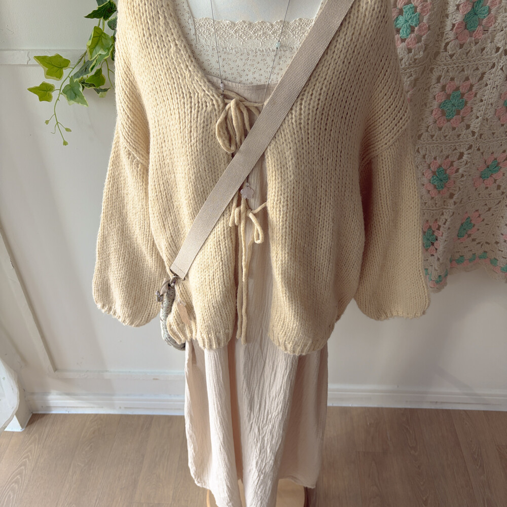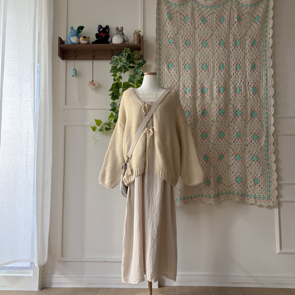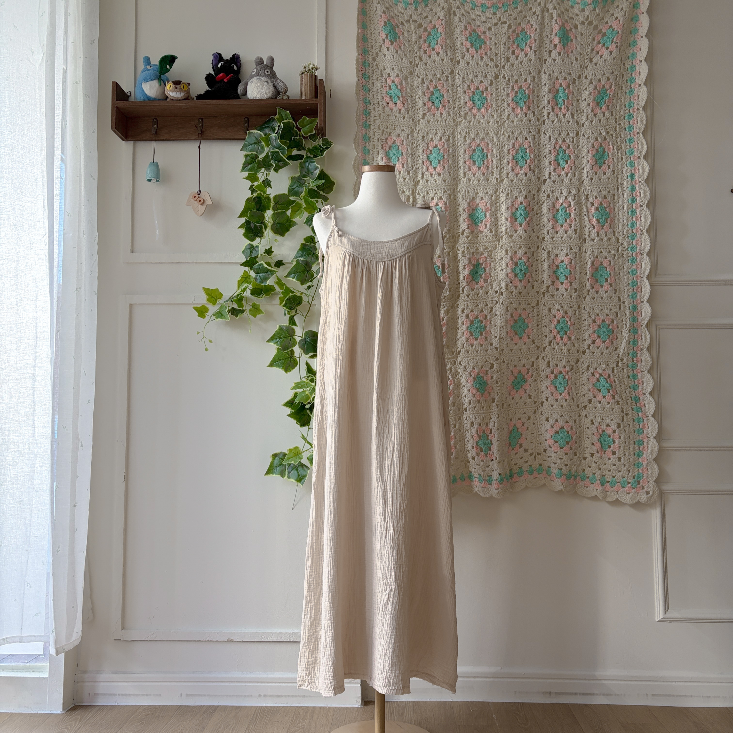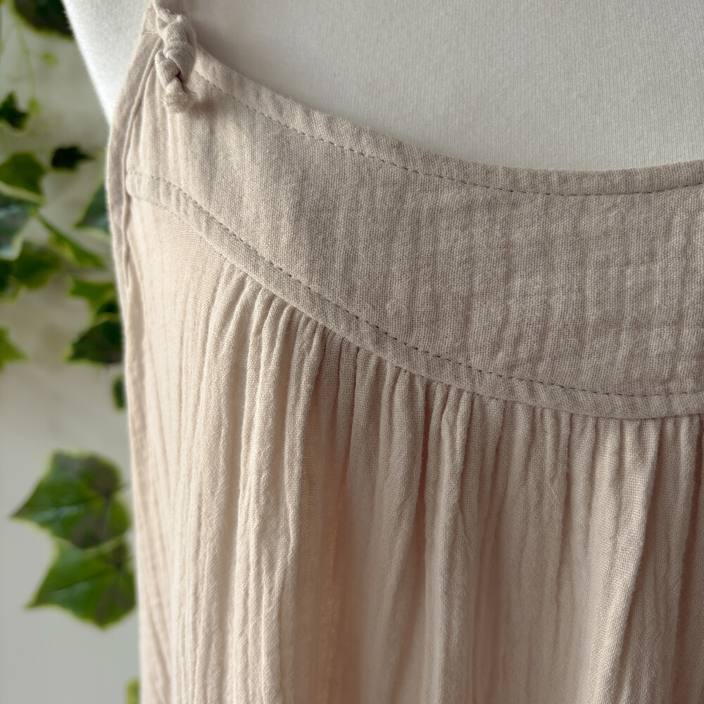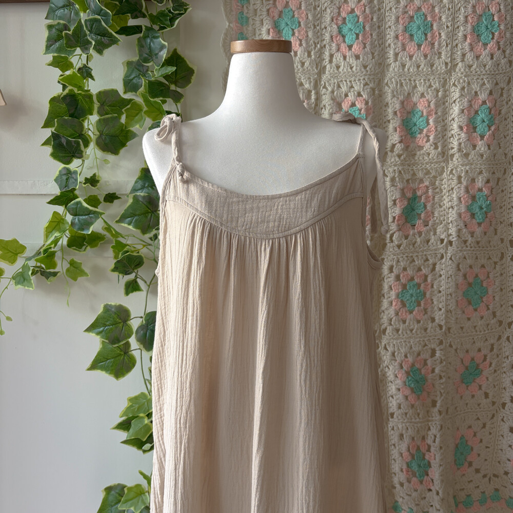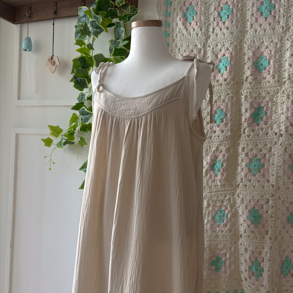 베이지 색감의 코튼 끈원피스예요