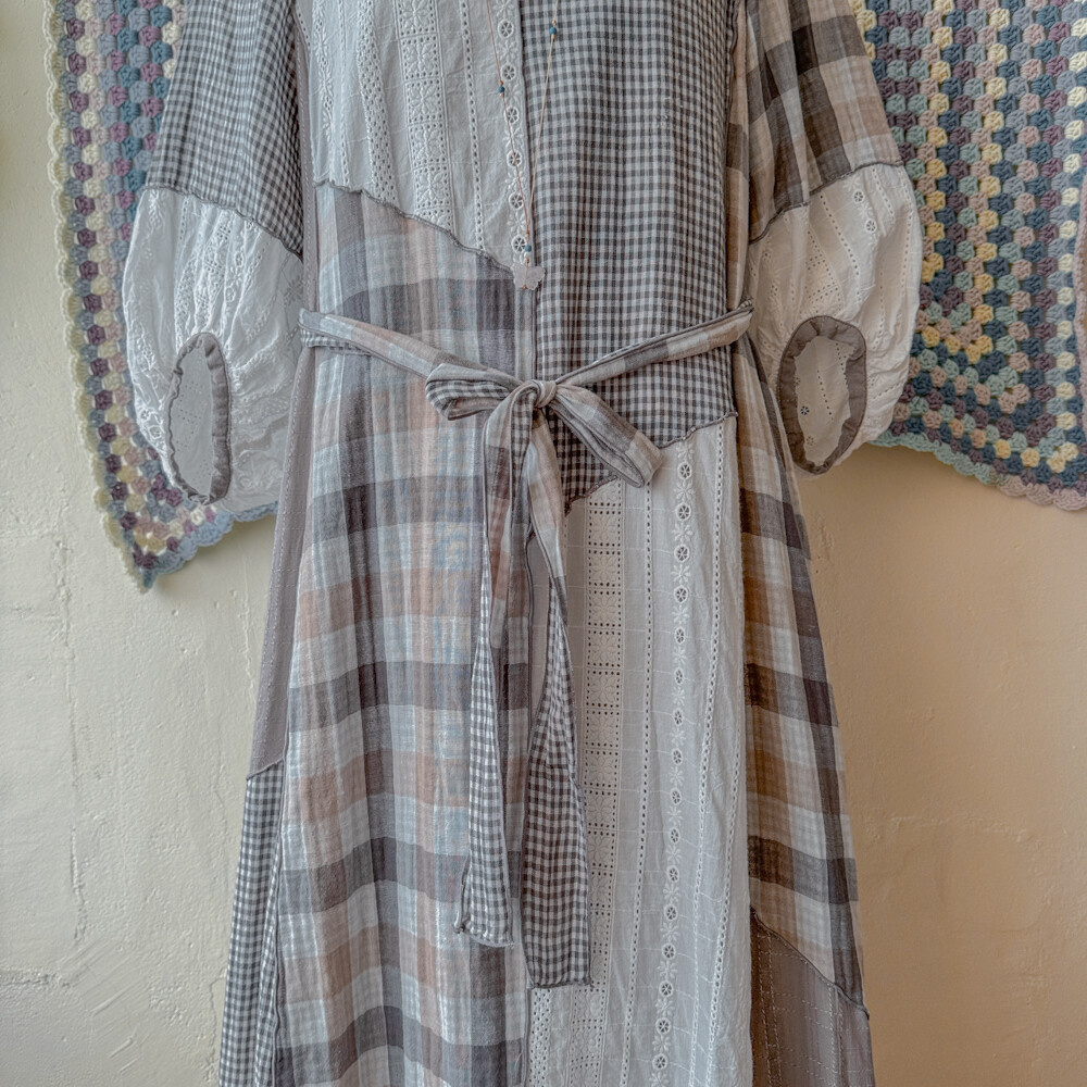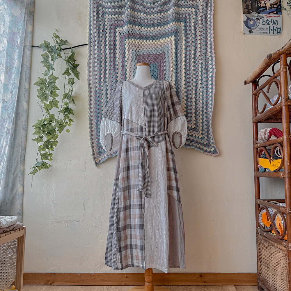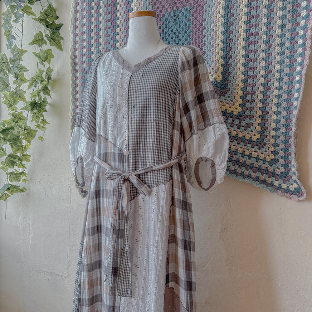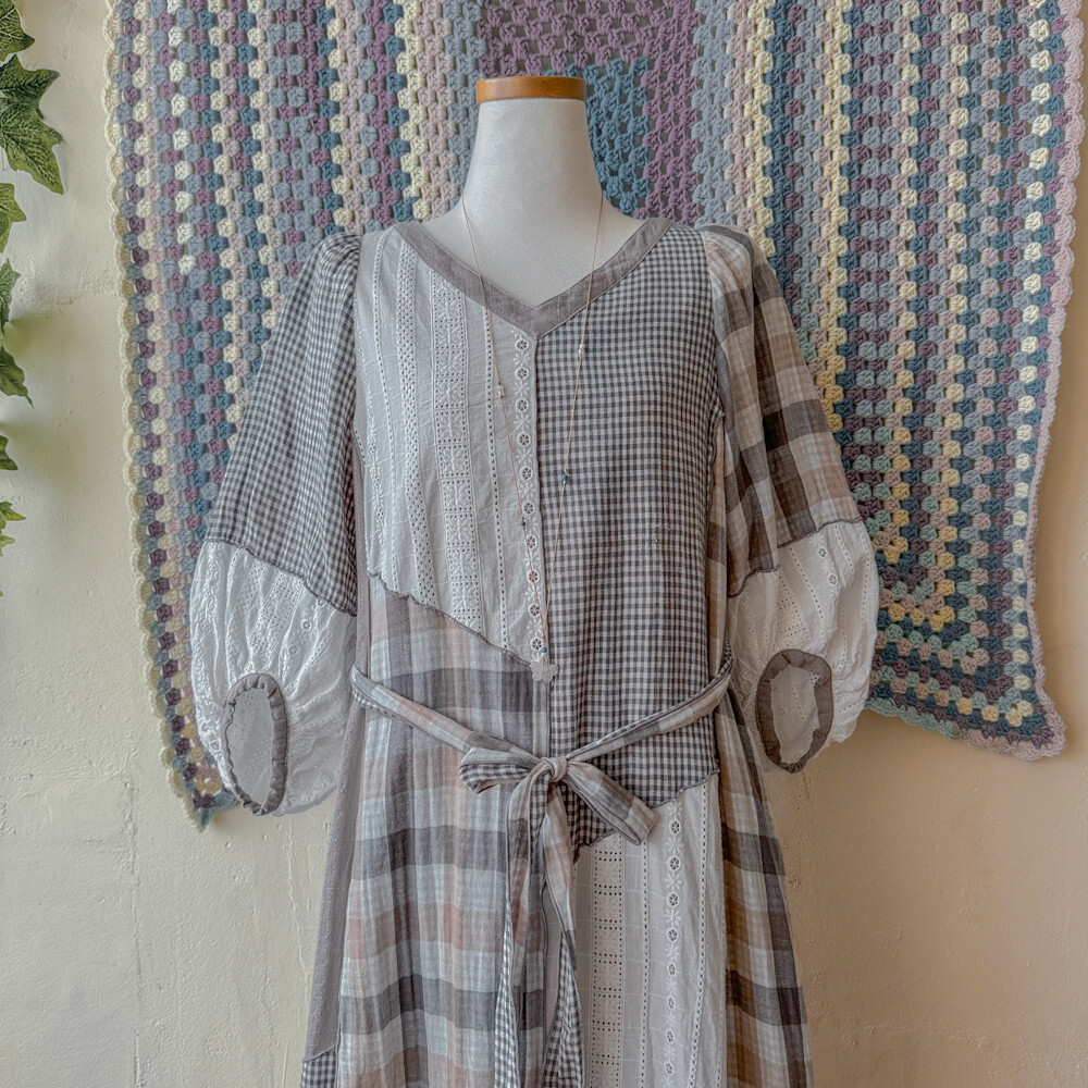 그레이, 브라운 색감 베이스의 체크 패치 원피스예요