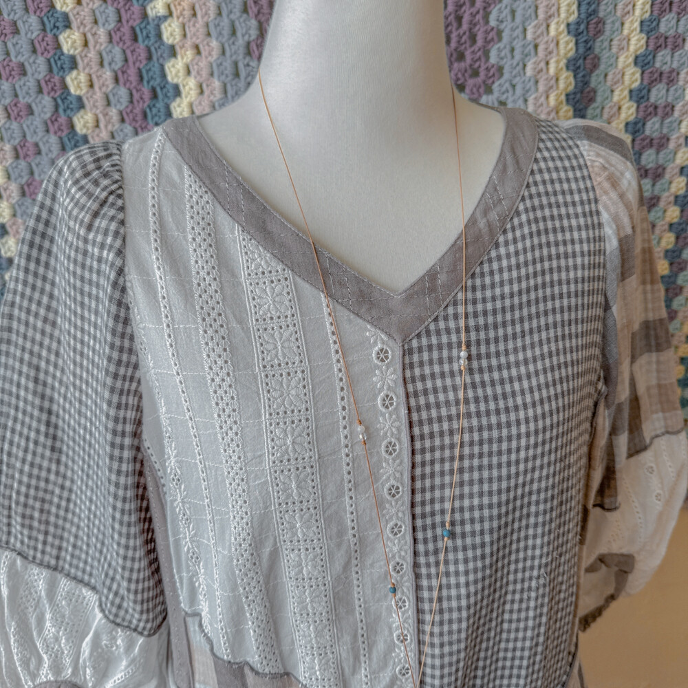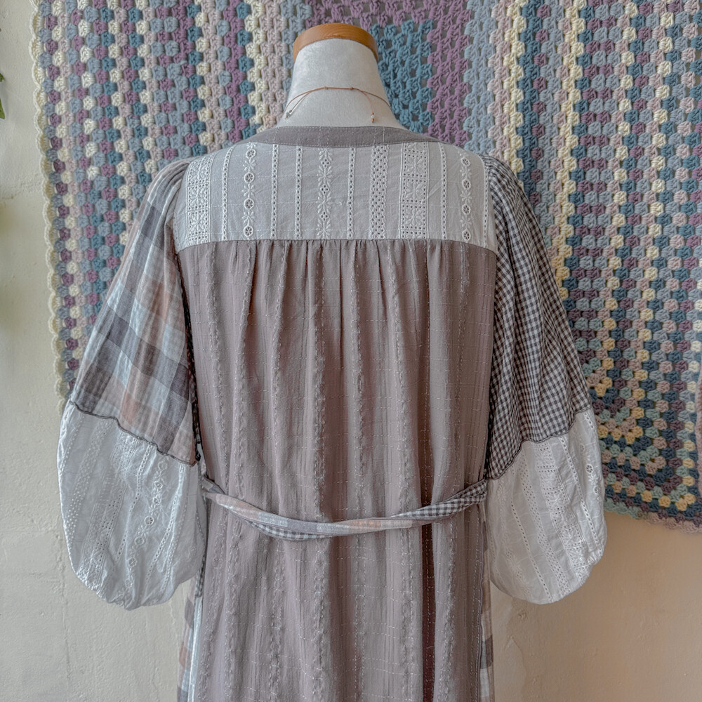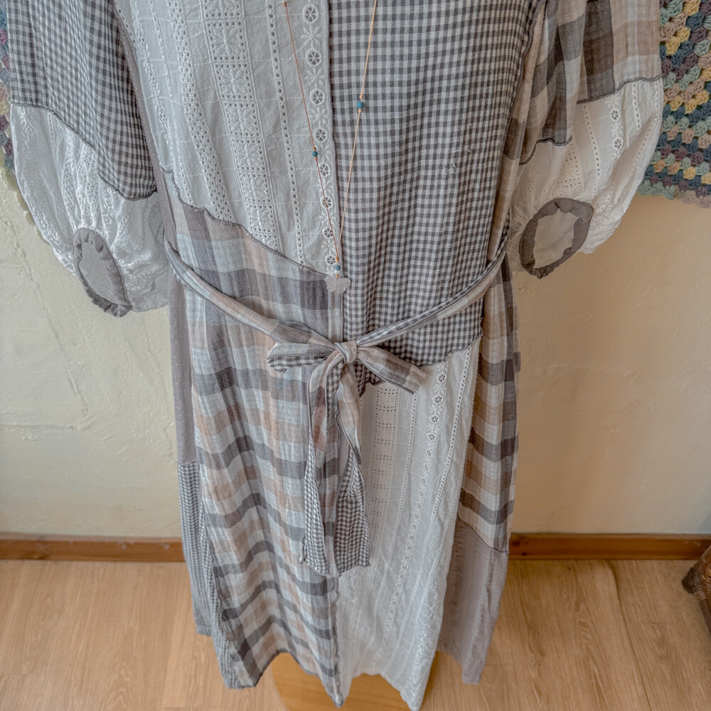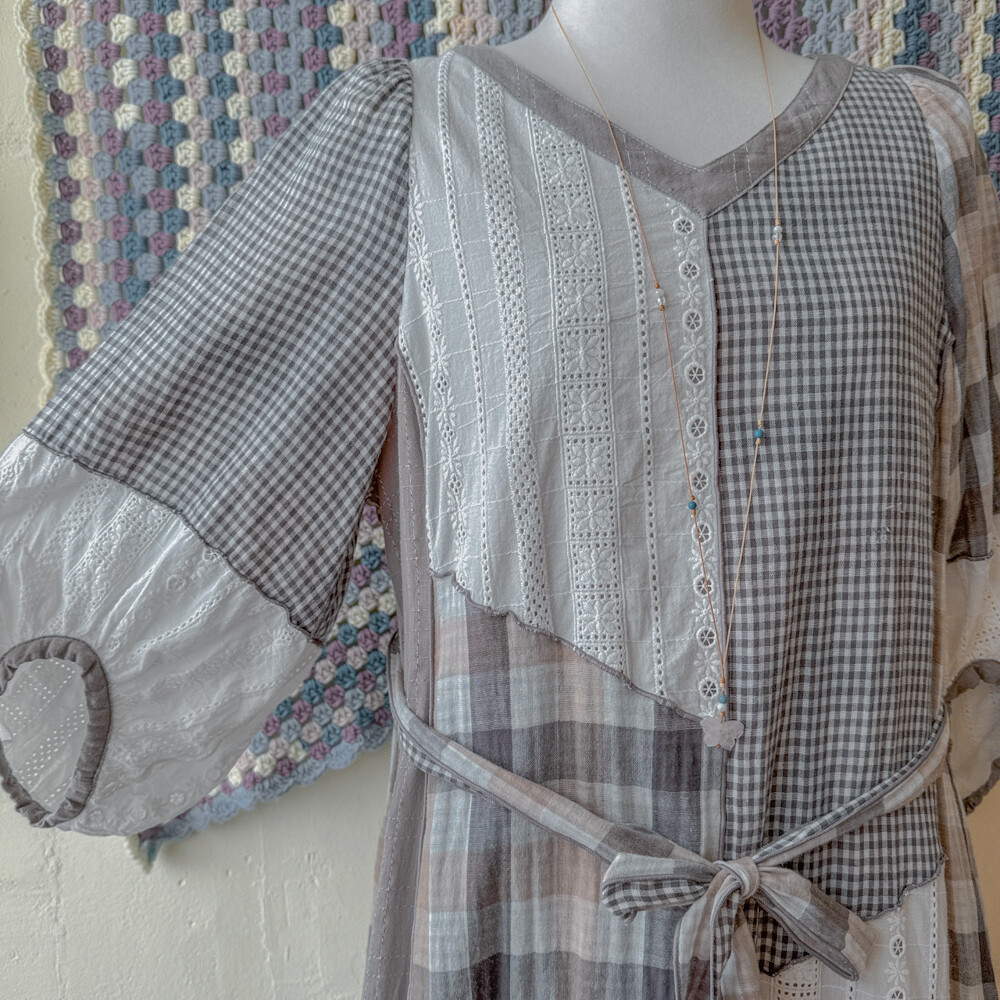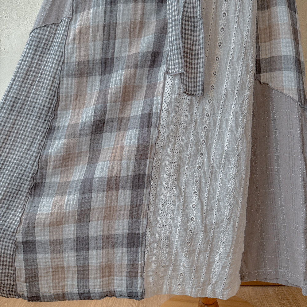그레이, 브라운 색감 베이스의 체크 패치 원피스예요