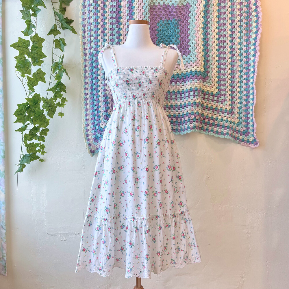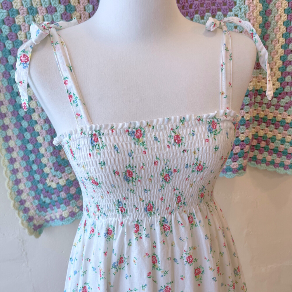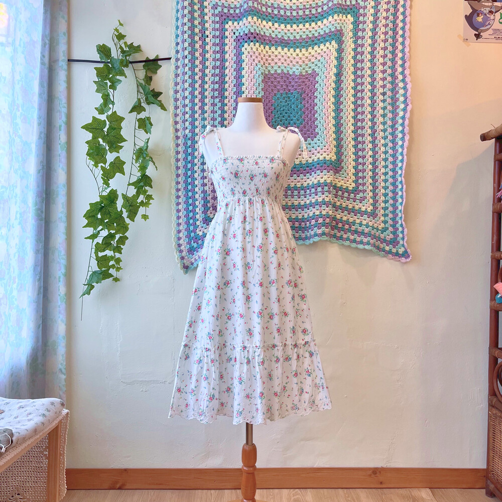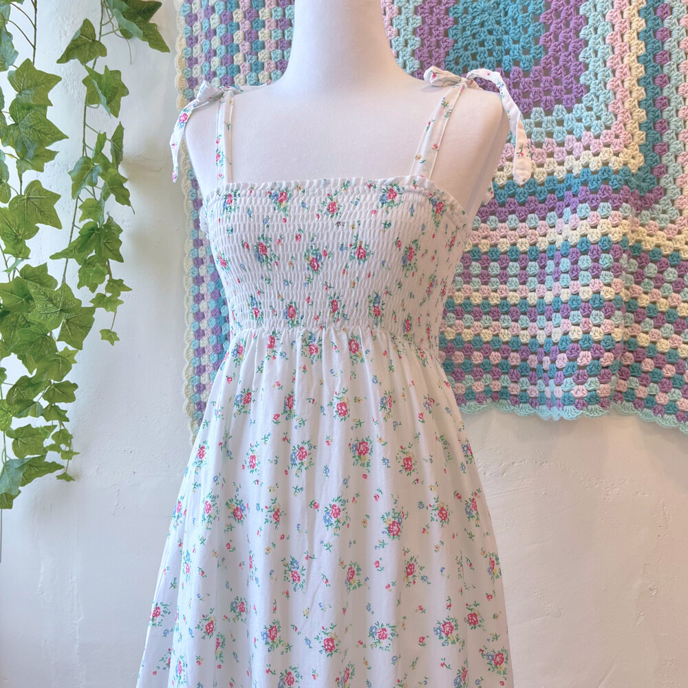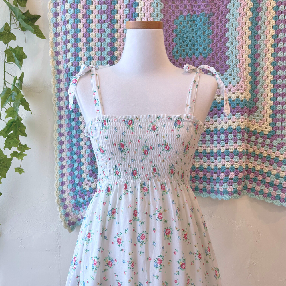 블루, 핑크 플라워 패턴의 코튼 끈원피스예요