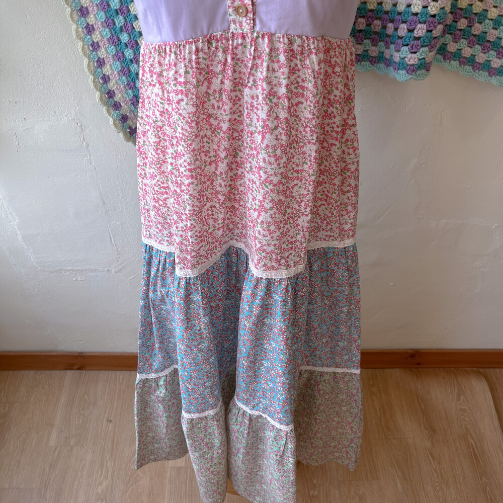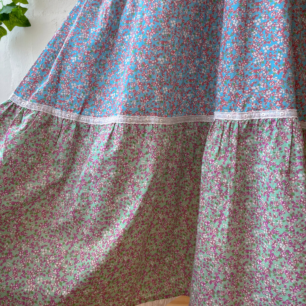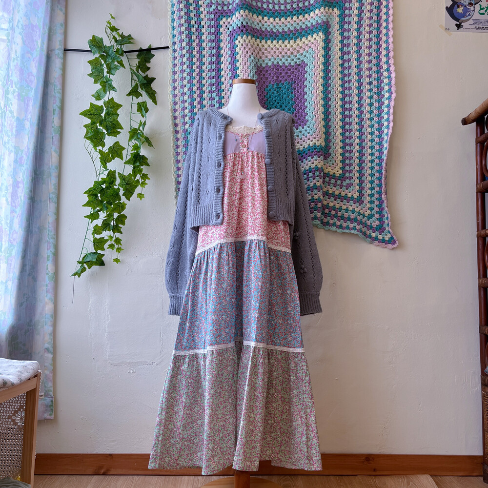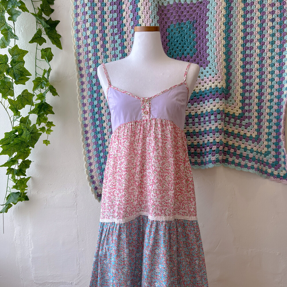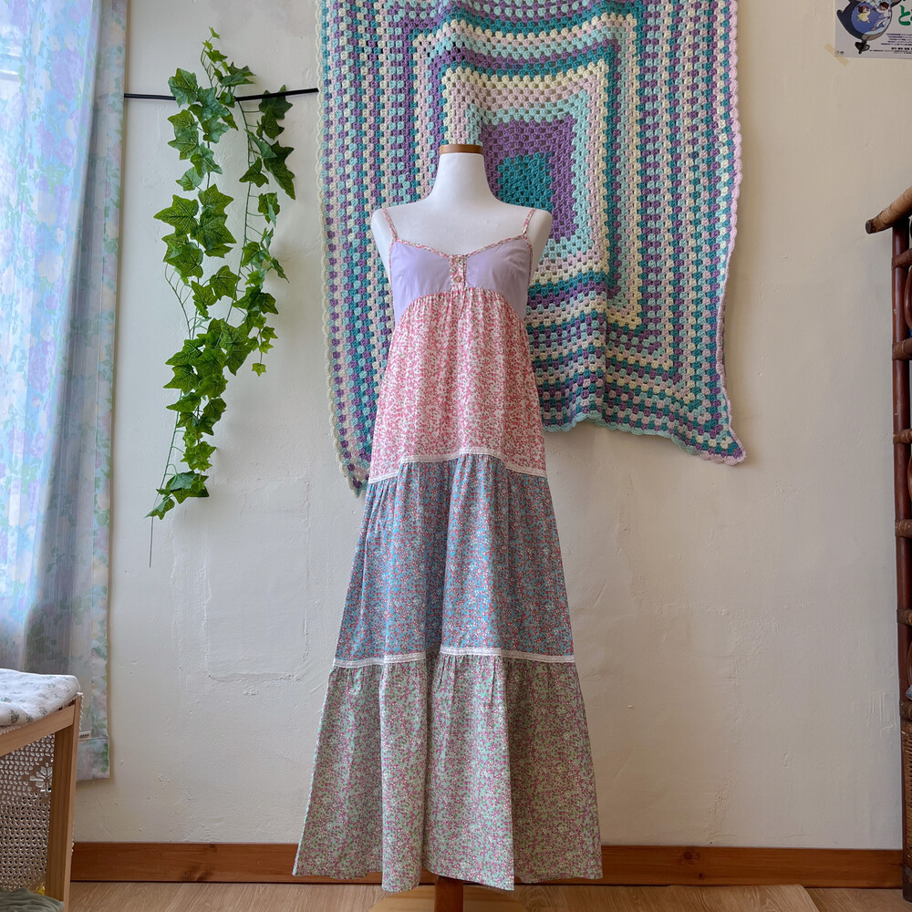퍼플, 블루, 그린, 핑크 색감의 패치워크 끈원피스예요