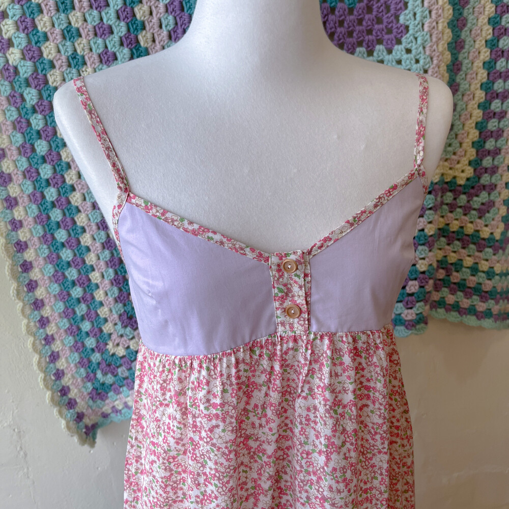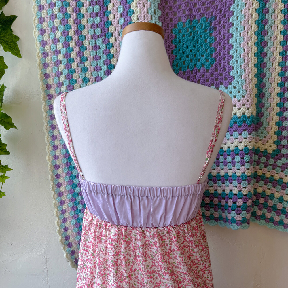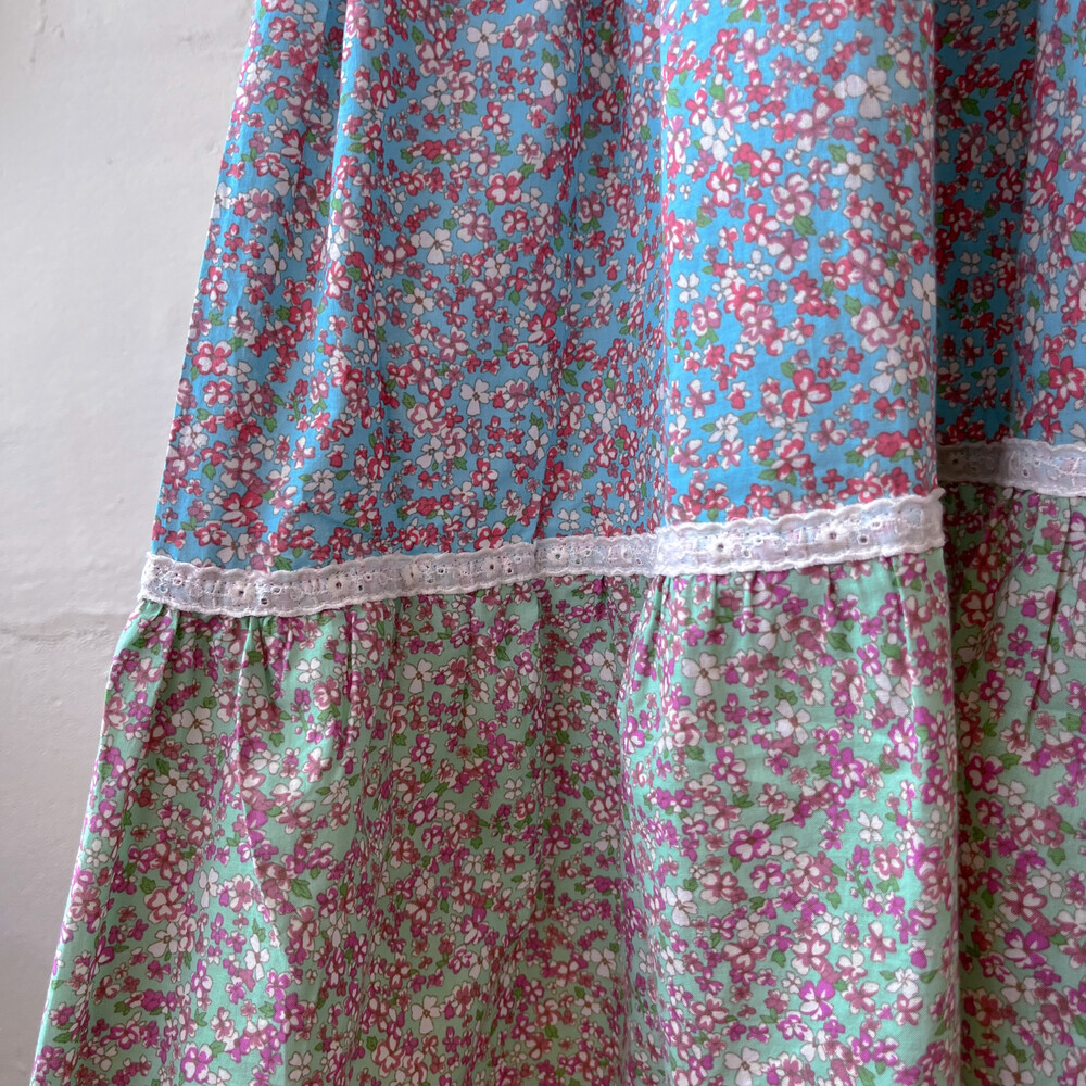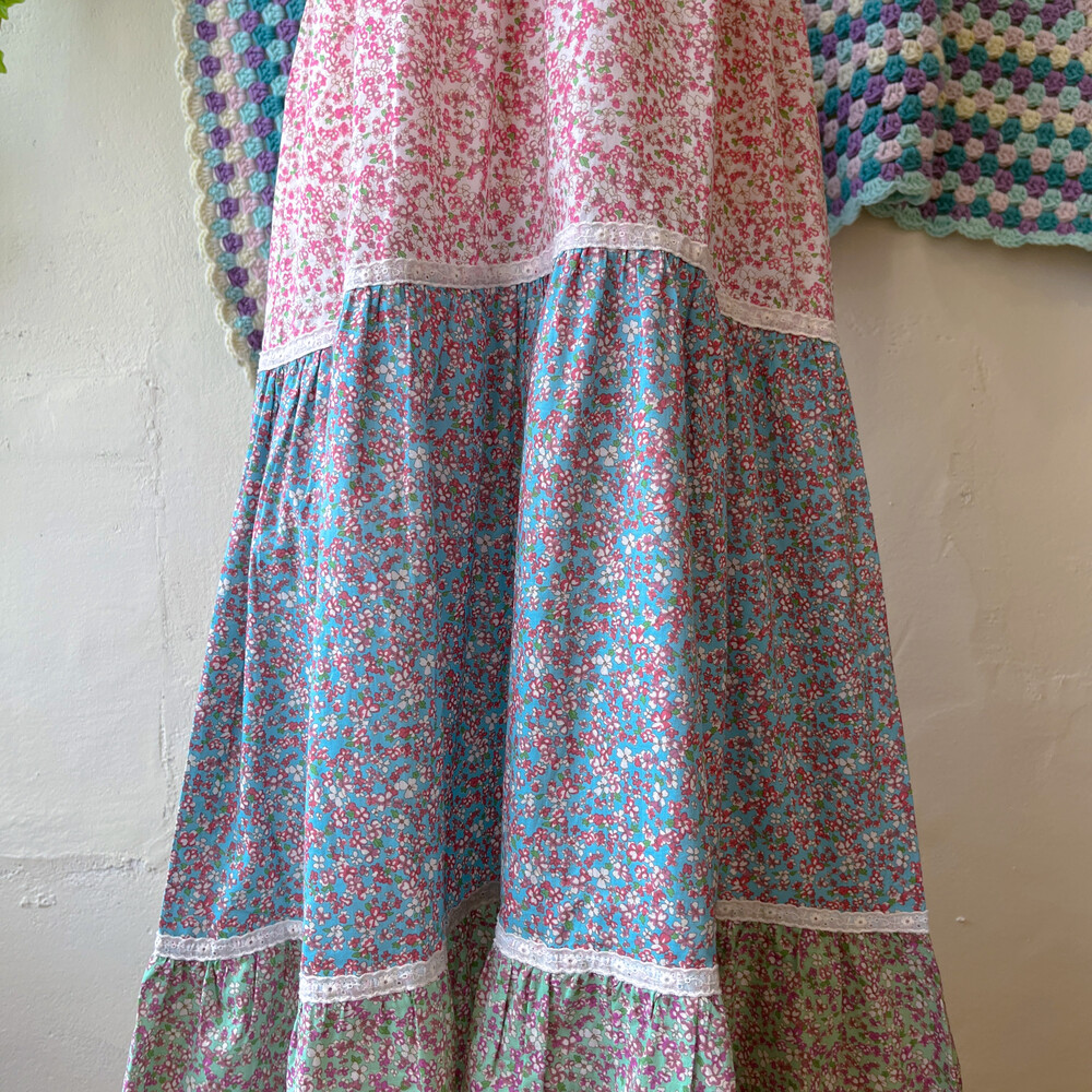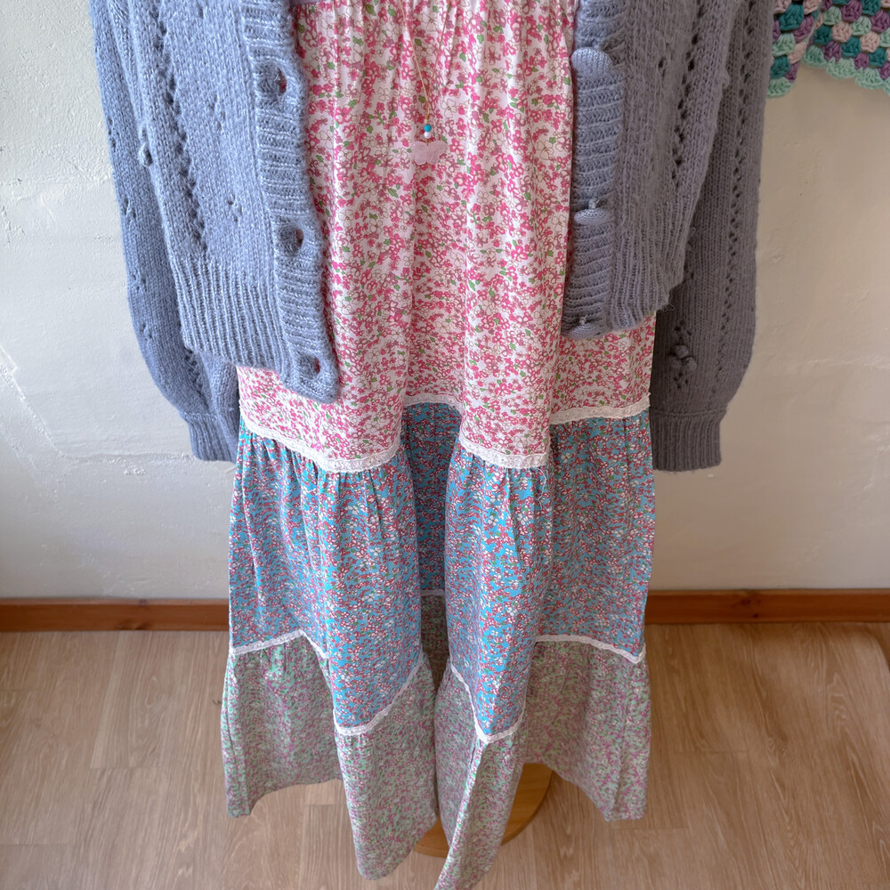 퍼플, 블루, 그린, 핑크 색감의 패치워크 끈원피스예요