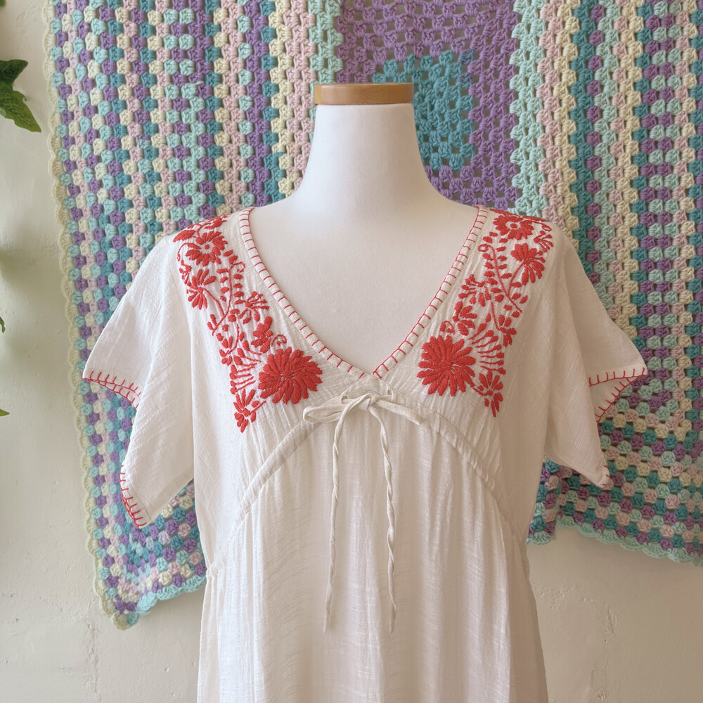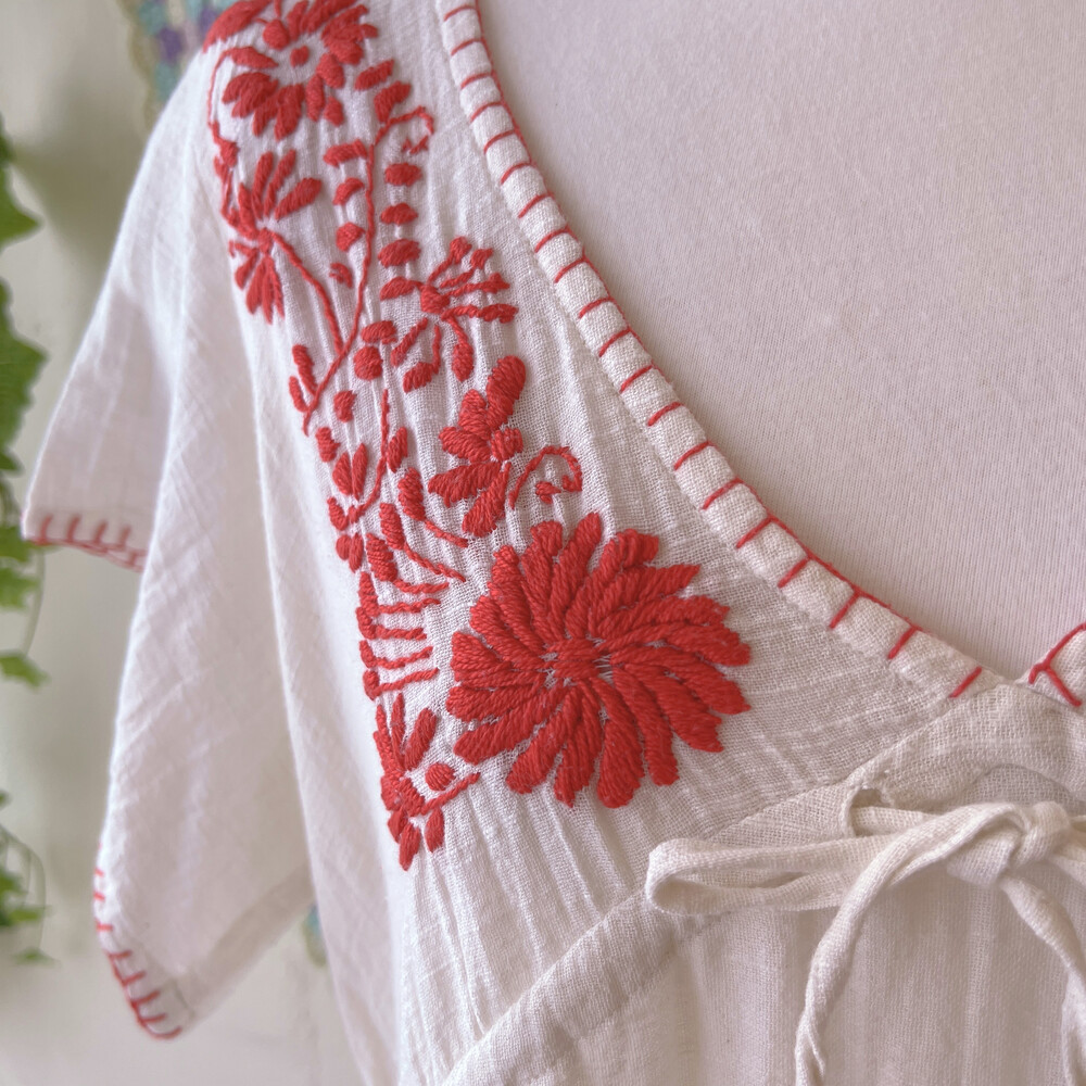 red flower embroidery v-neck ops