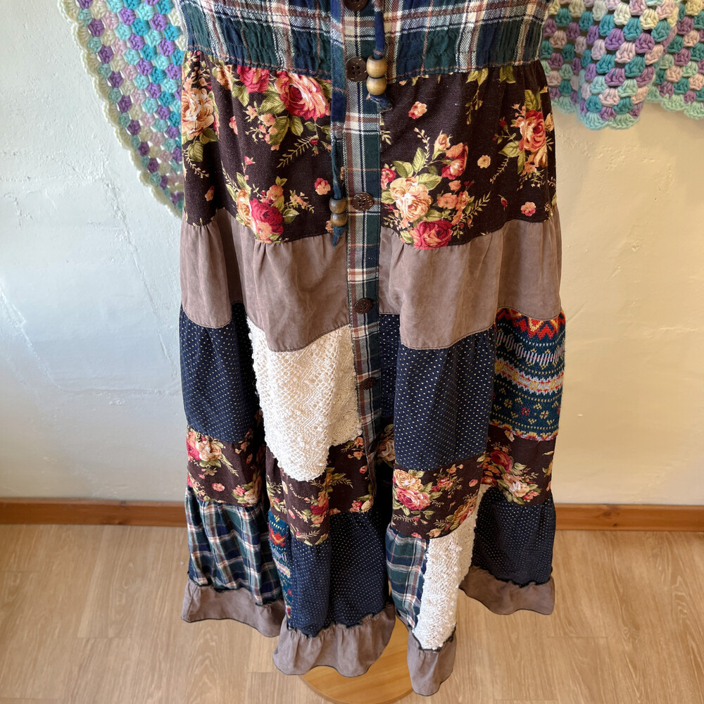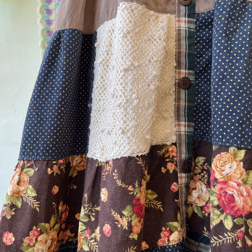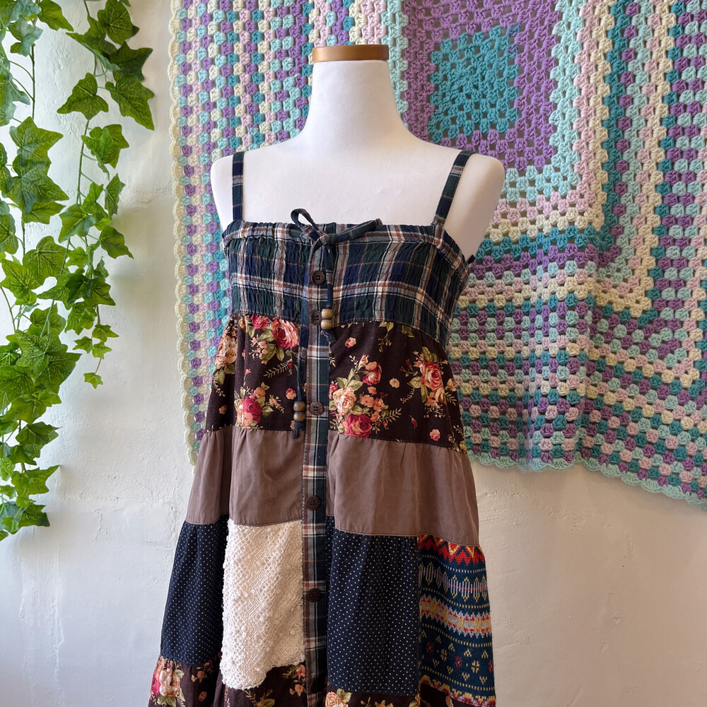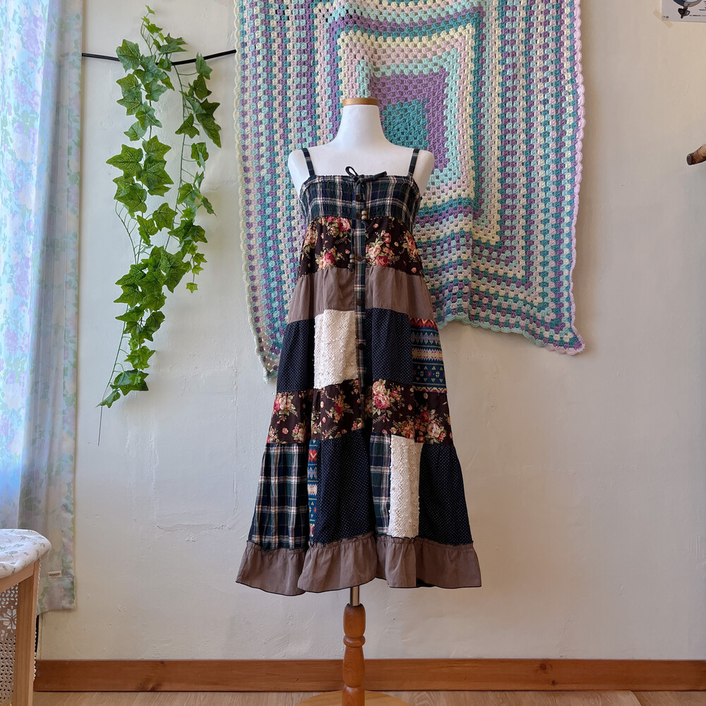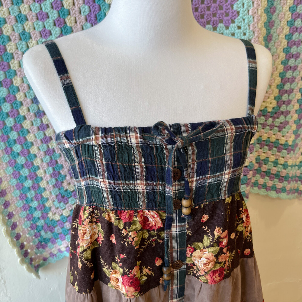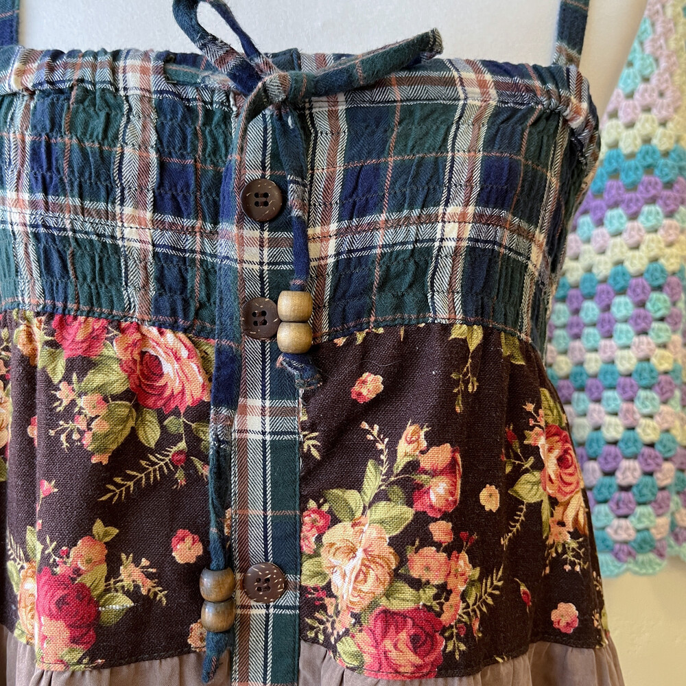그린 체크, 꽃무늬 패치 조합의 끈원피스예요