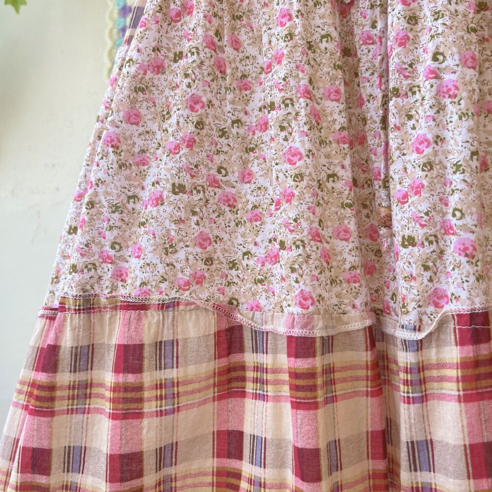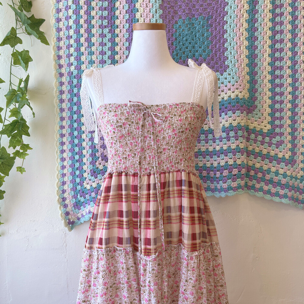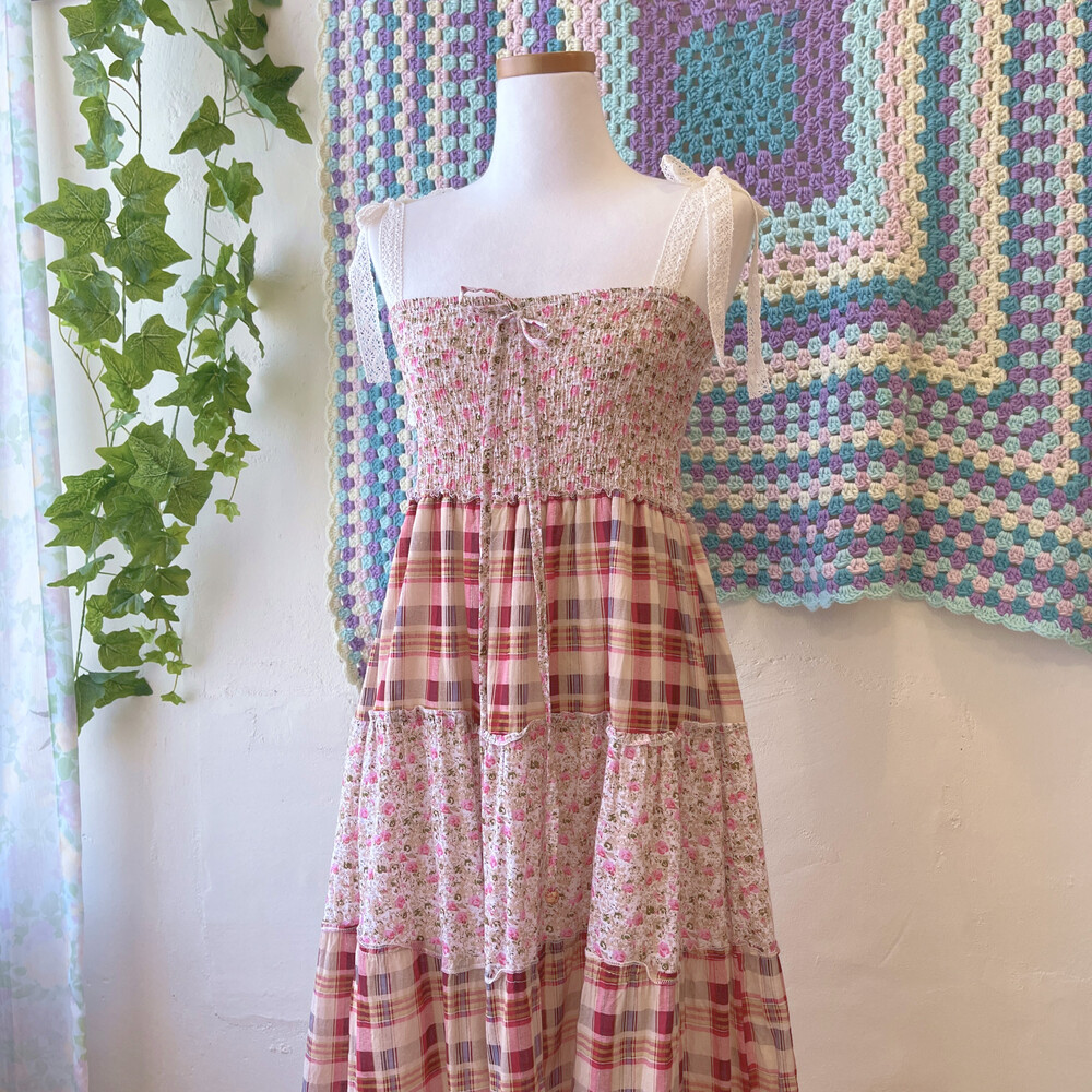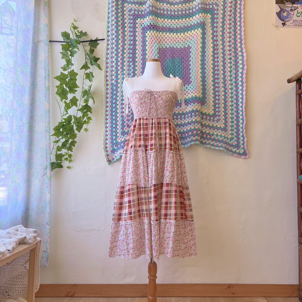 분홍 색감의 잔꽃과 체크 패치 조합의 끈원피스예요