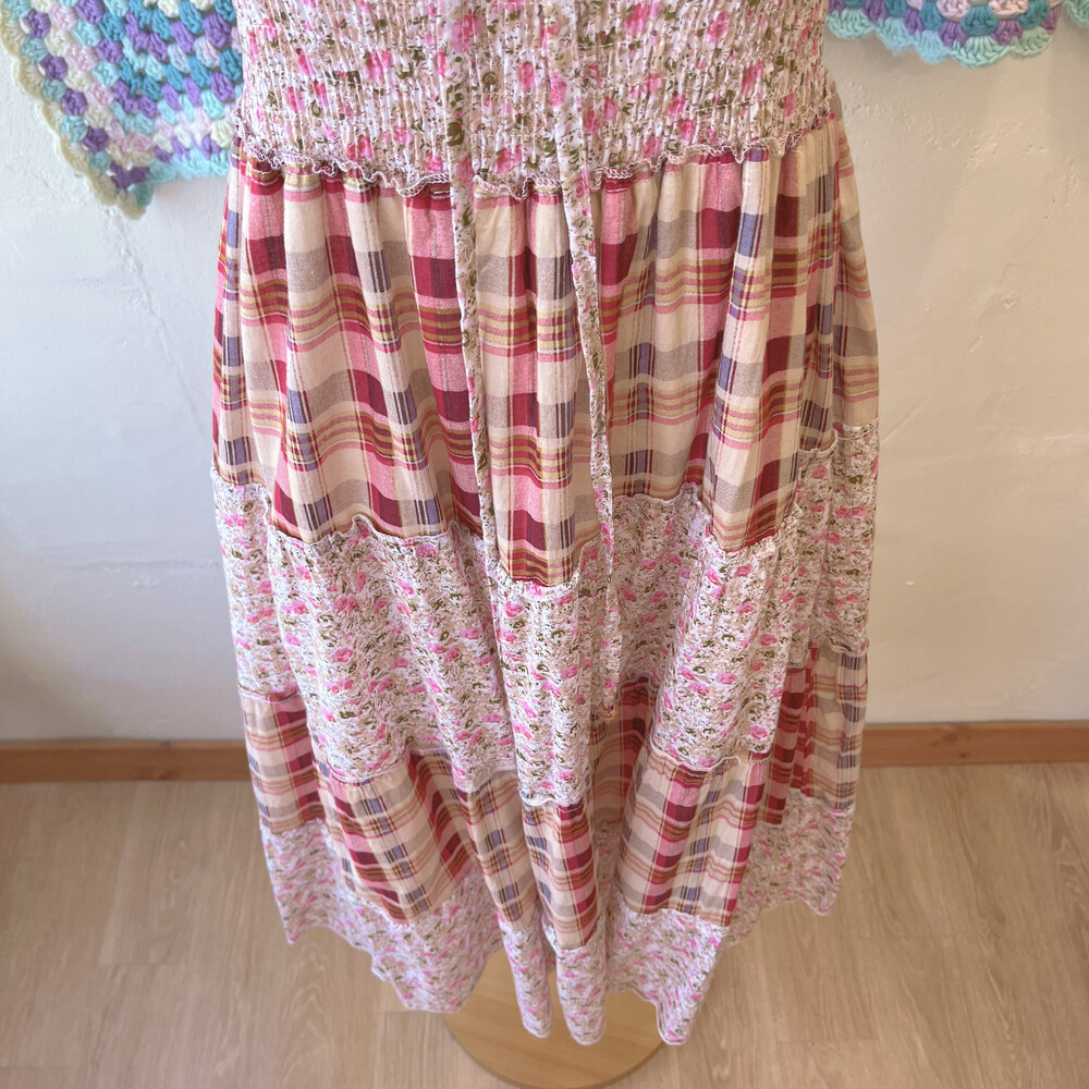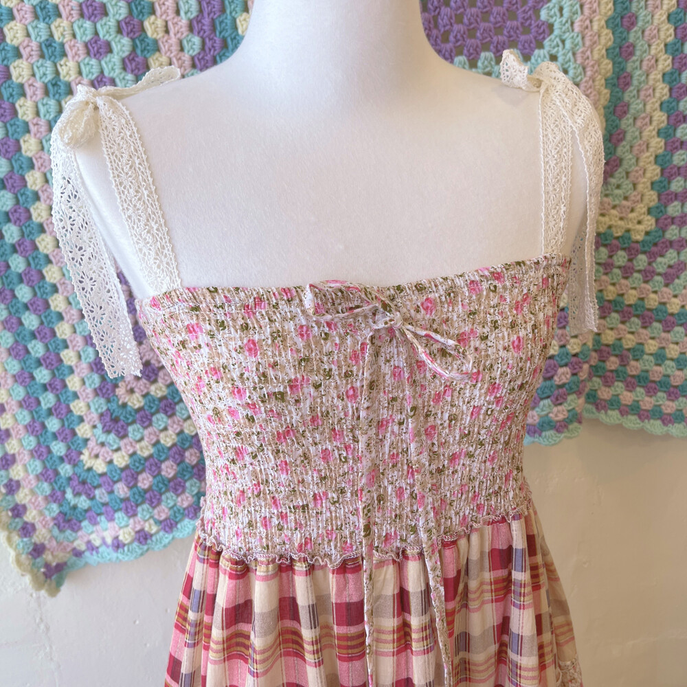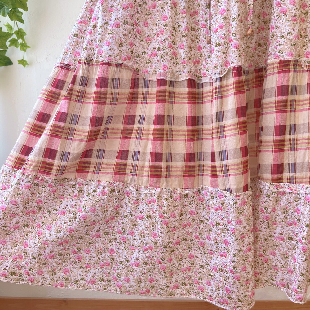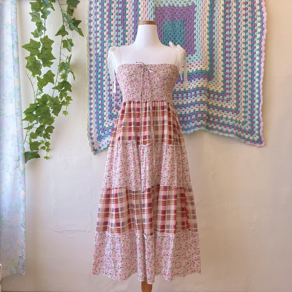 분홍 색감의 잔꽃과 체크 패치 조합의 끈원피스예요