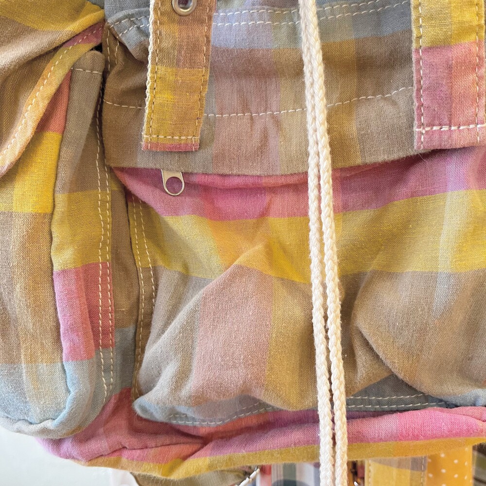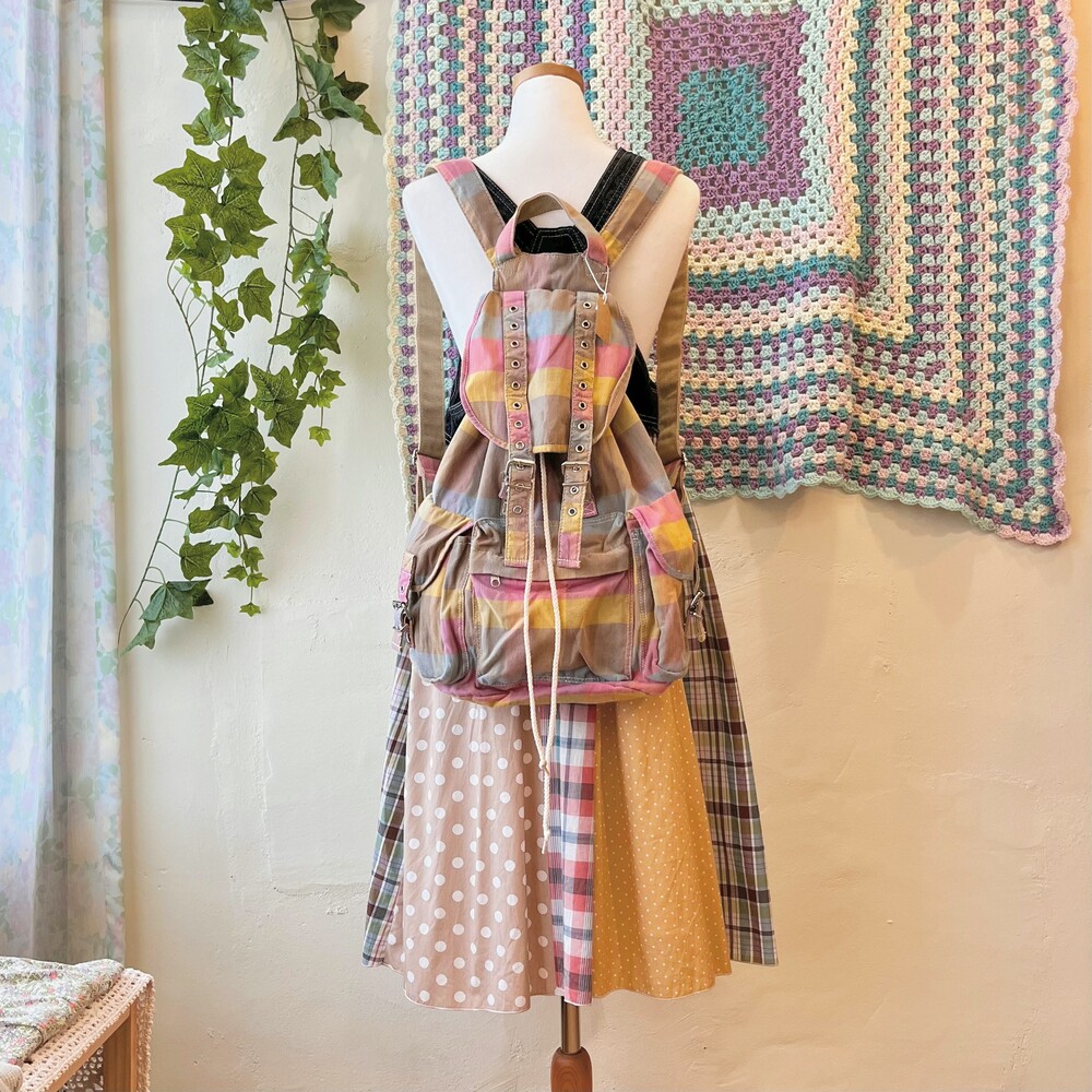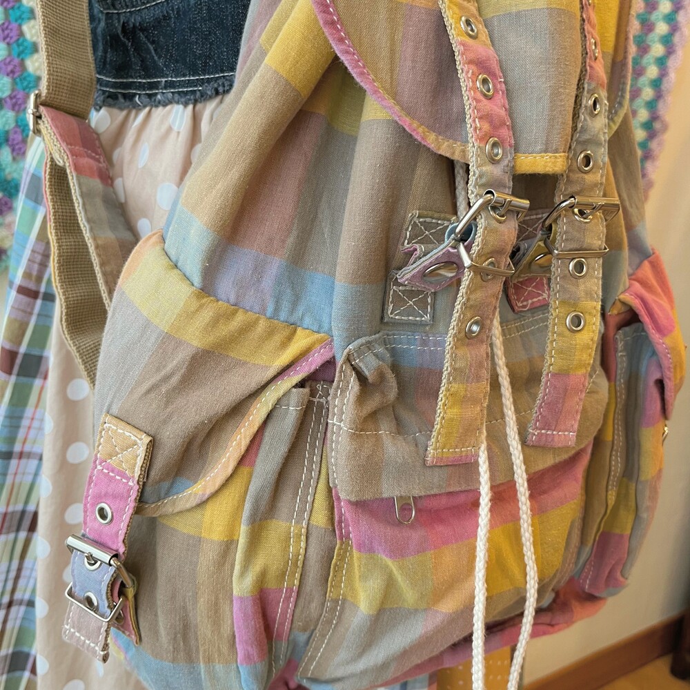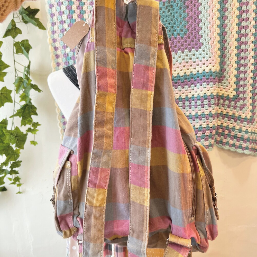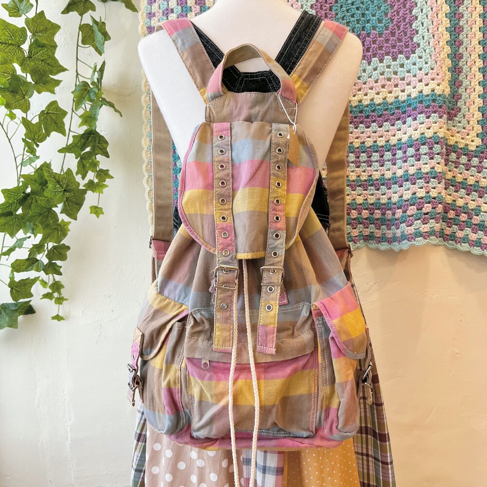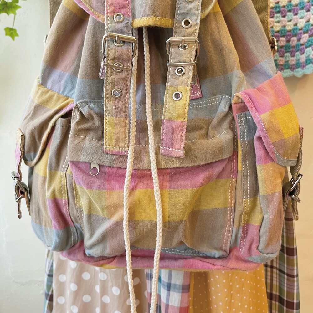 톤다운된 핑크, 카키, 블루 색감의 체크 백팩이에요