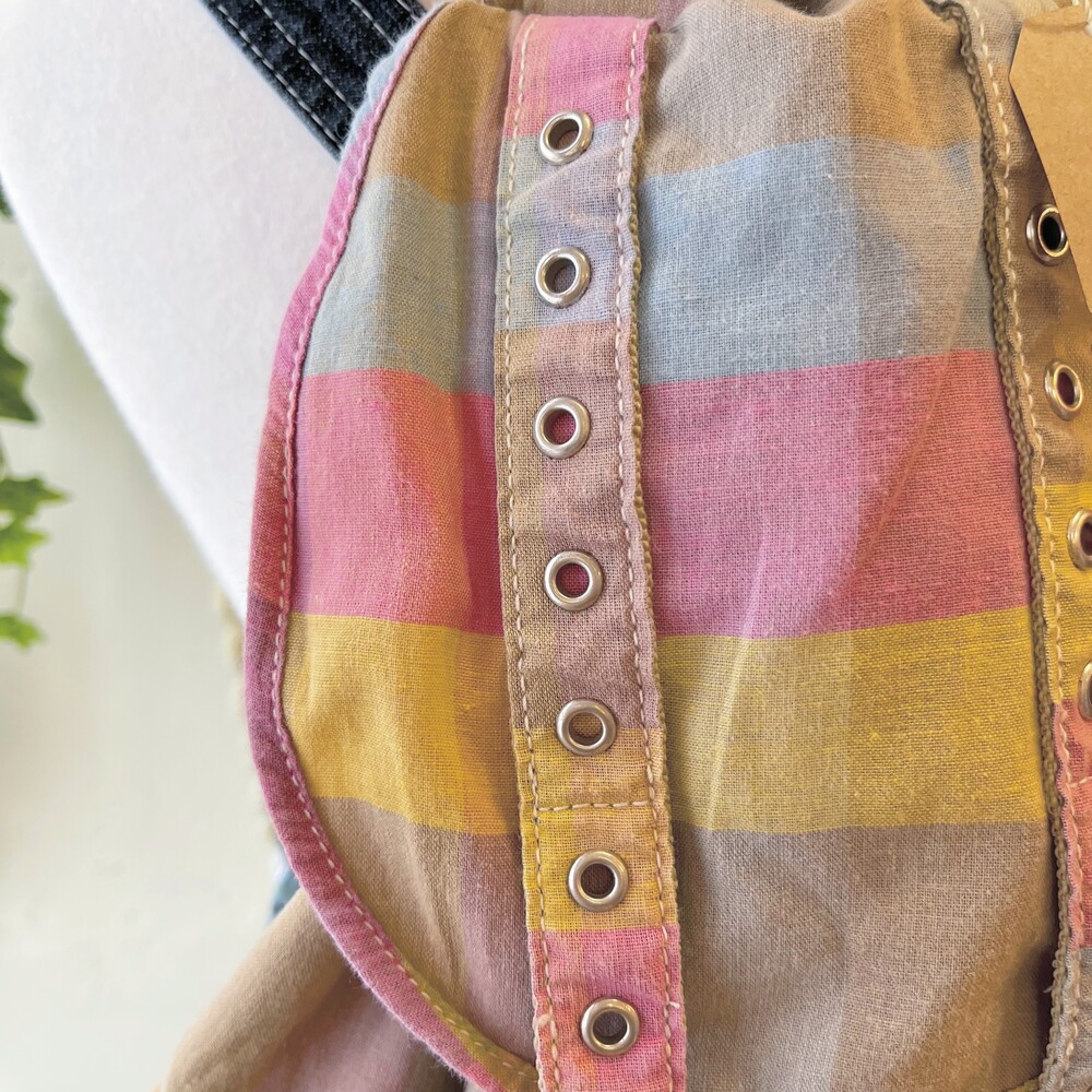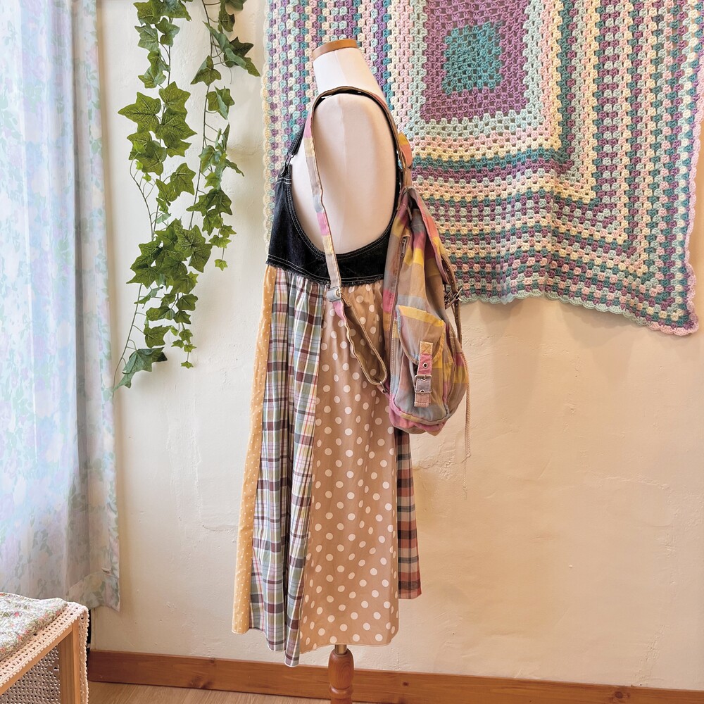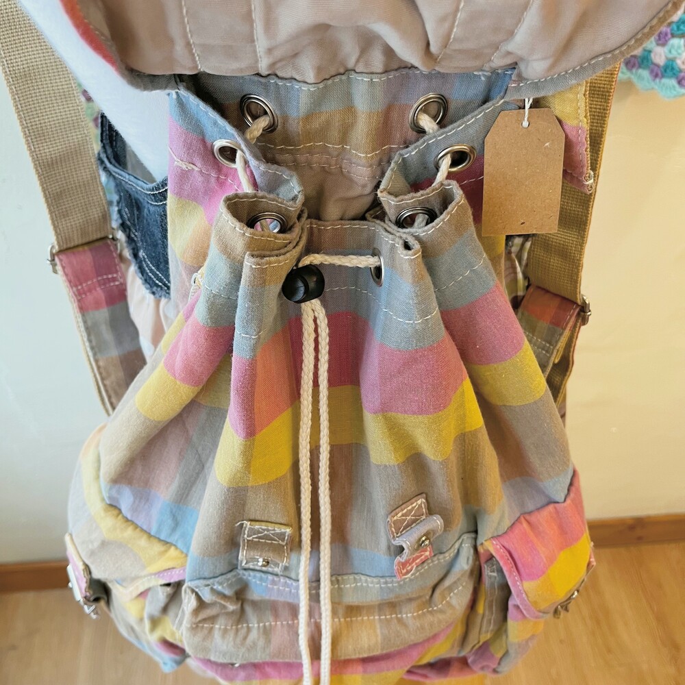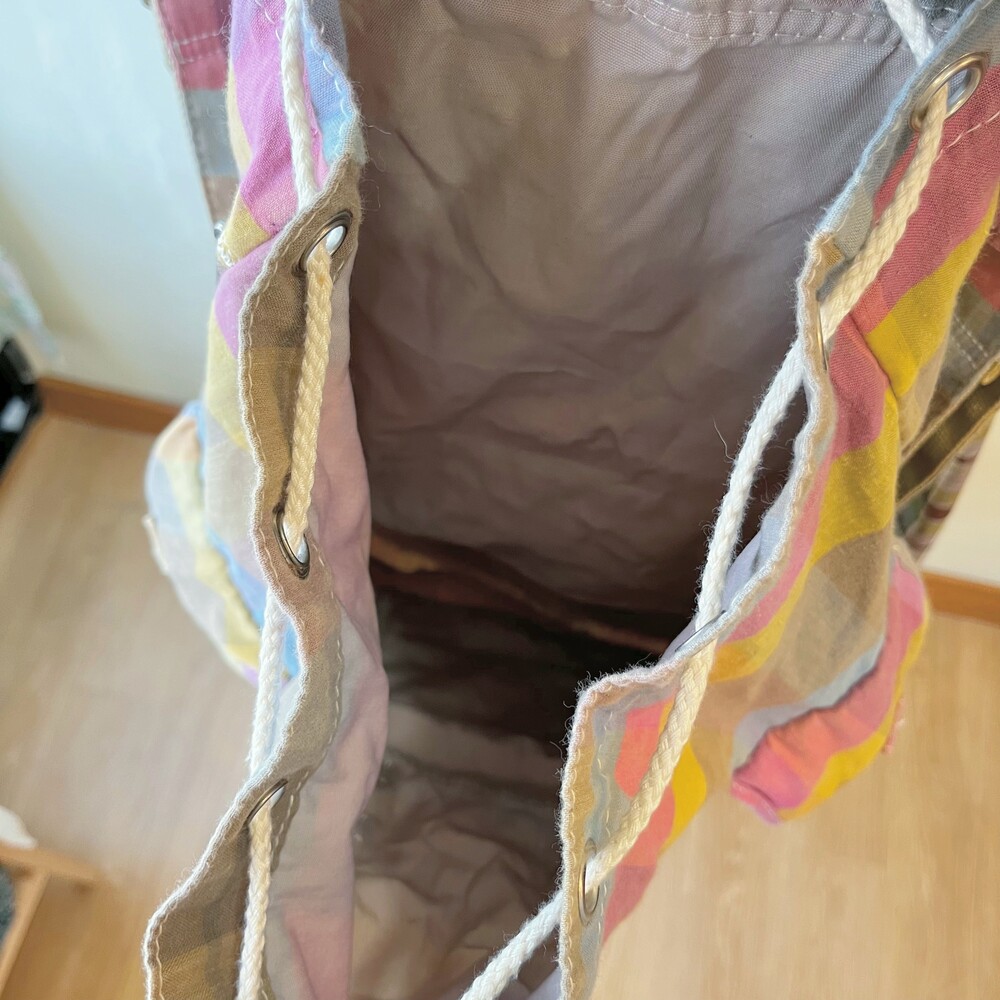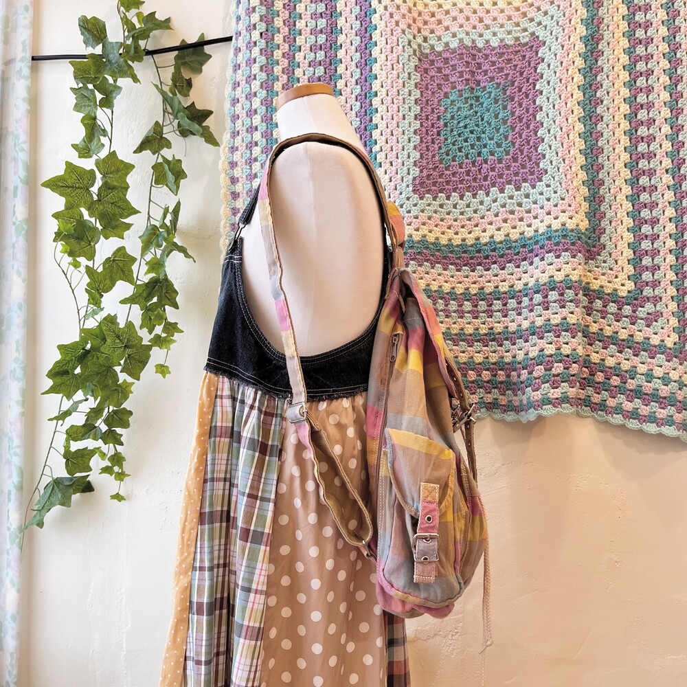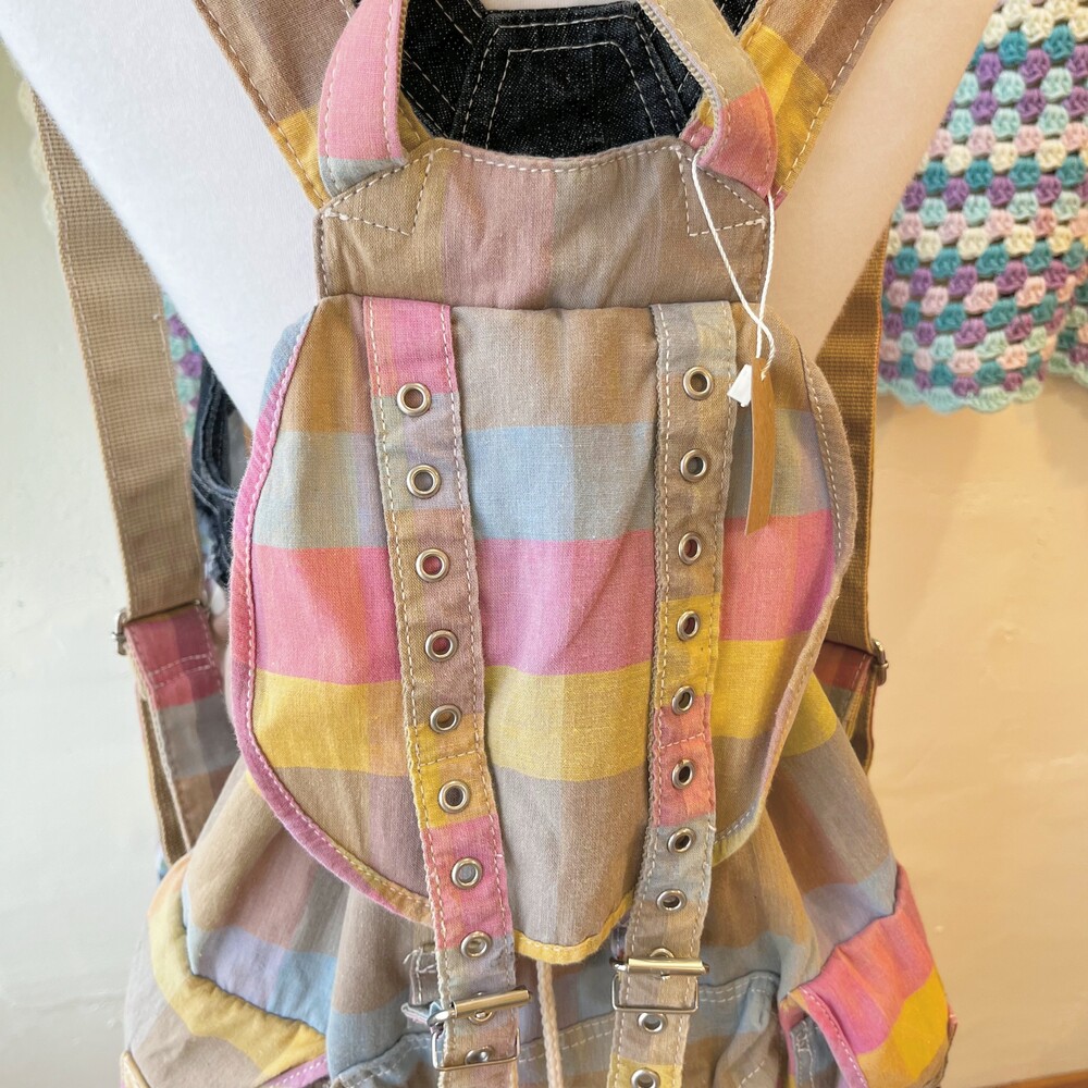 톤다운된 핑크, 카키, 블루 색감의 체크 백팩이에요
