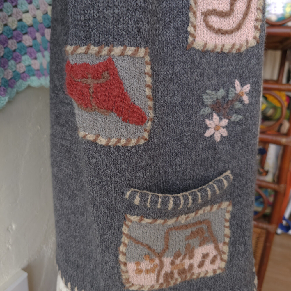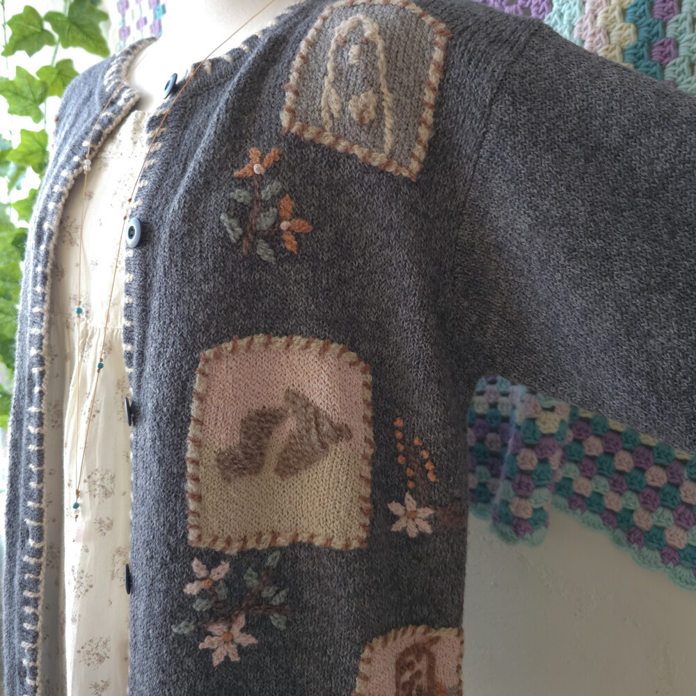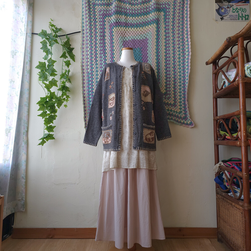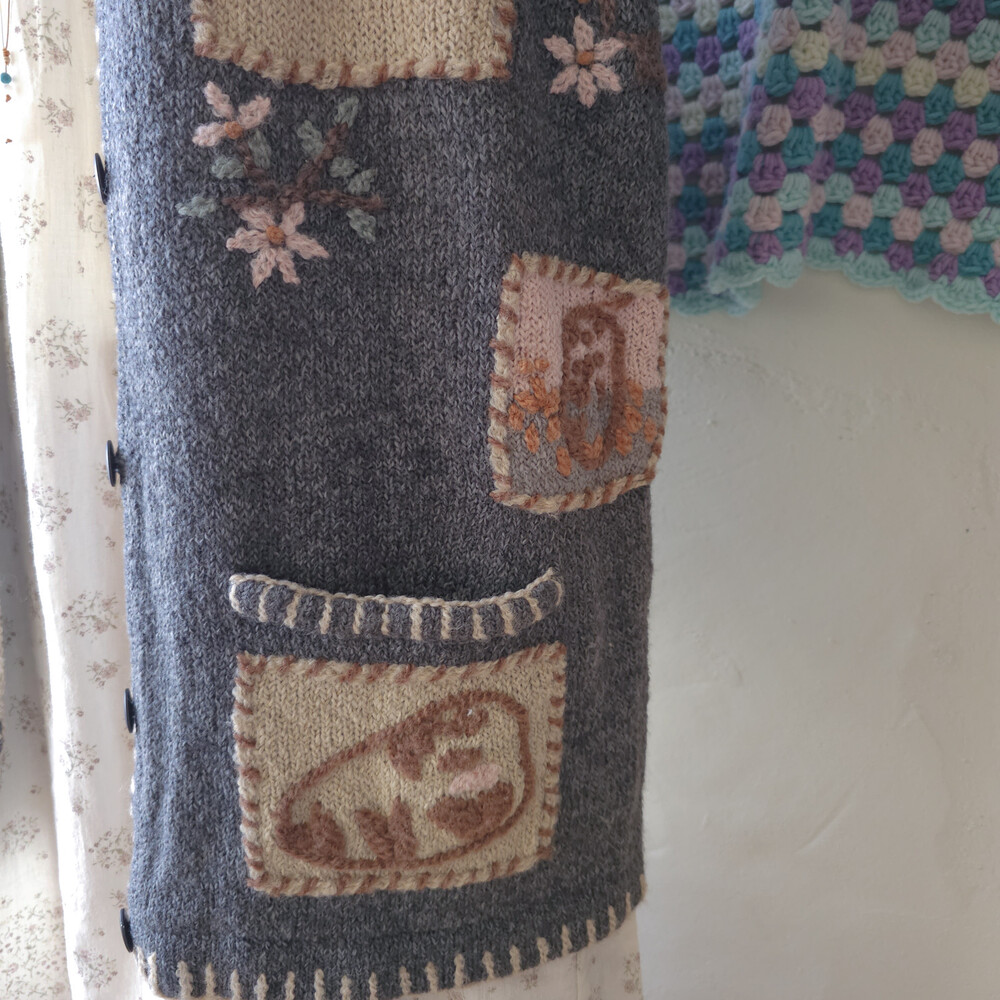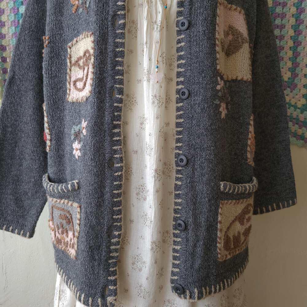 그레이 바탕에 자수가 가득한 포켓 가디건이에요