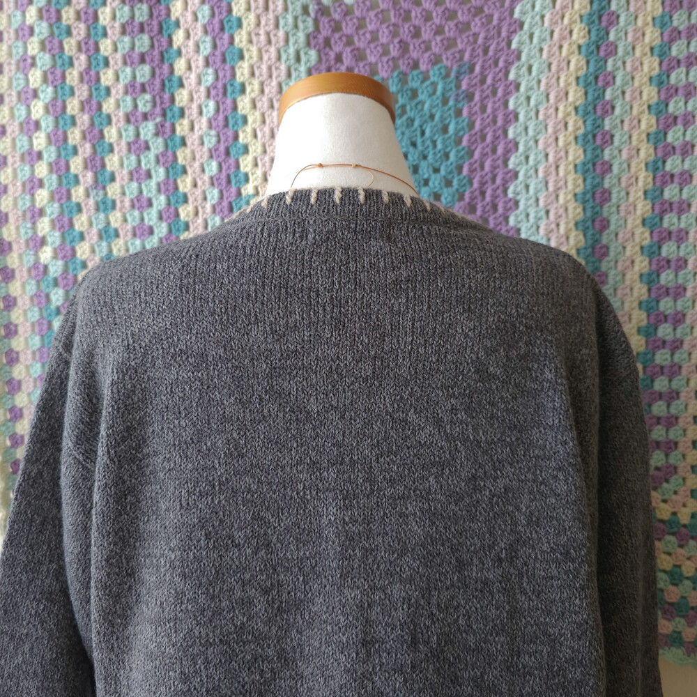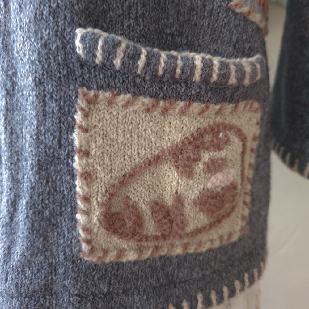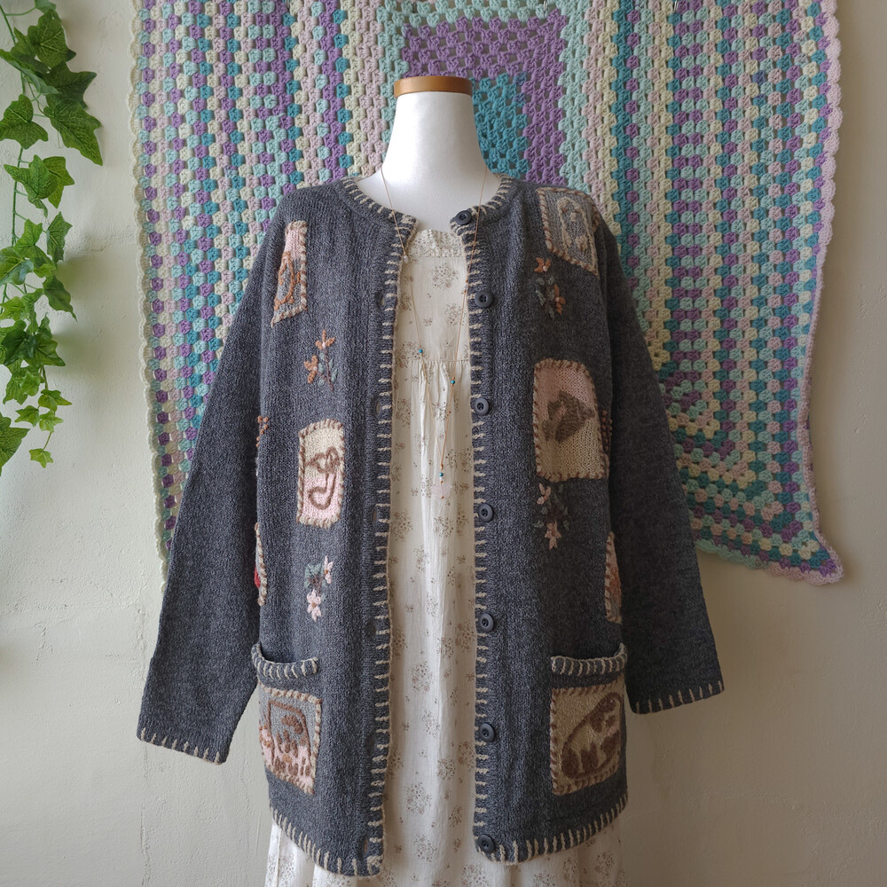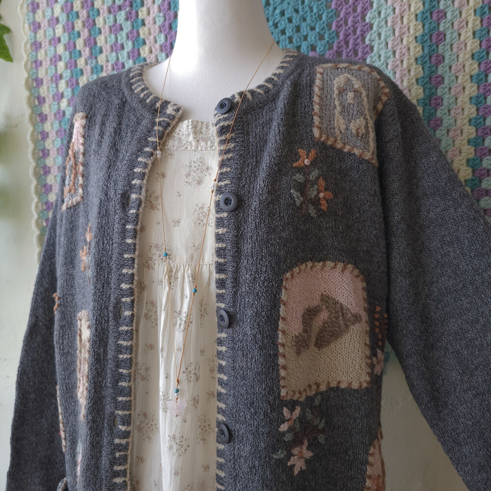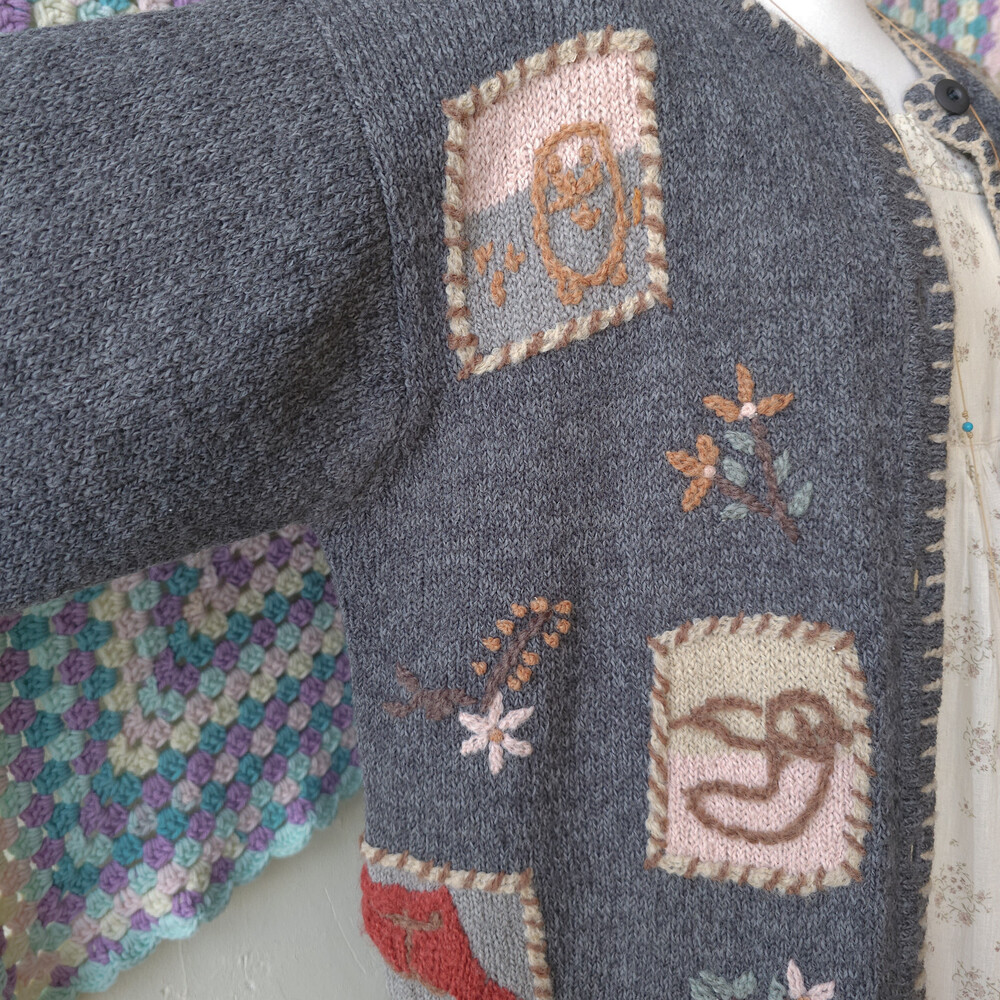 그레이 바탕에 자수가 가득한 포켓 가디건이에요