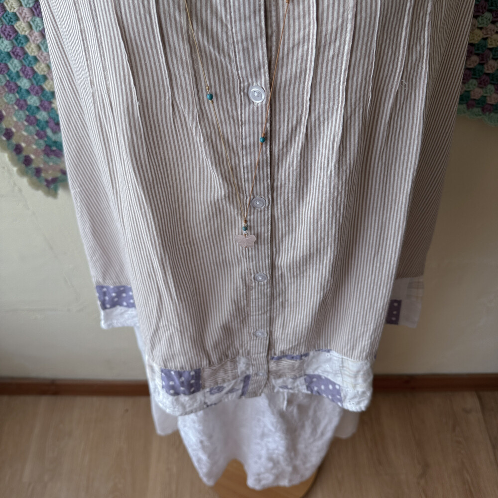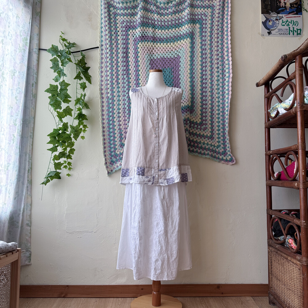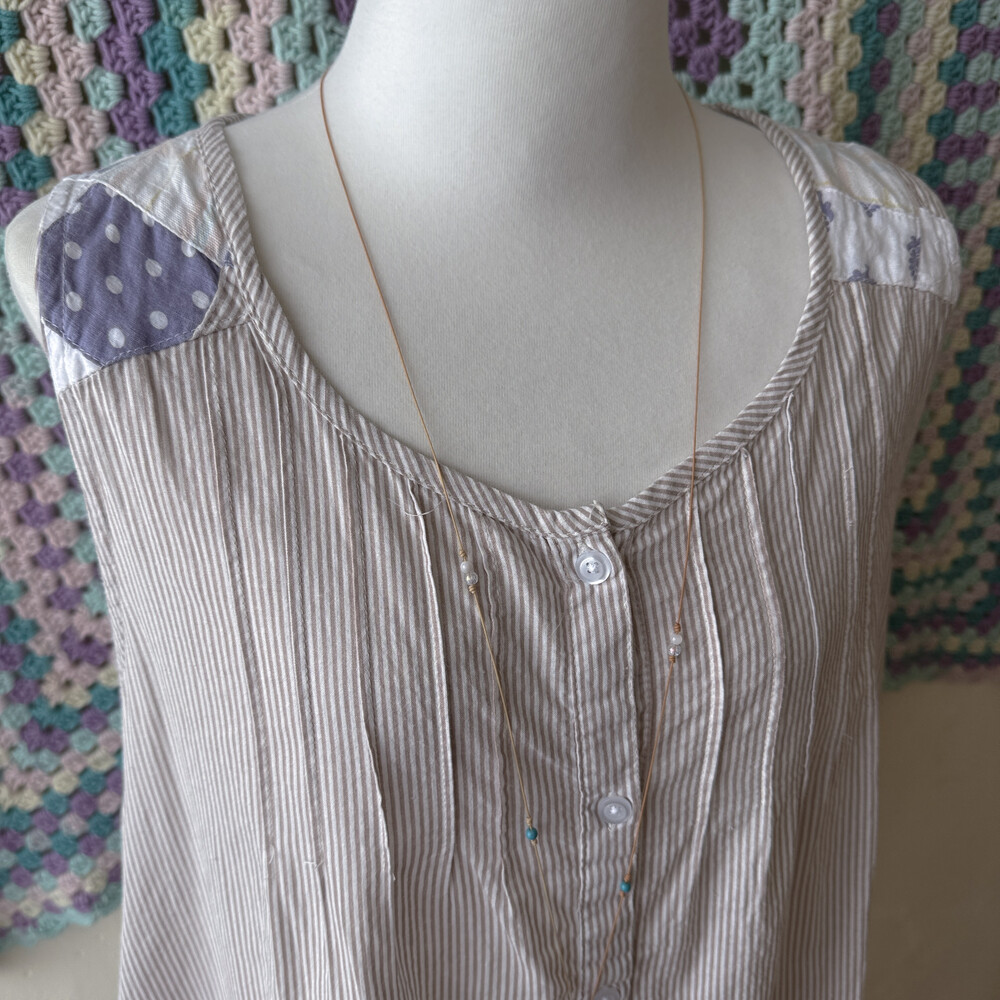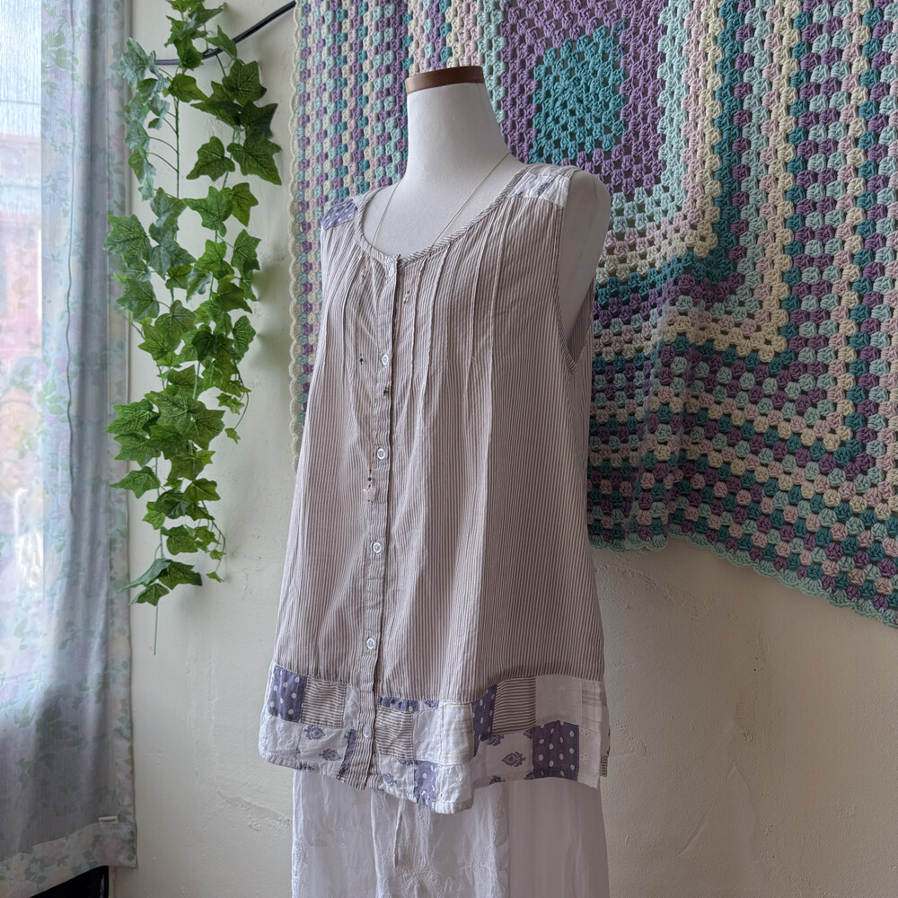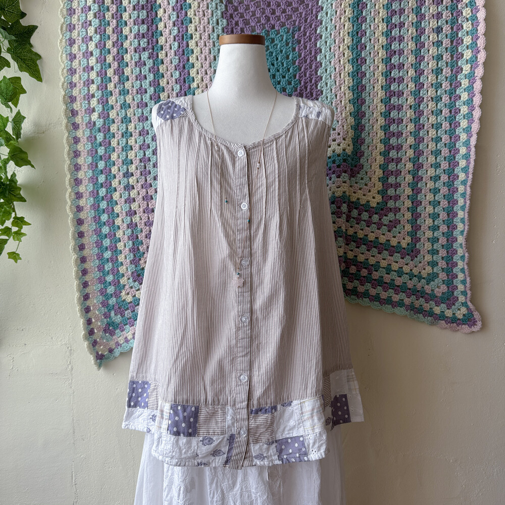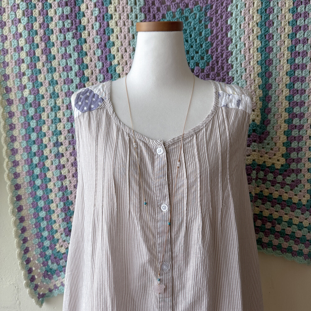 화이트 바탕에 베이지 세로 스트라이프 패턴의 민소매 블라우스예요