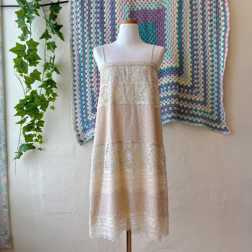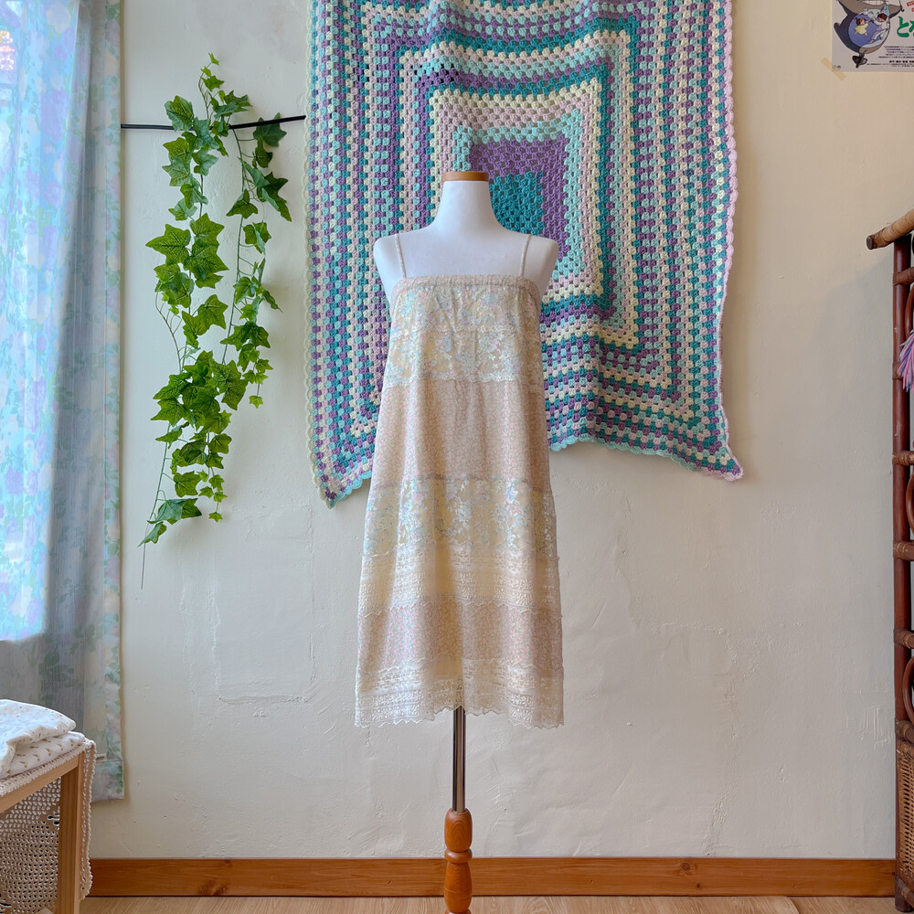 웜한 베이지 베이스의 패치워크 끈원피스예요