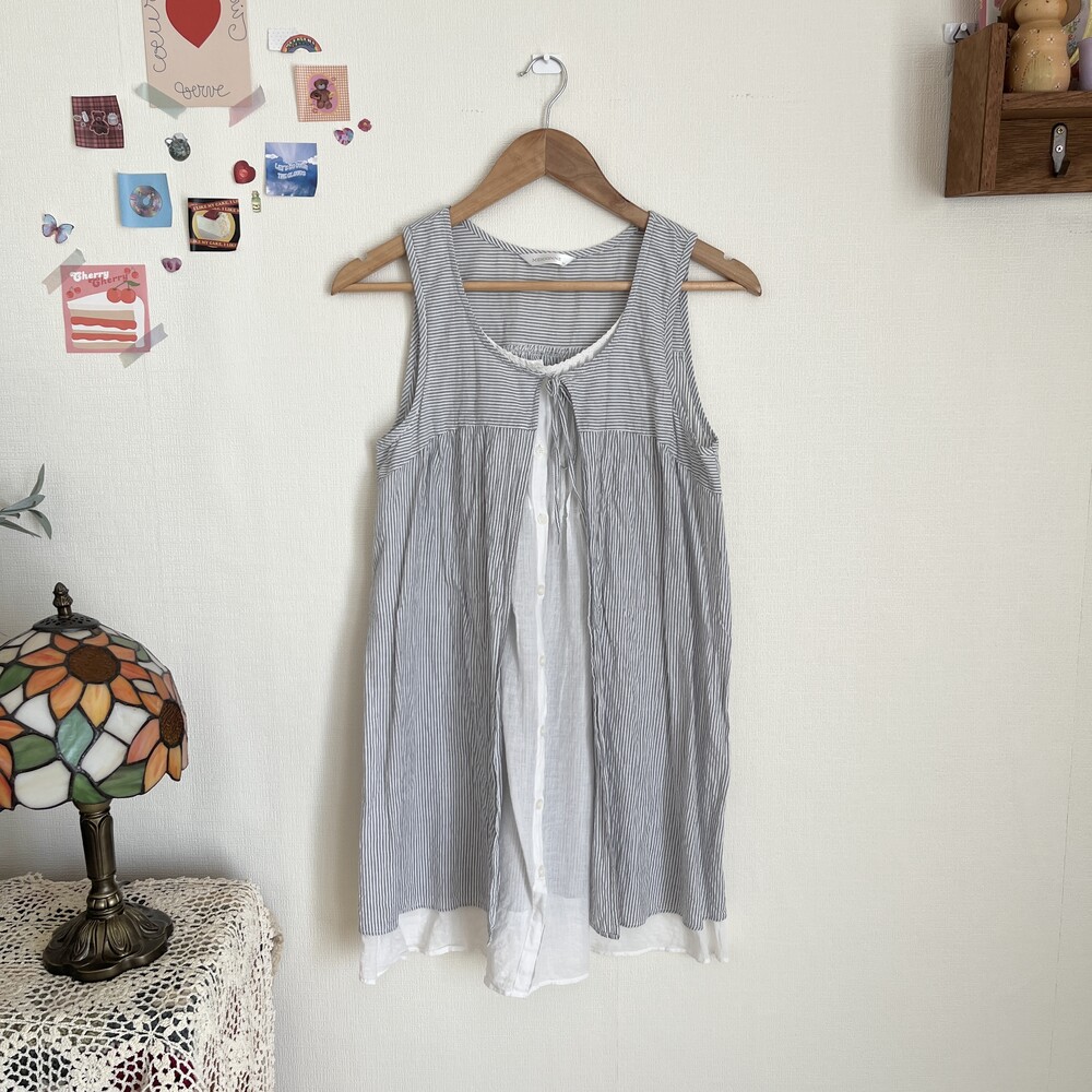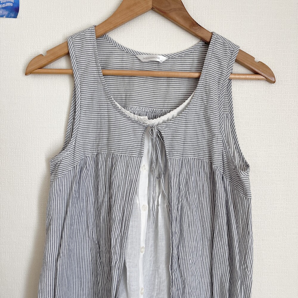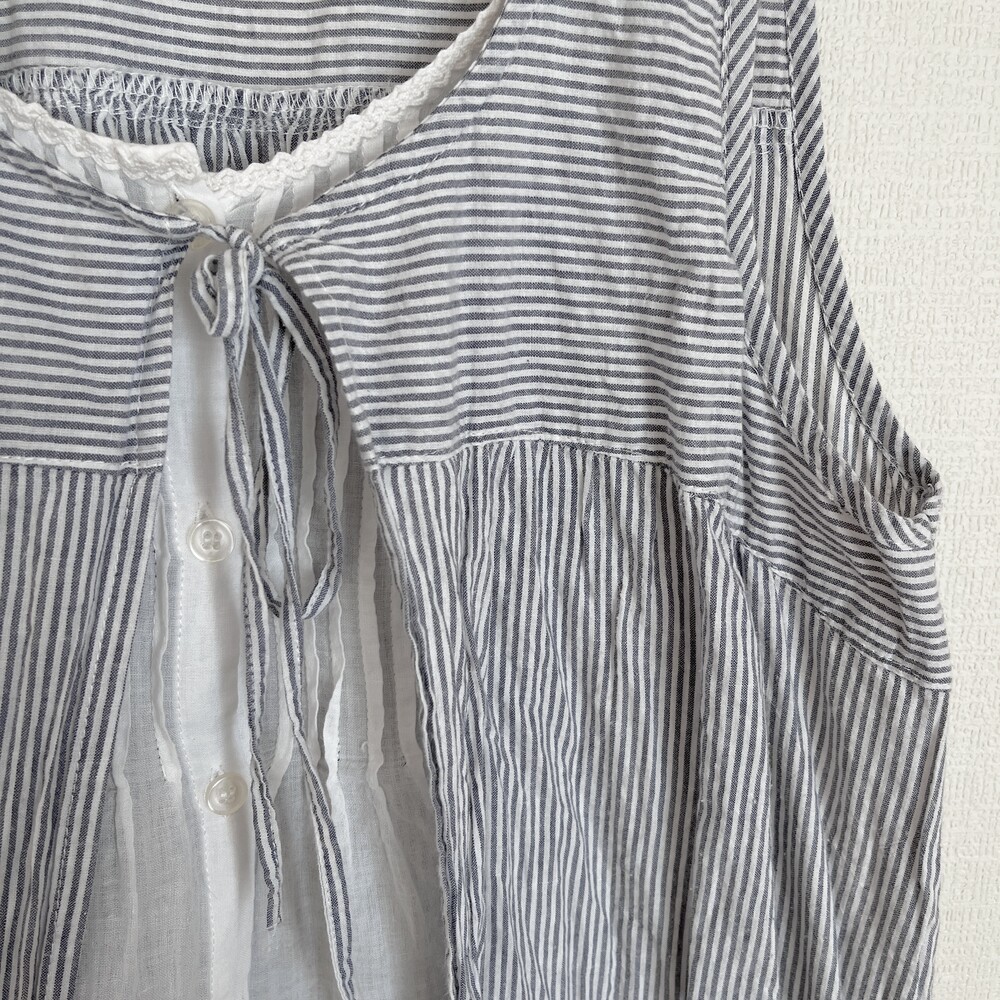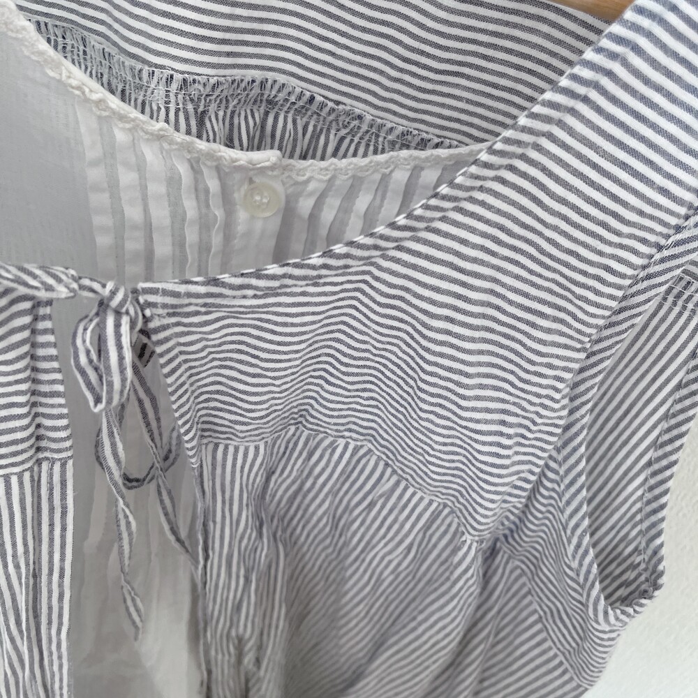 연블루 색감의 스트라이프 민소매 코튼 원피스예요