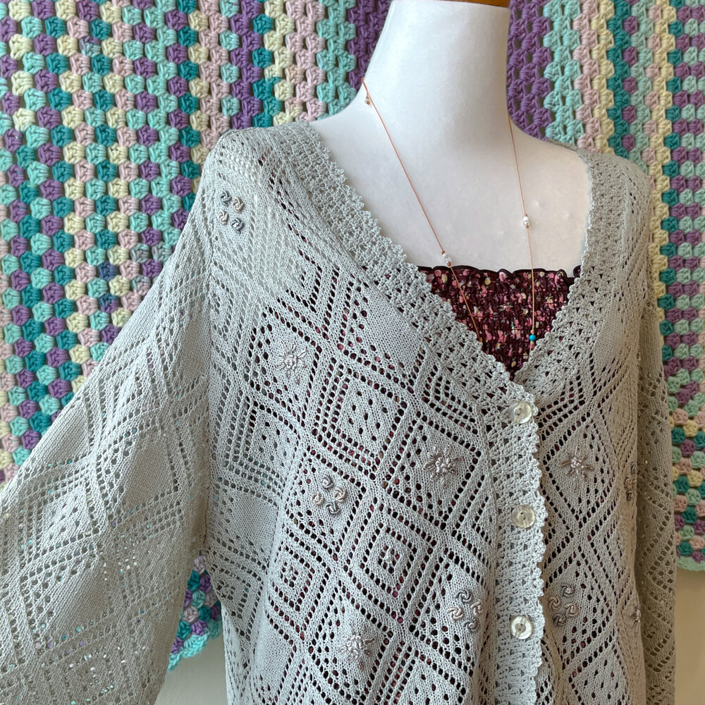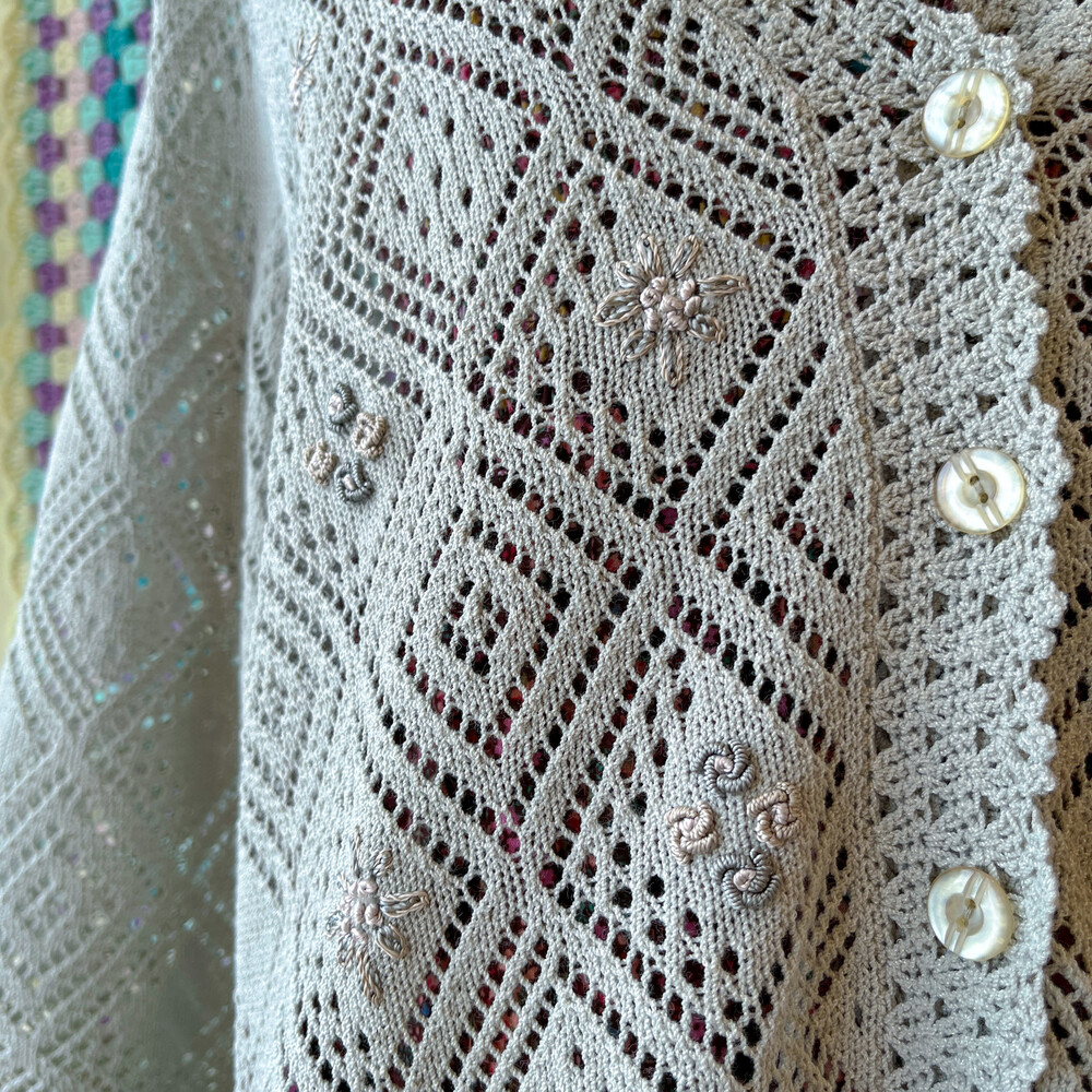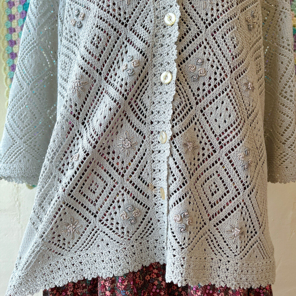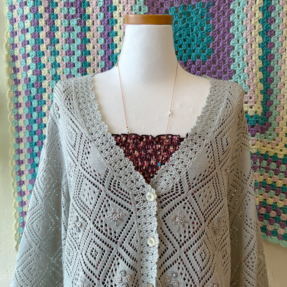 민트 그린 색감의 자수 크로셰 가디건이에요