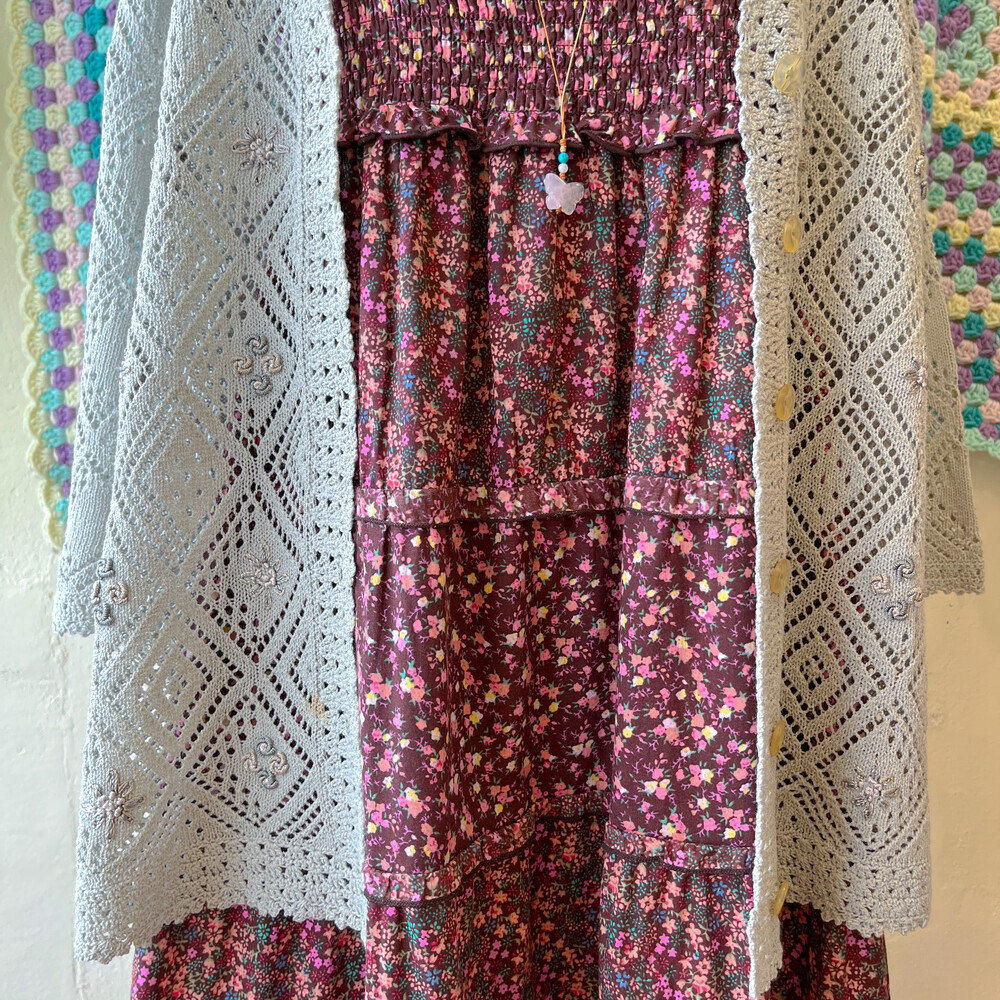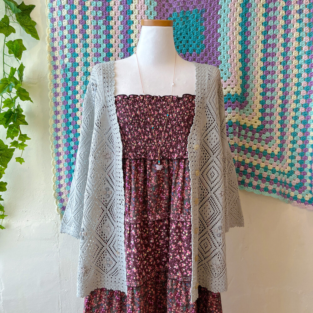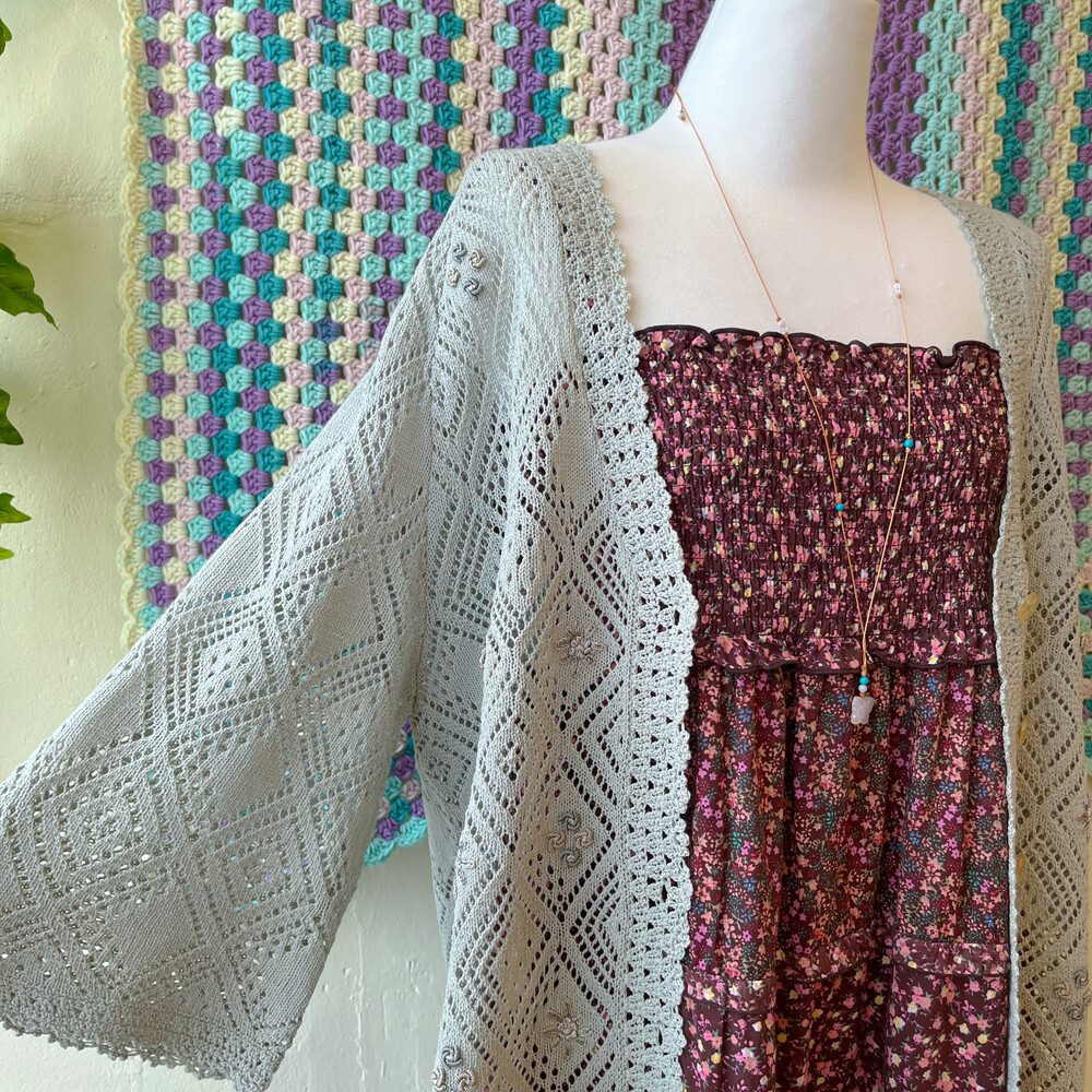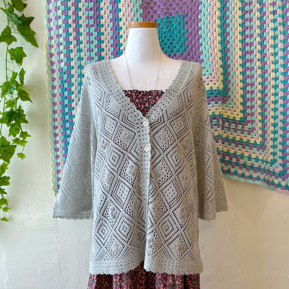 민트 그린 색감의 자수 크로셰 가디건이에요