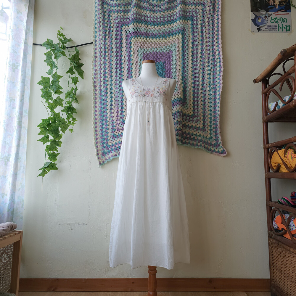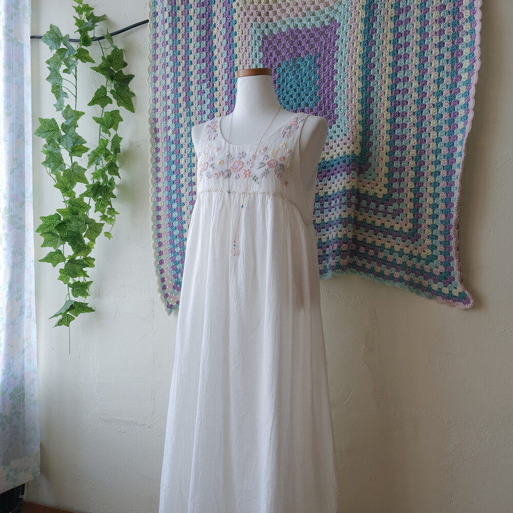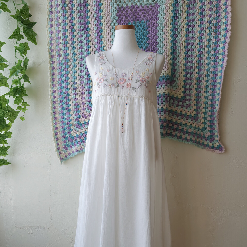 파스텔 자수 포인트의 민소매 롱원피스예요
