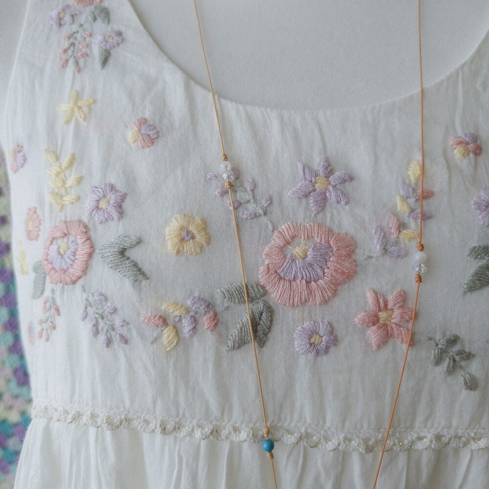 핑크, 퍼플, 버터레몬색 등의 자수가 조합된 사랑스러운 원피스랍니다