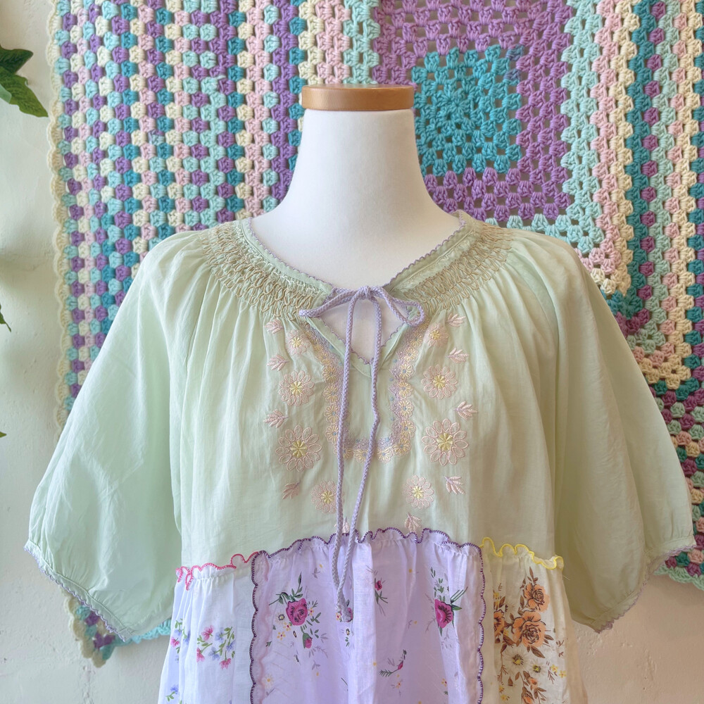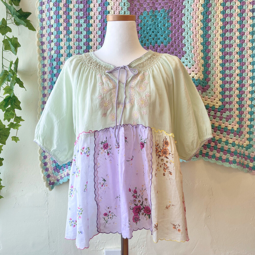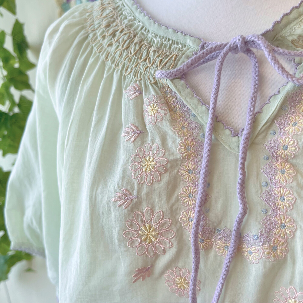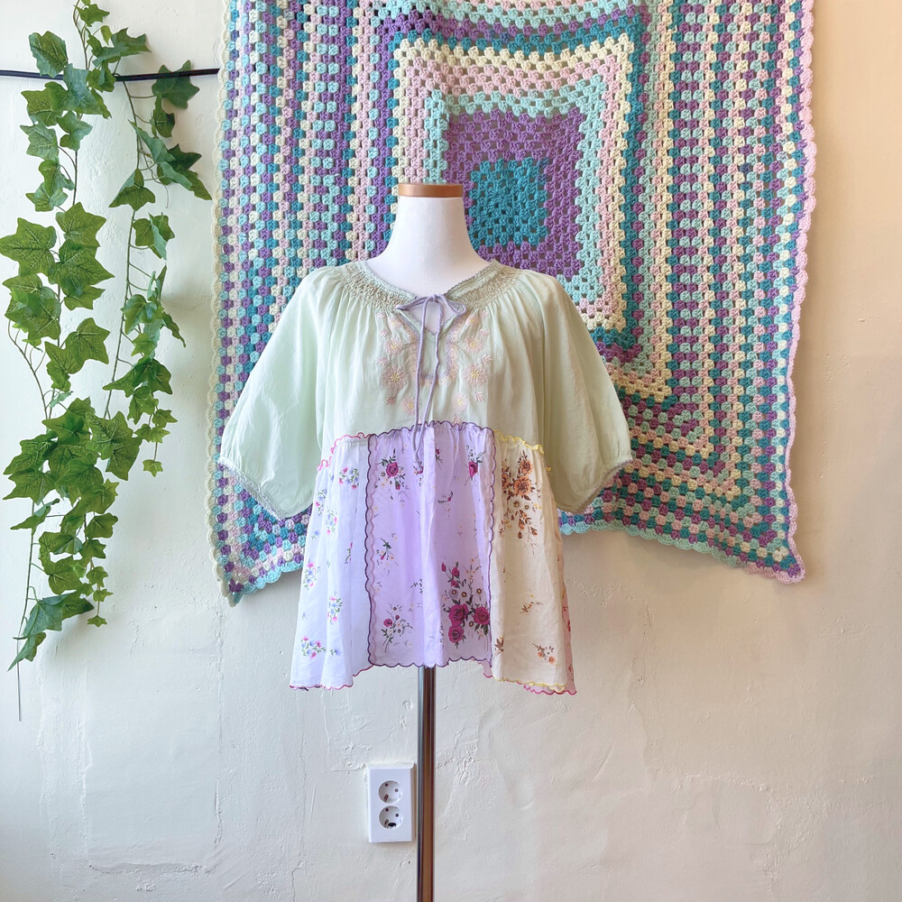 파스텔 색감의 자수+패치 블라우스예요