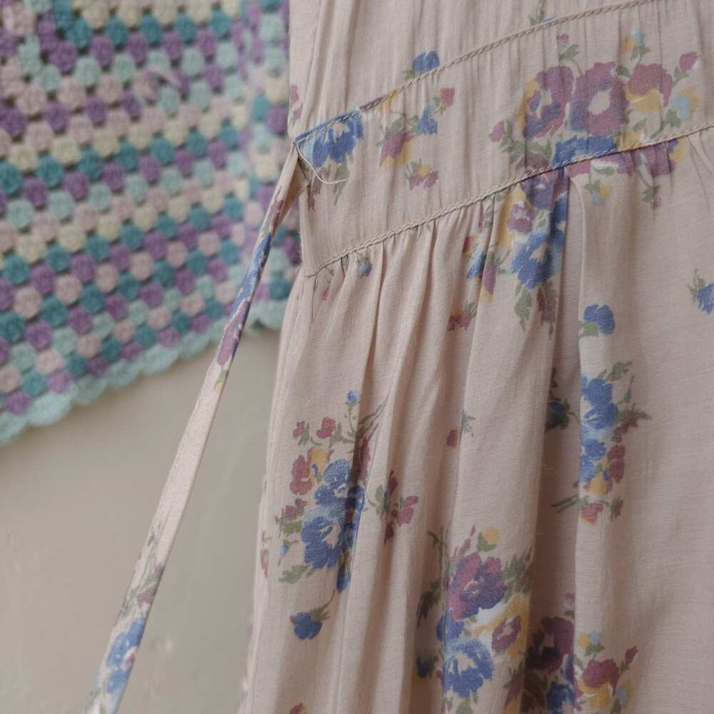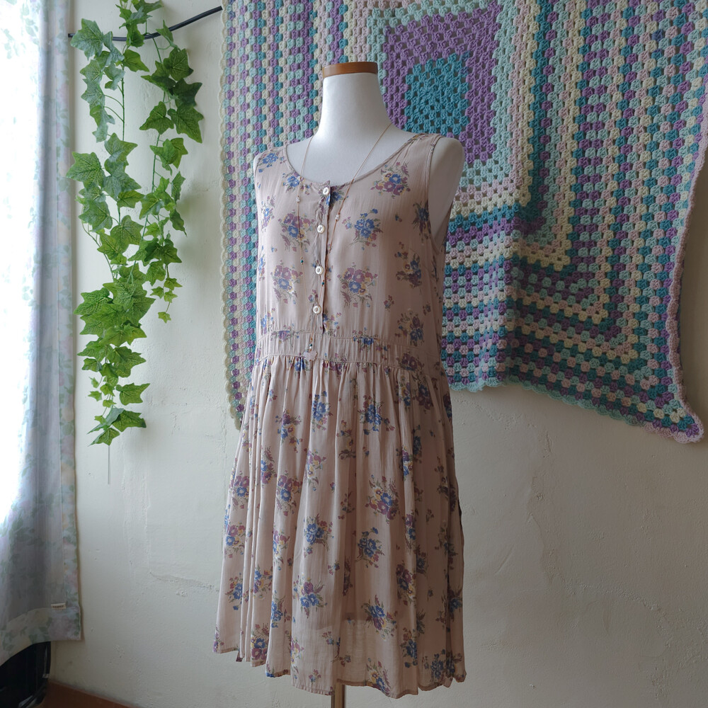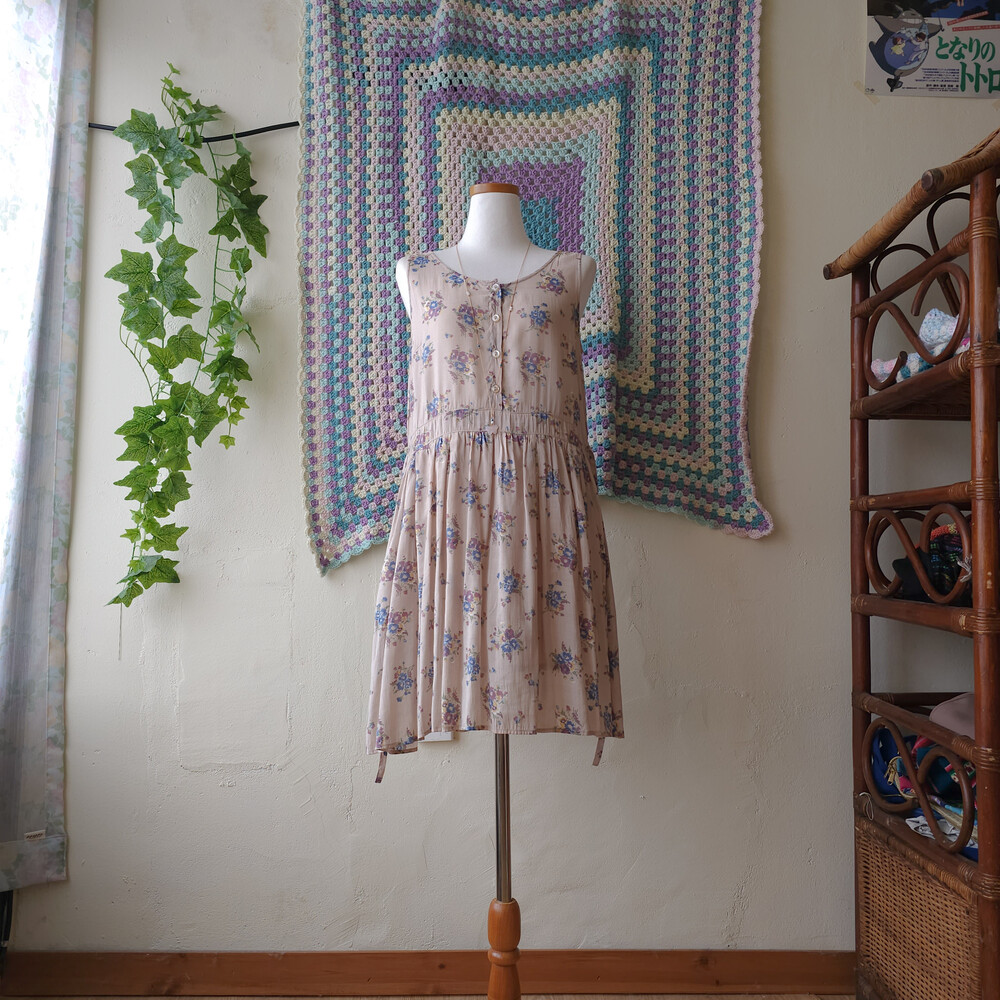 베이지 바탕에 꽃무늬 패턴이 들어간 민소매 원피스예요
