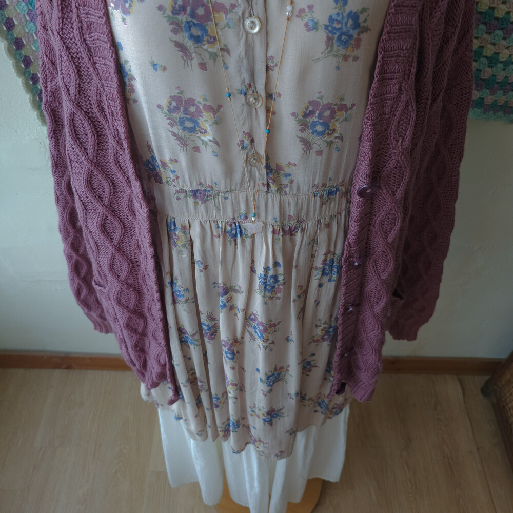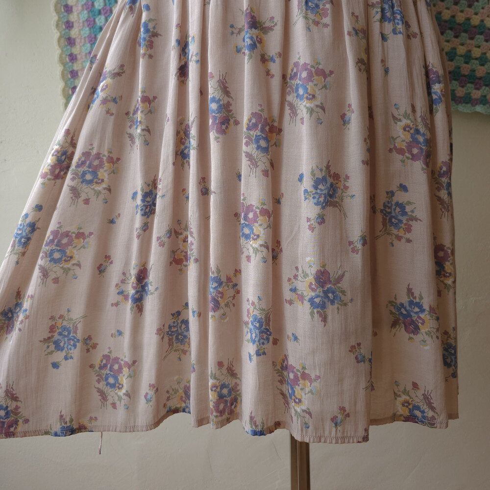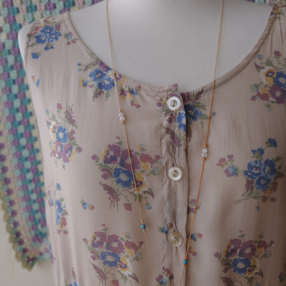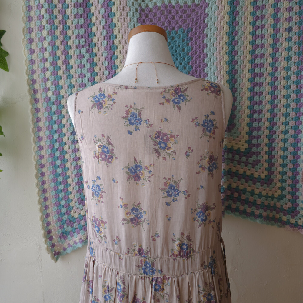 베이지 바탕에 꽃무늬 패턴이 들어간 민소매 원피스예요