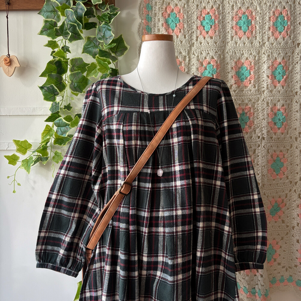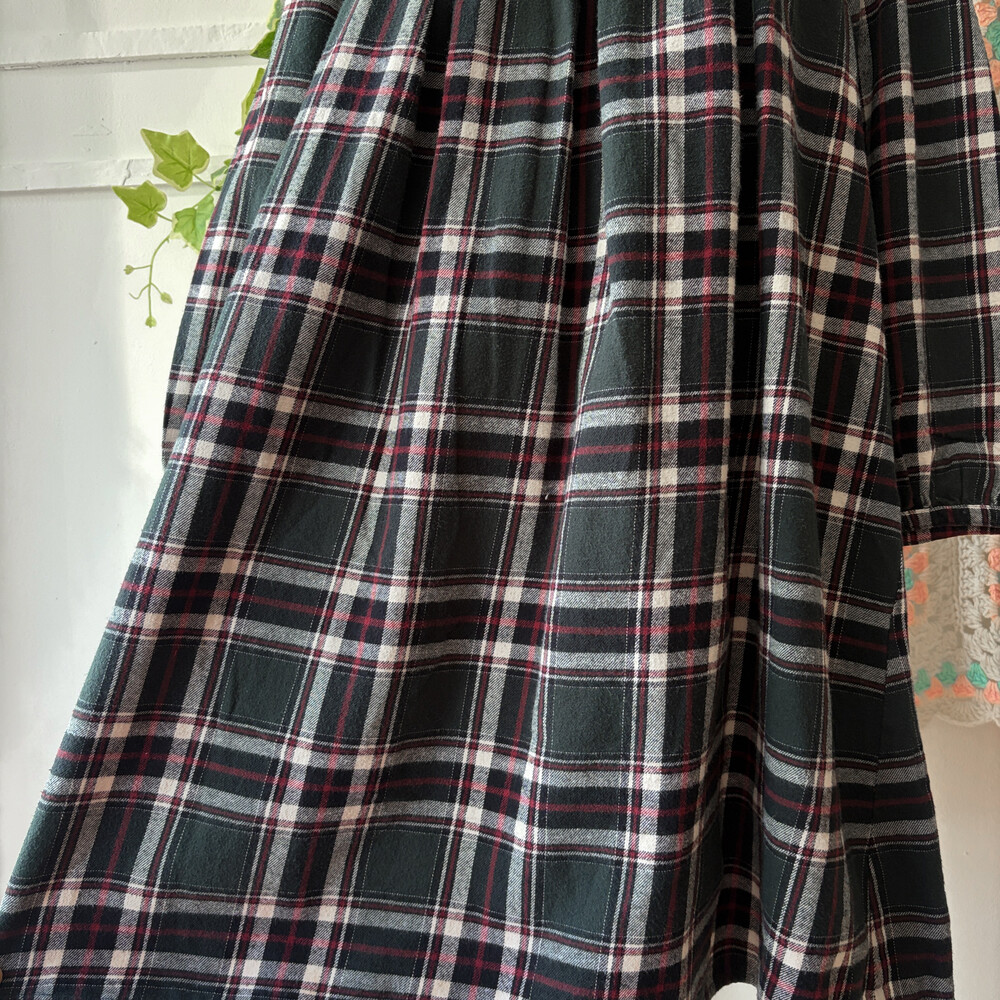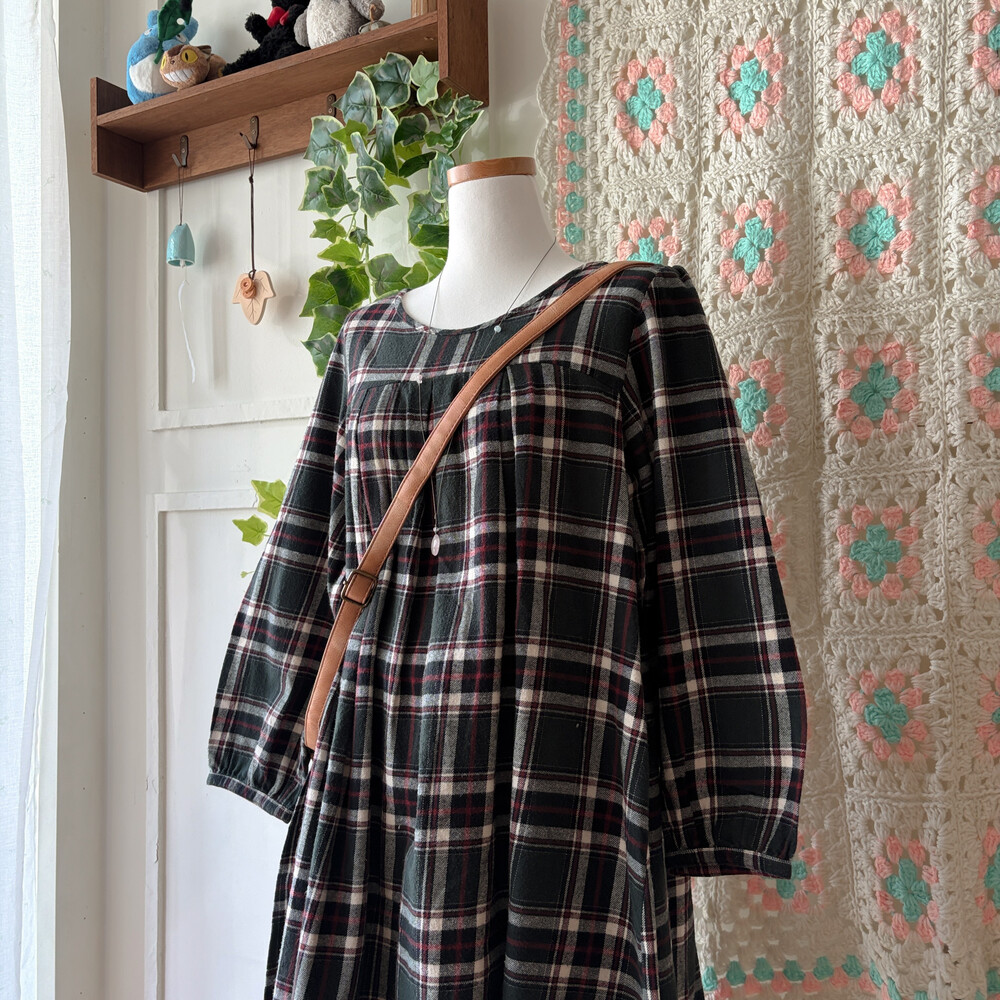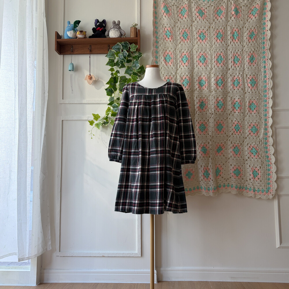 그린 색감의 체크 라운드넥 원피스예요