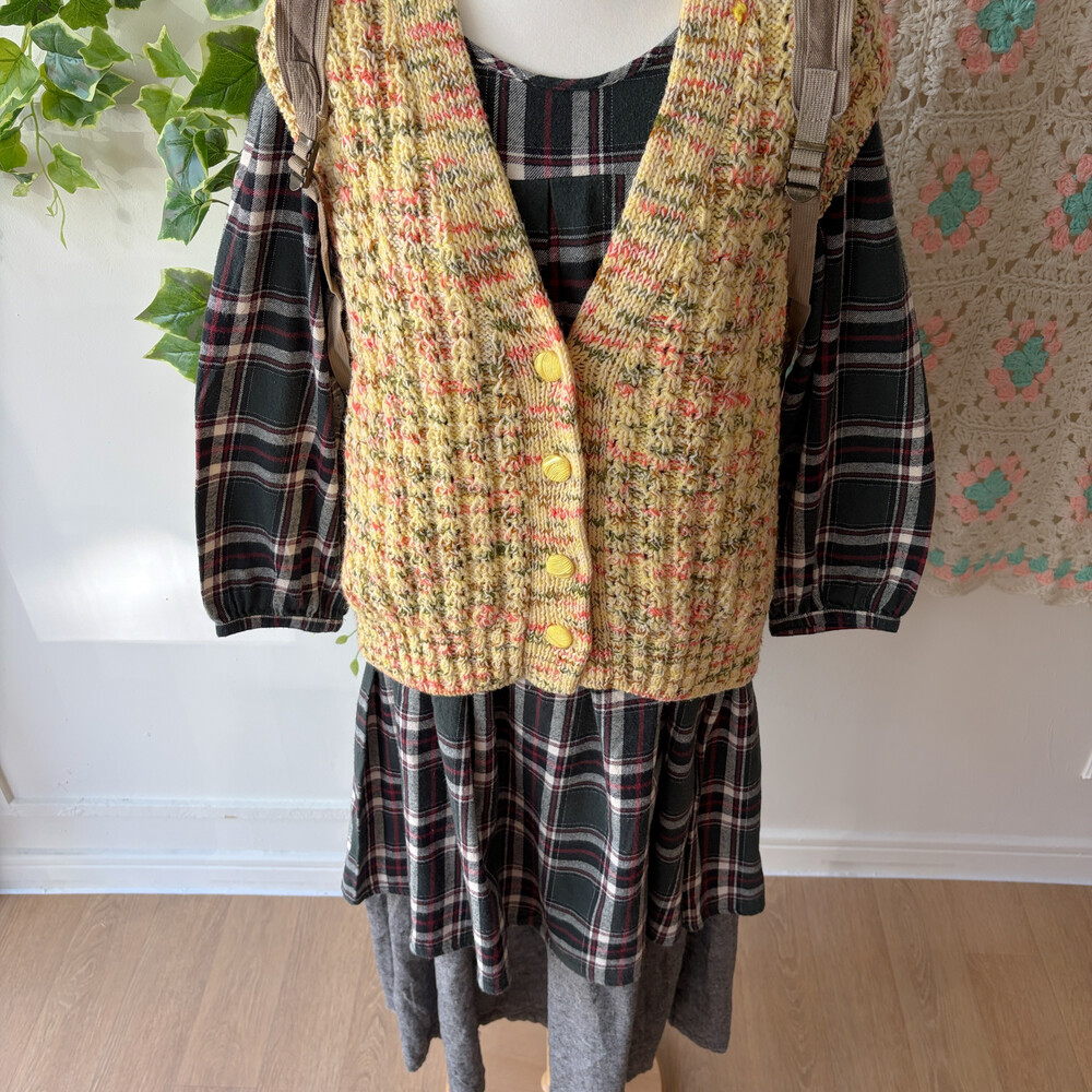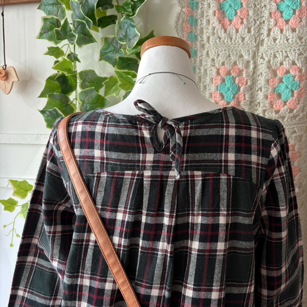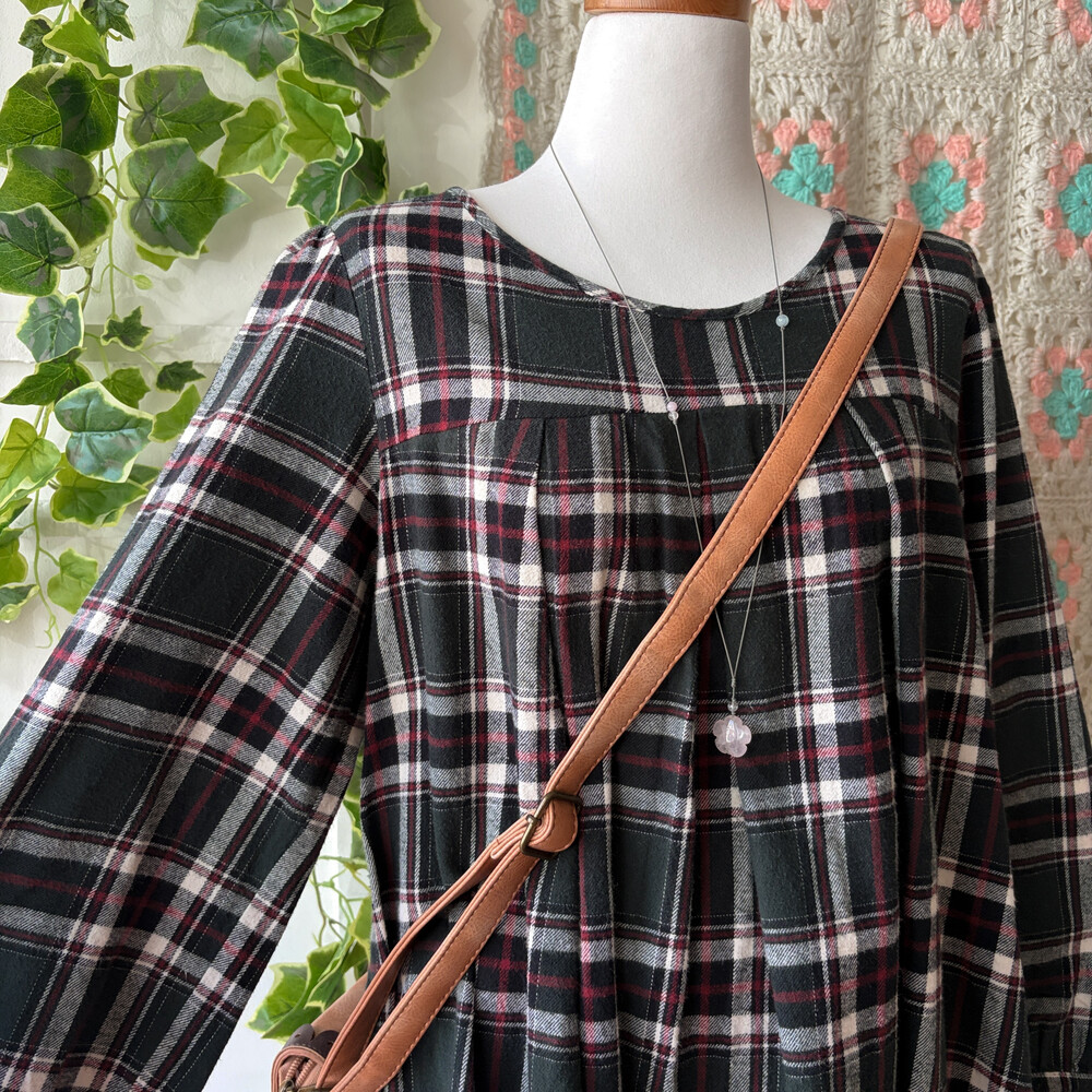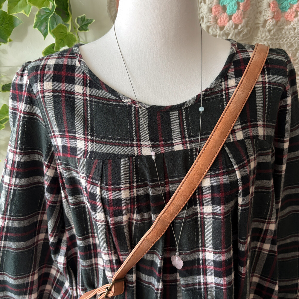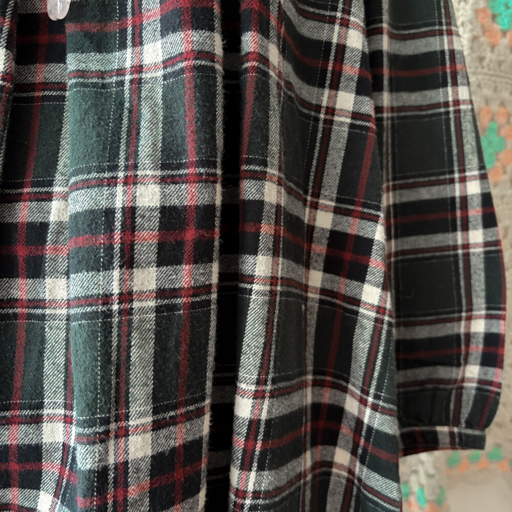 그린 색감의 체크 라운드넥 원피스예요