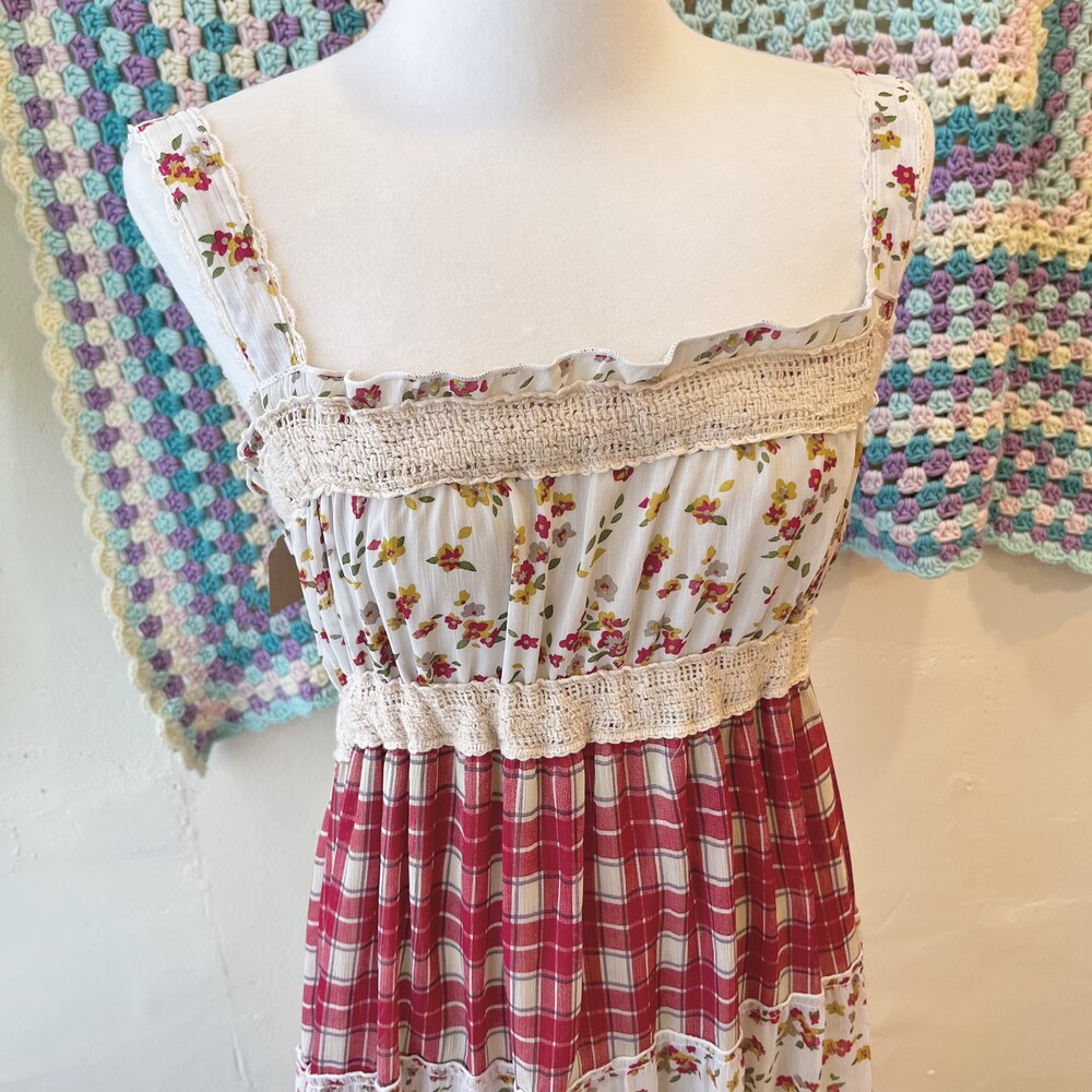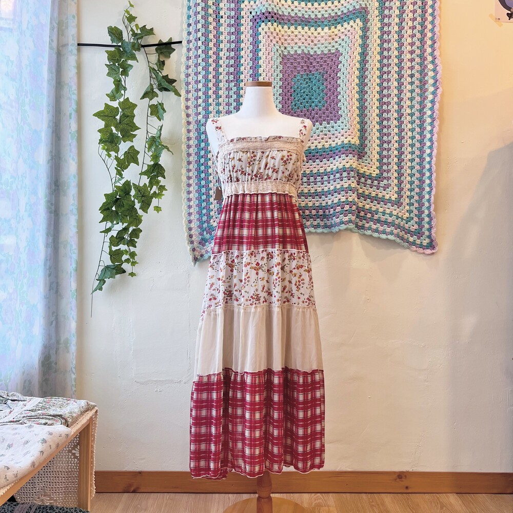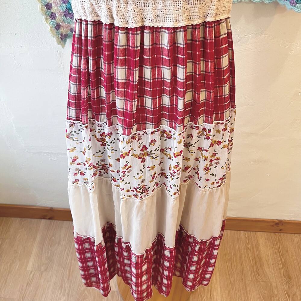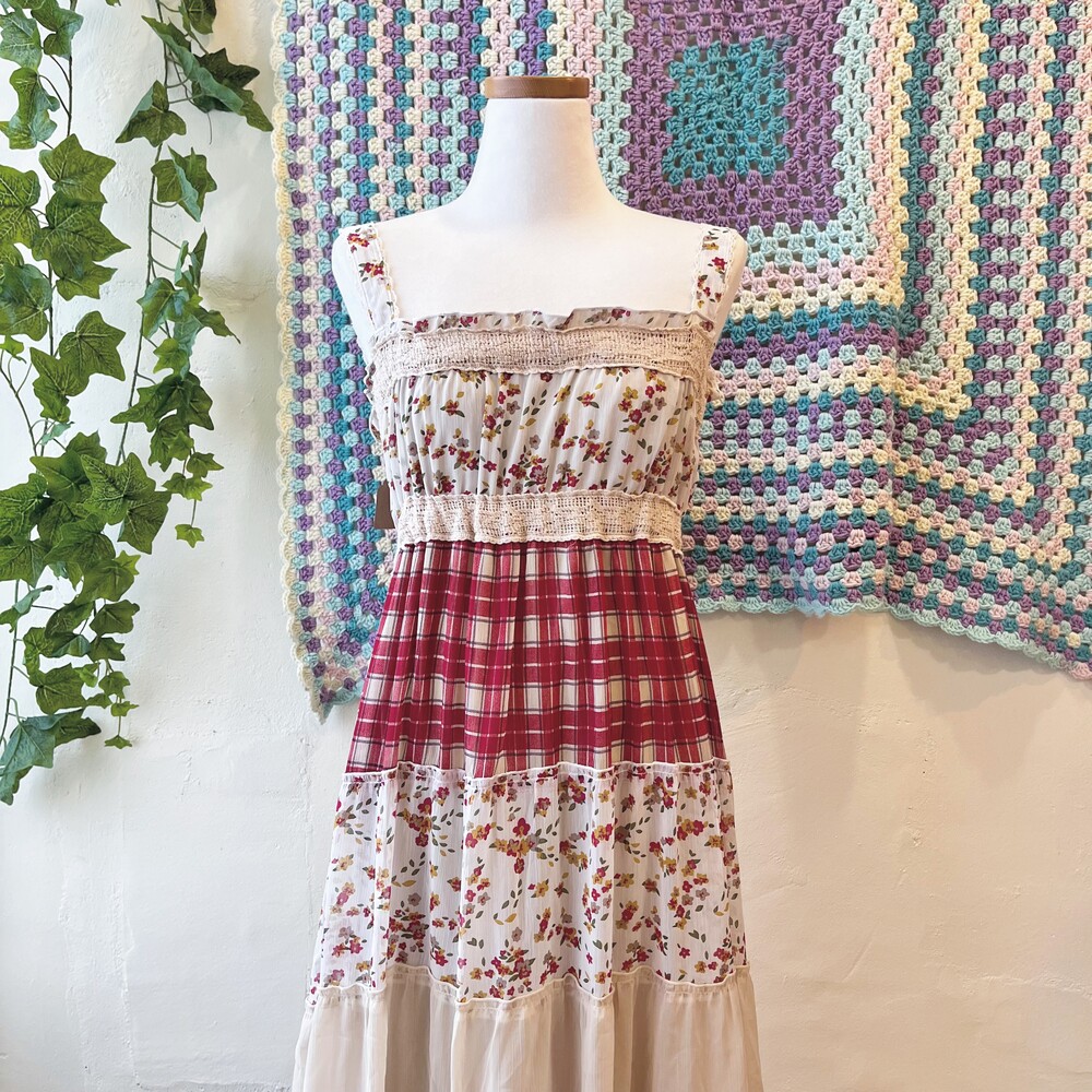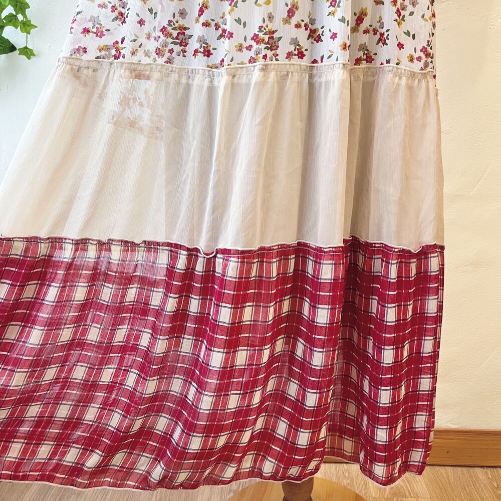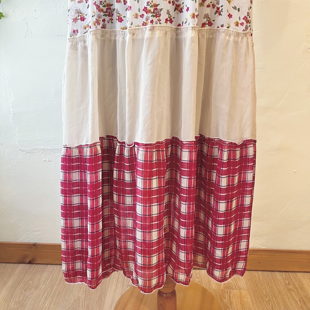 레드 색감의 플라워, 체크 패치 쉬폰 끈원피스예요