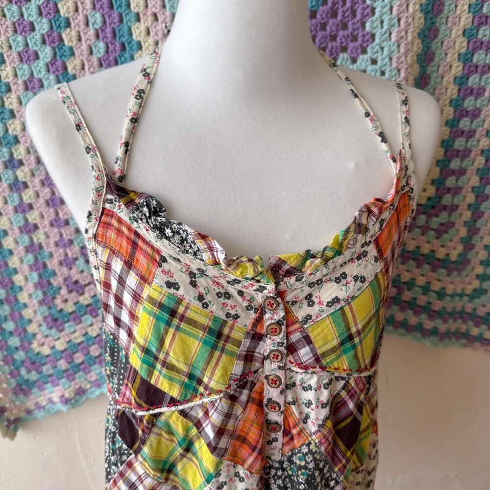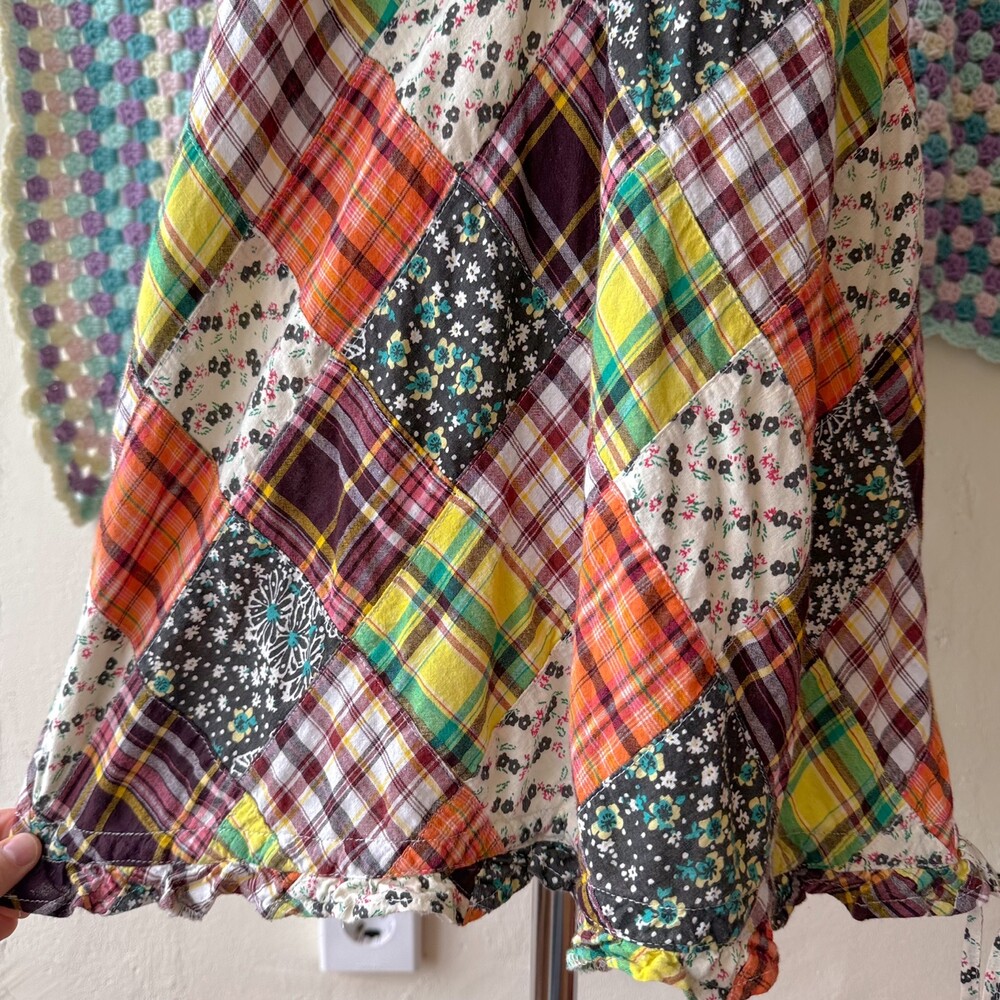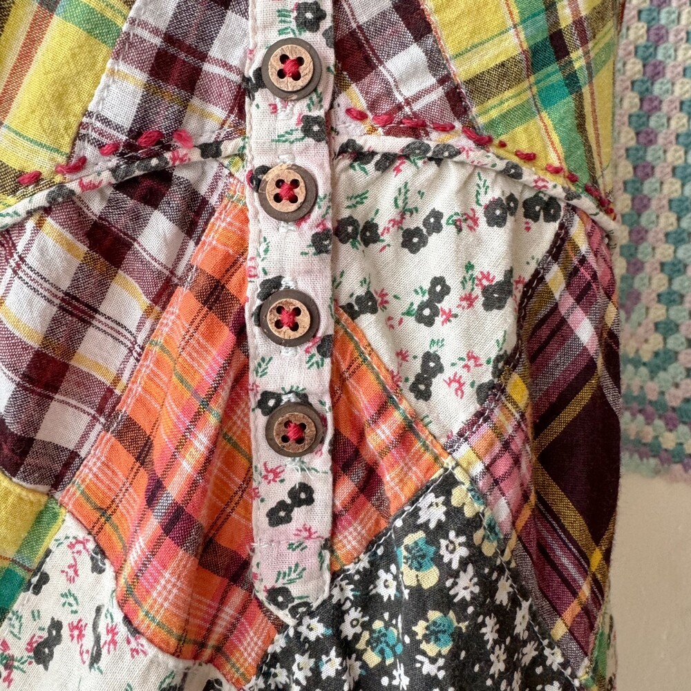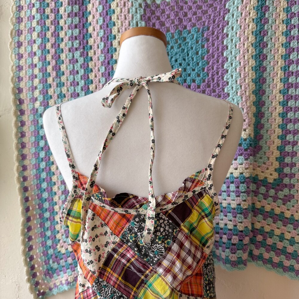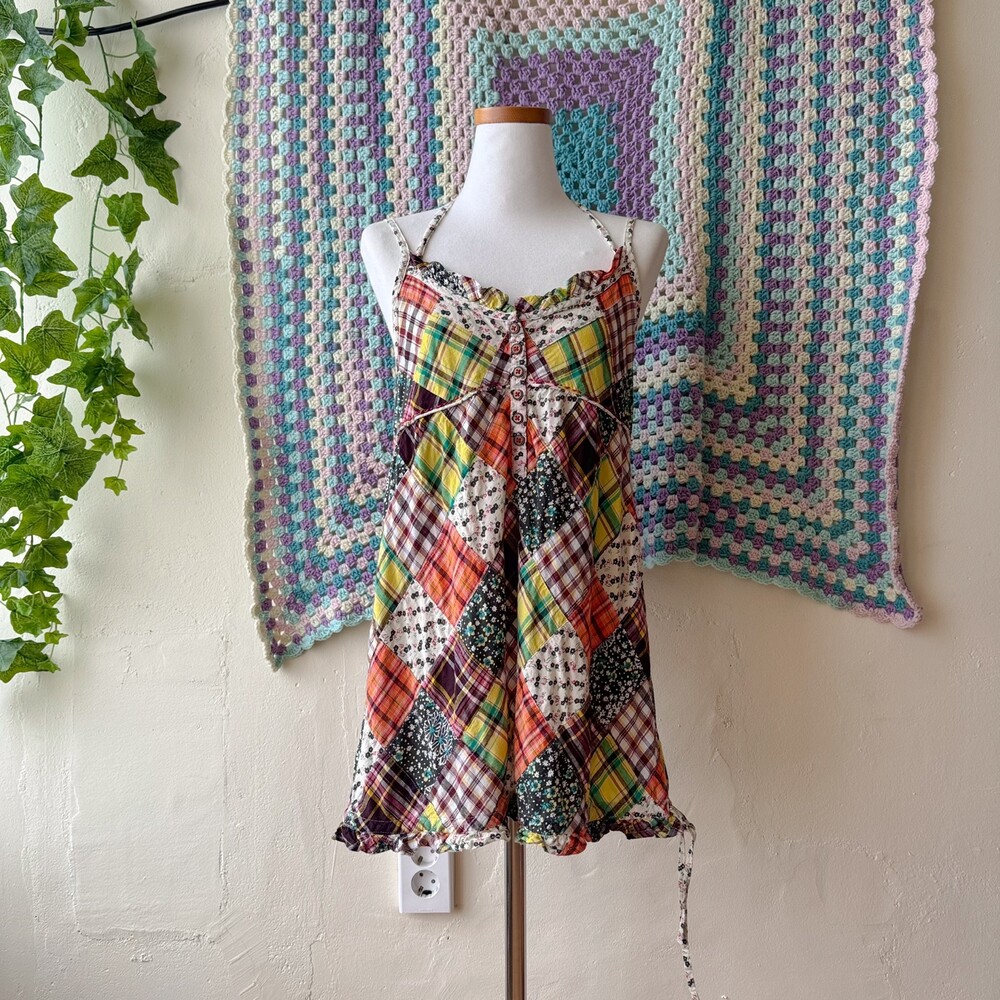 웜한 색감으로 조합된 패치워크 끈나시 블라우스예요