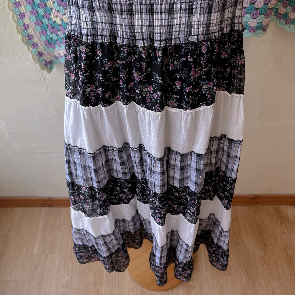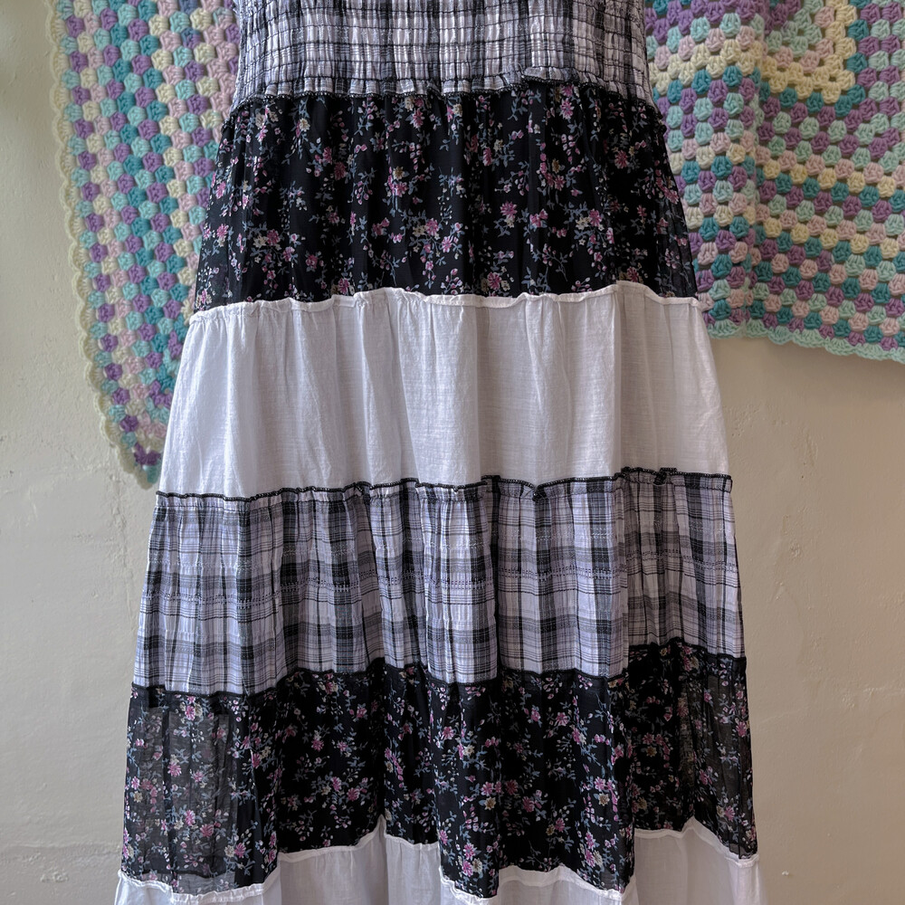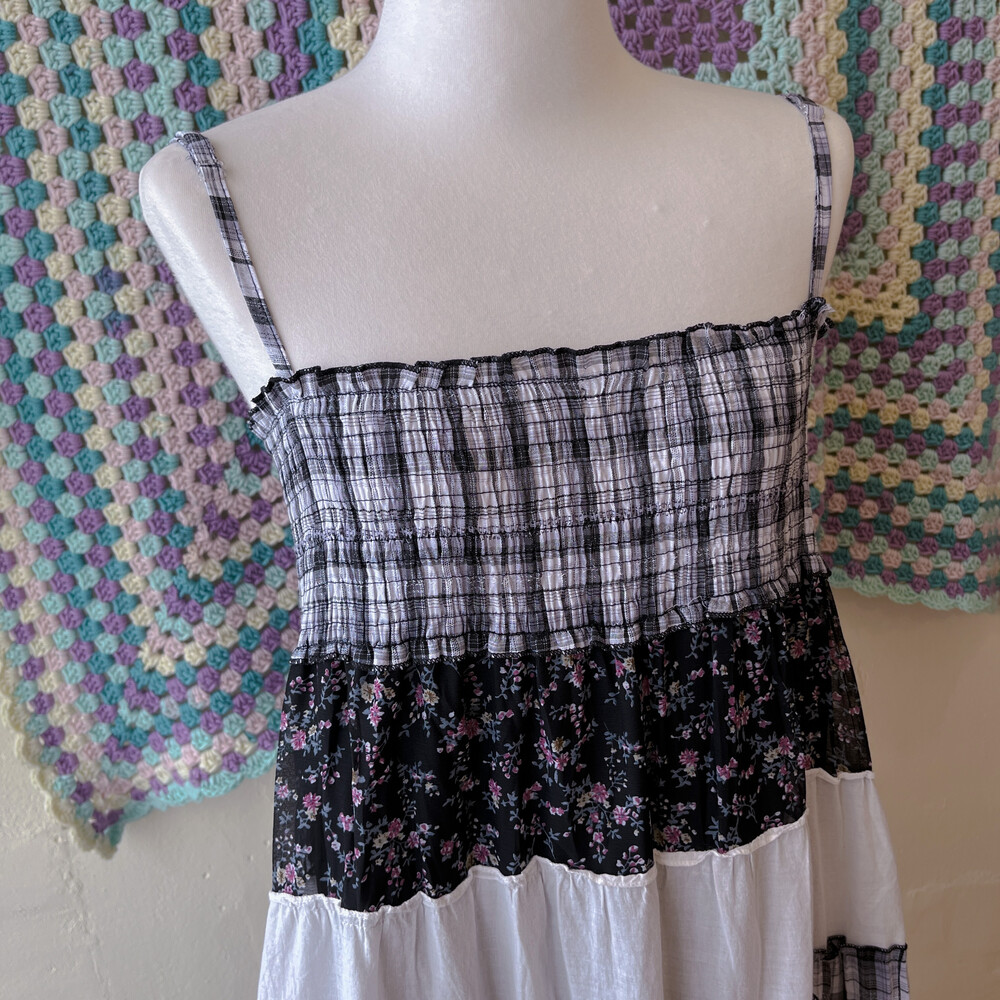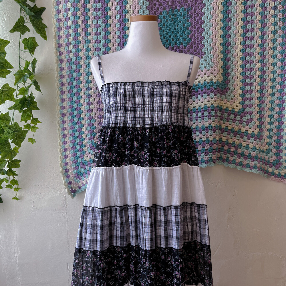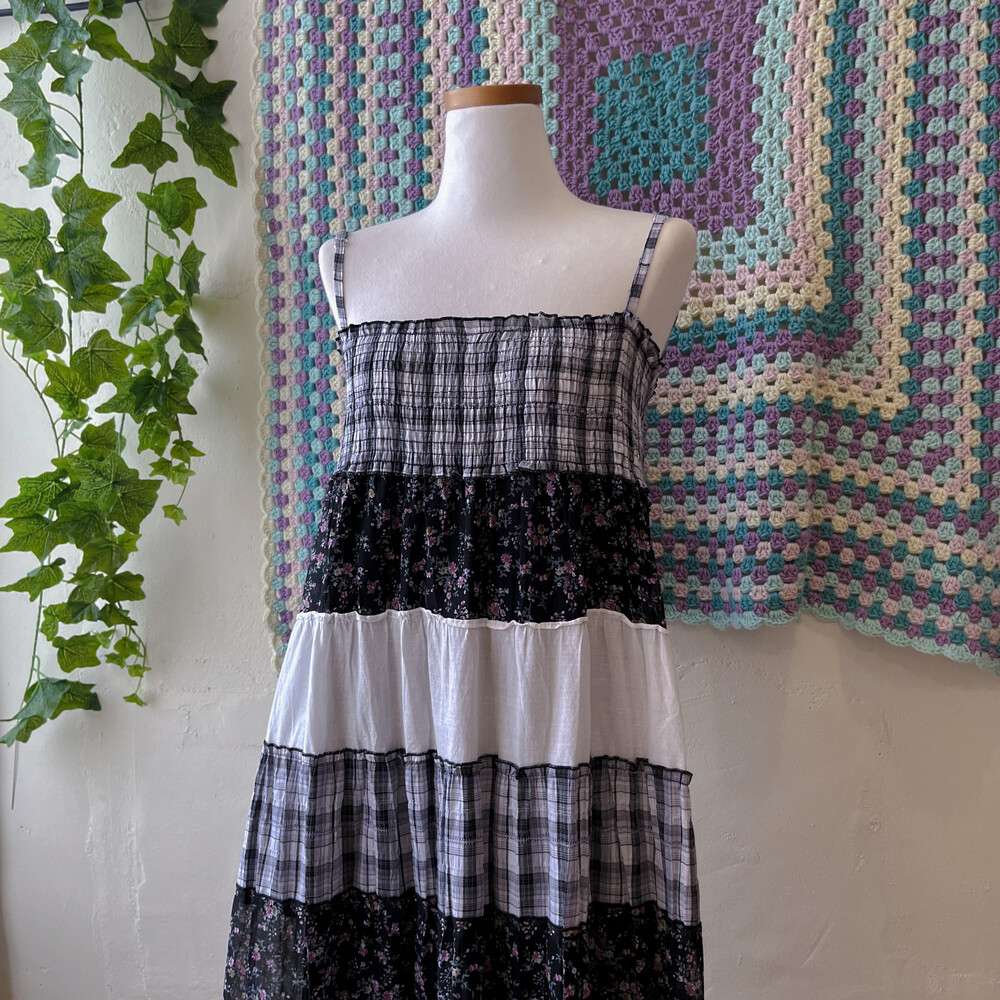 블랙 색감 베이스의 패치워크 끈원피스예요