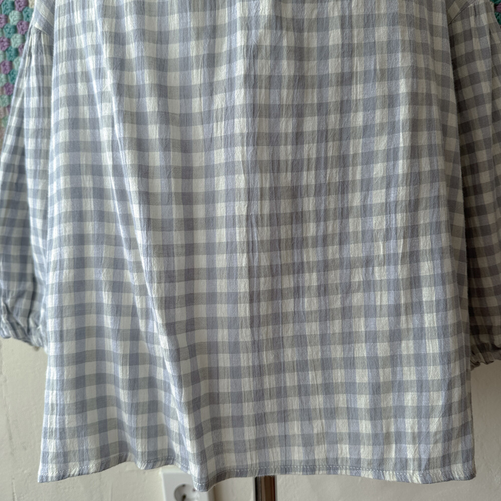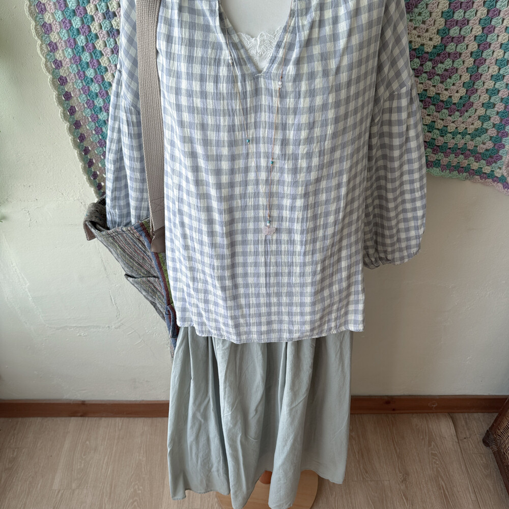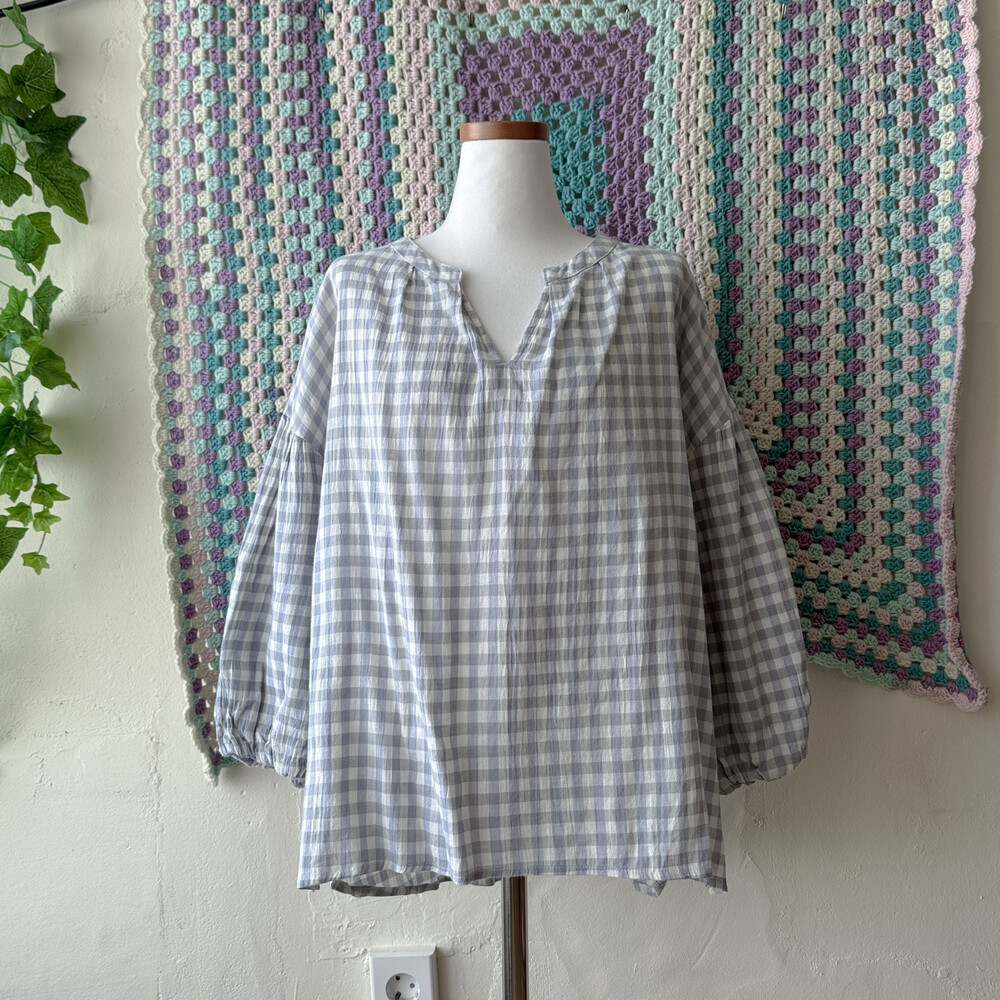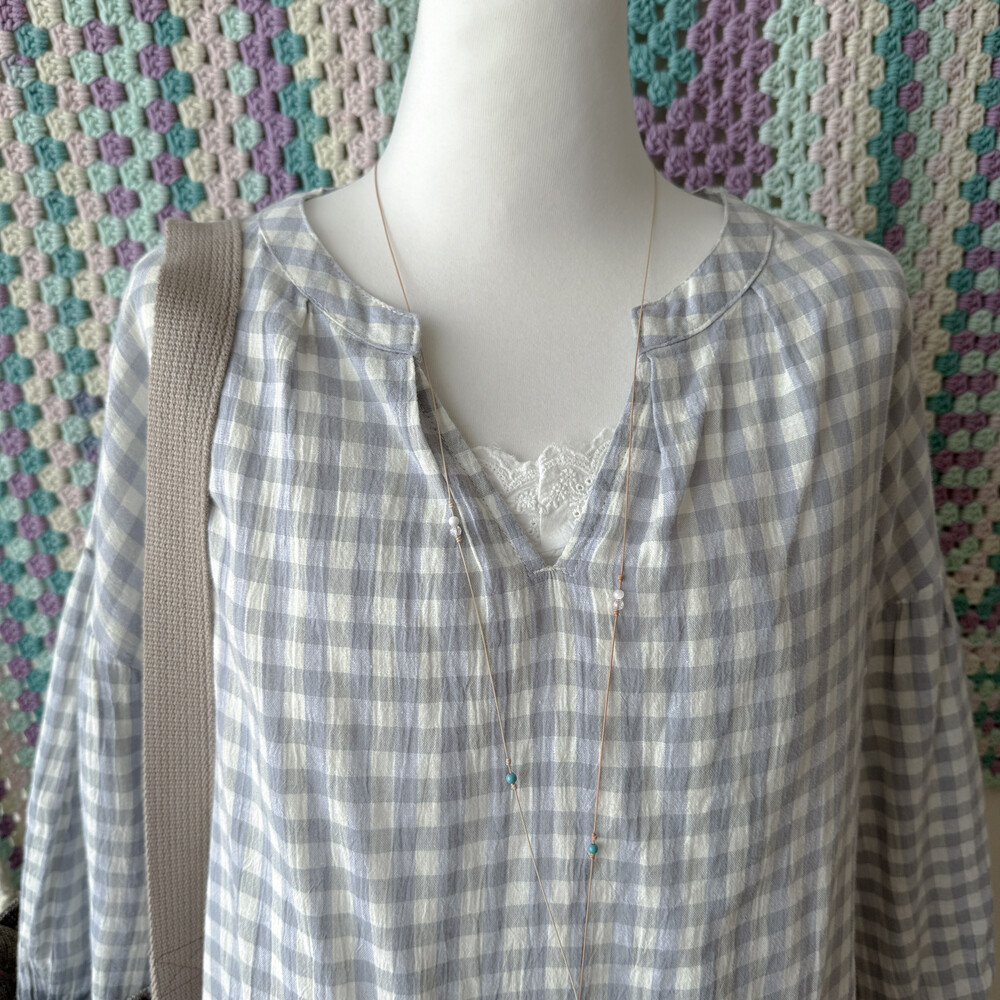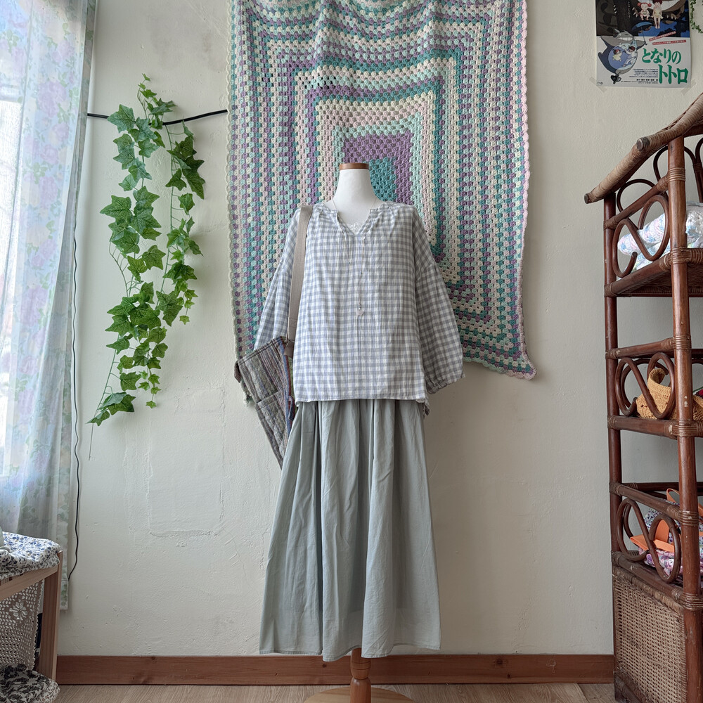 청보라와 그레이 조합의 체크 블라우스예요