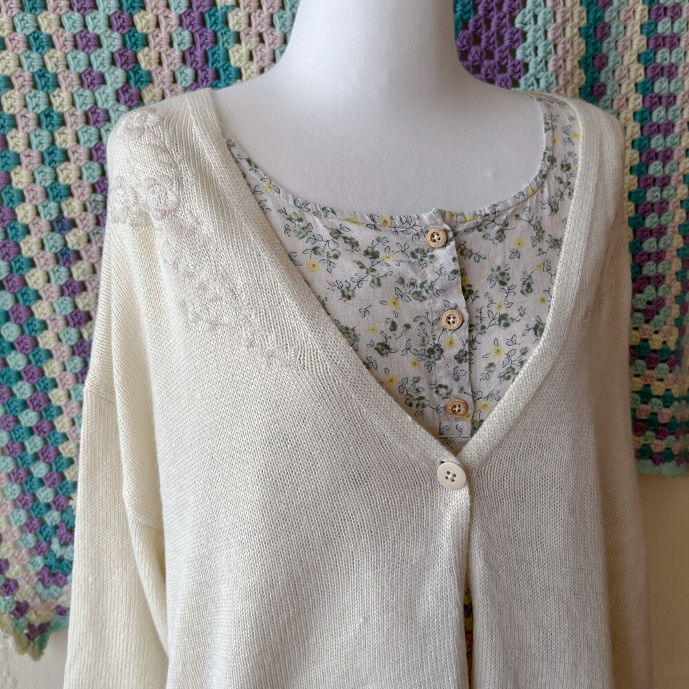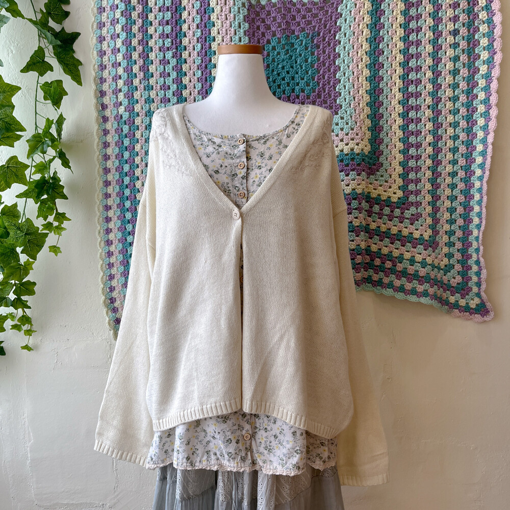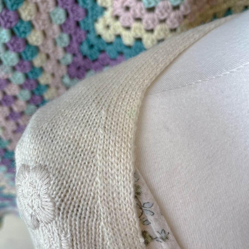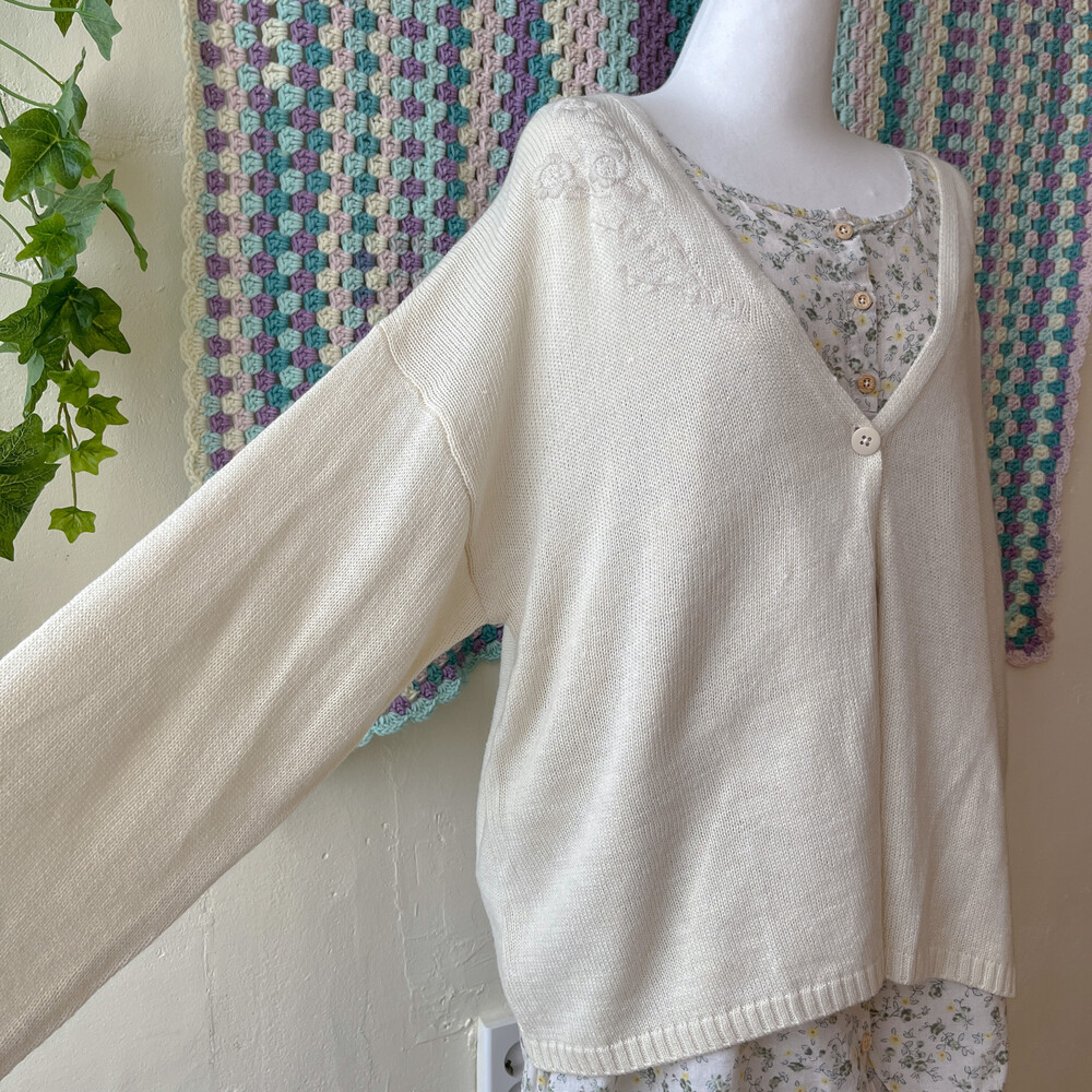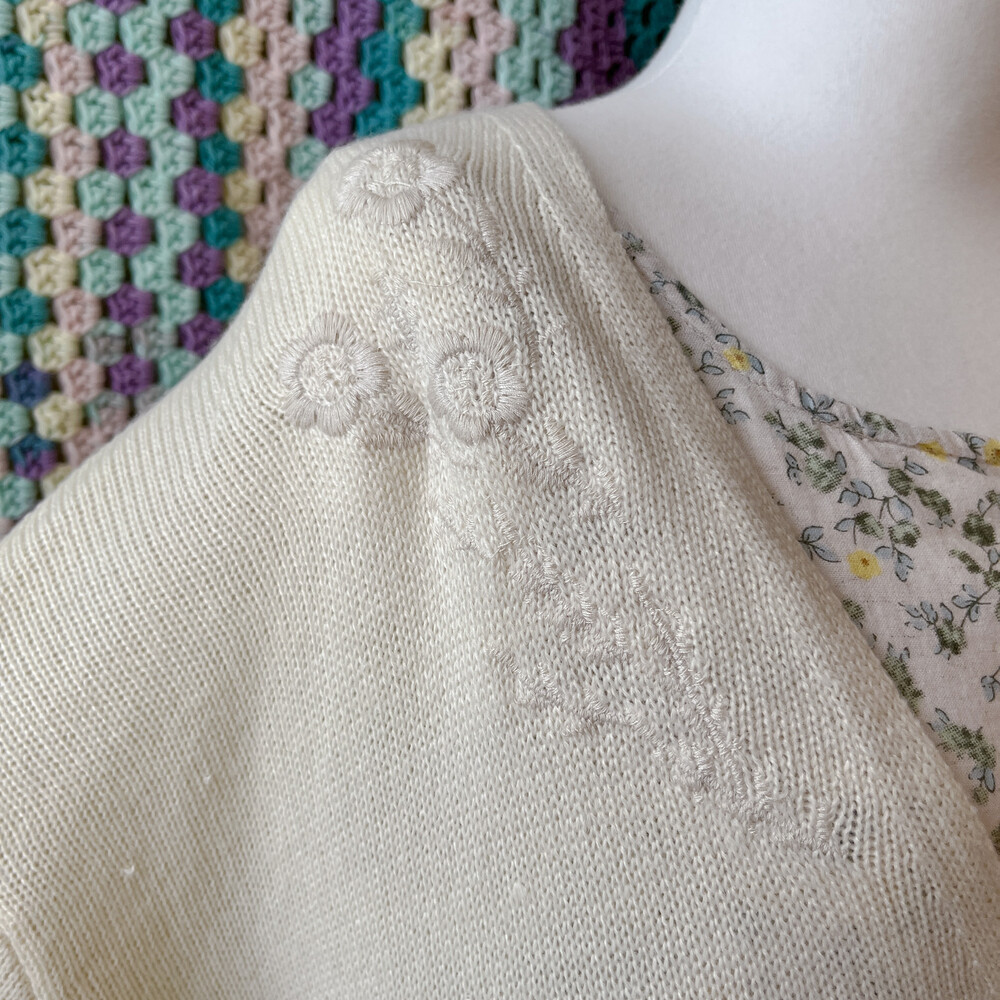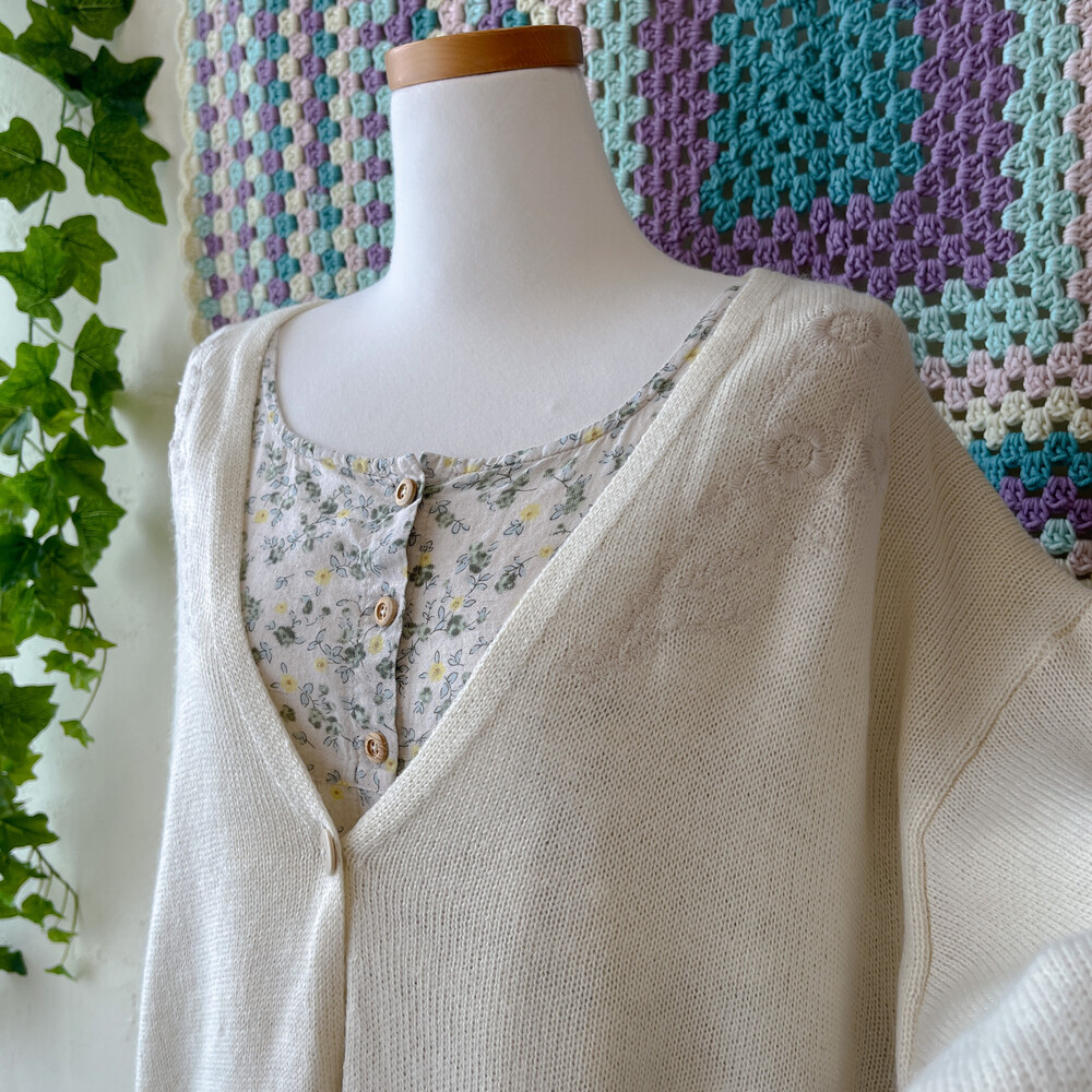 뮤트한 분위기가 나는 가디건으로, 자수 포인트가 들어가 있어요