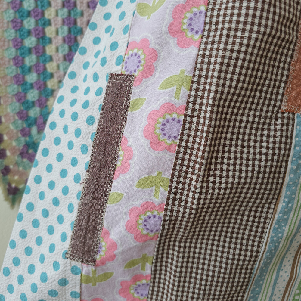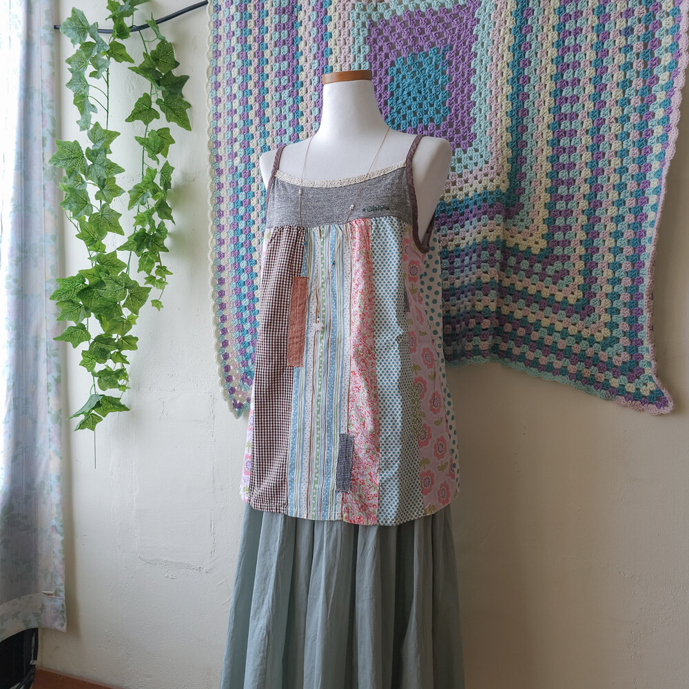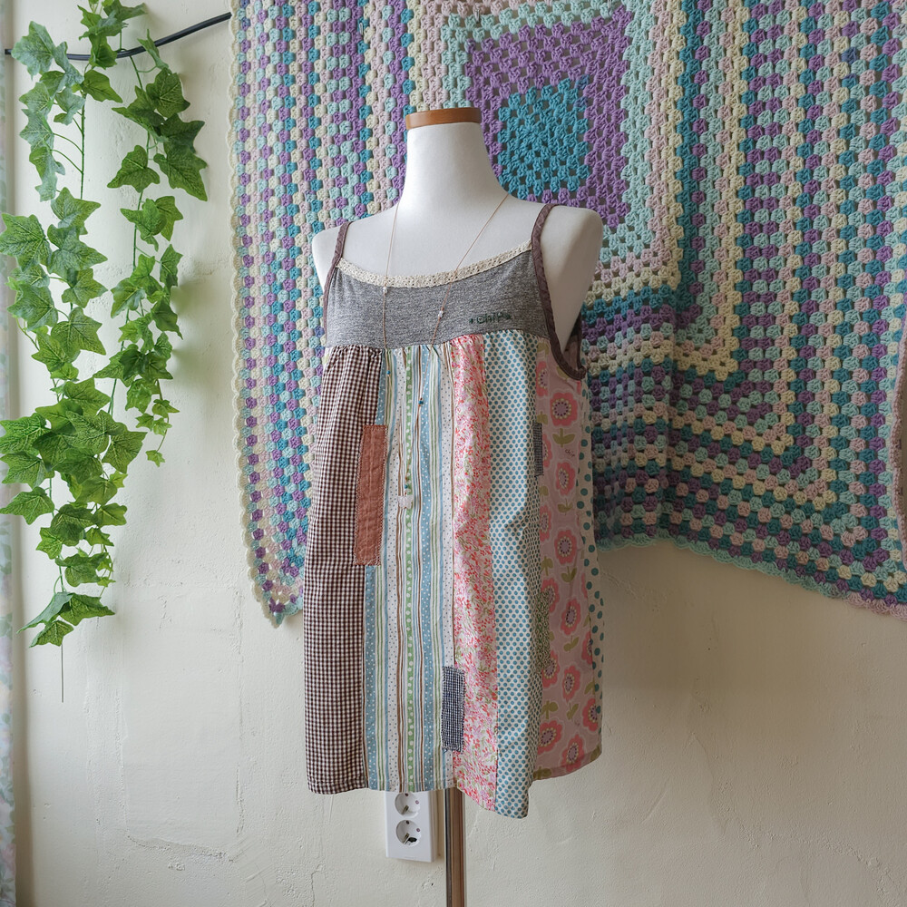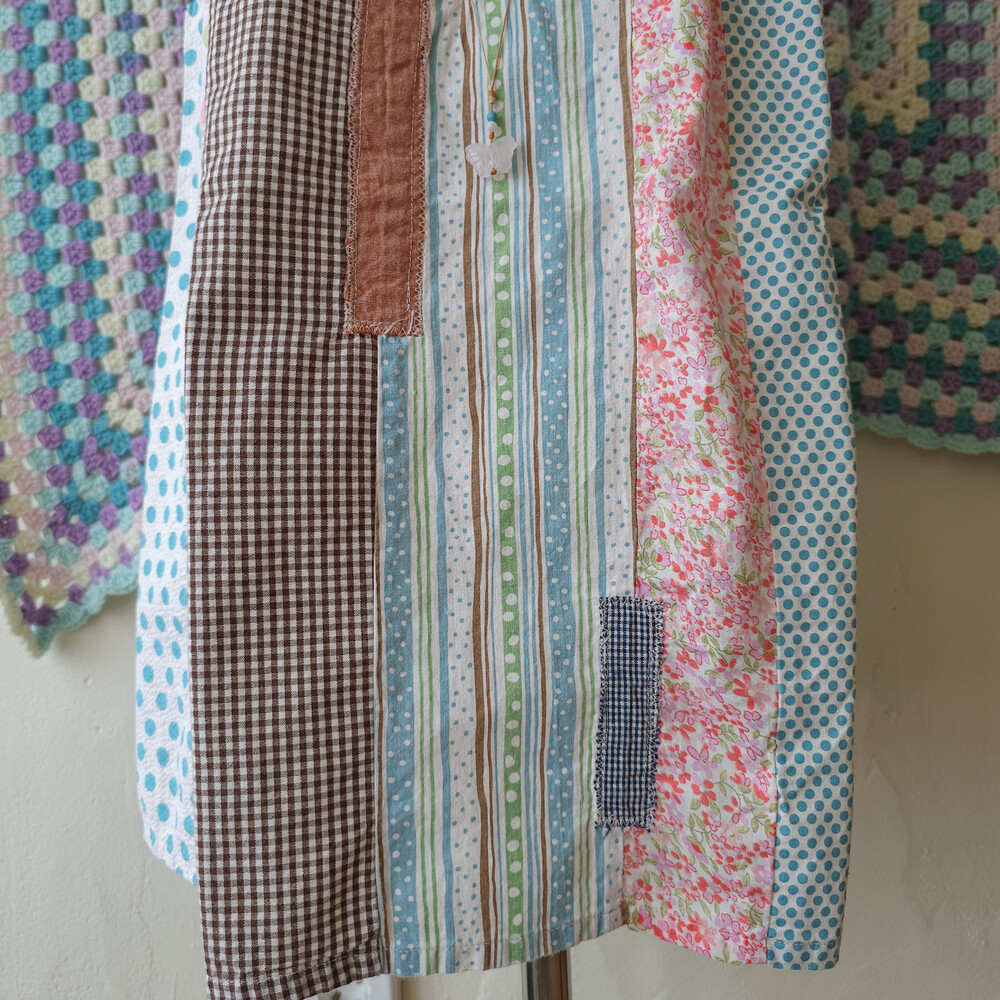 꽃무늬, 도트 무늬 등이 조합된 세로 패치워크 블라우스예요
