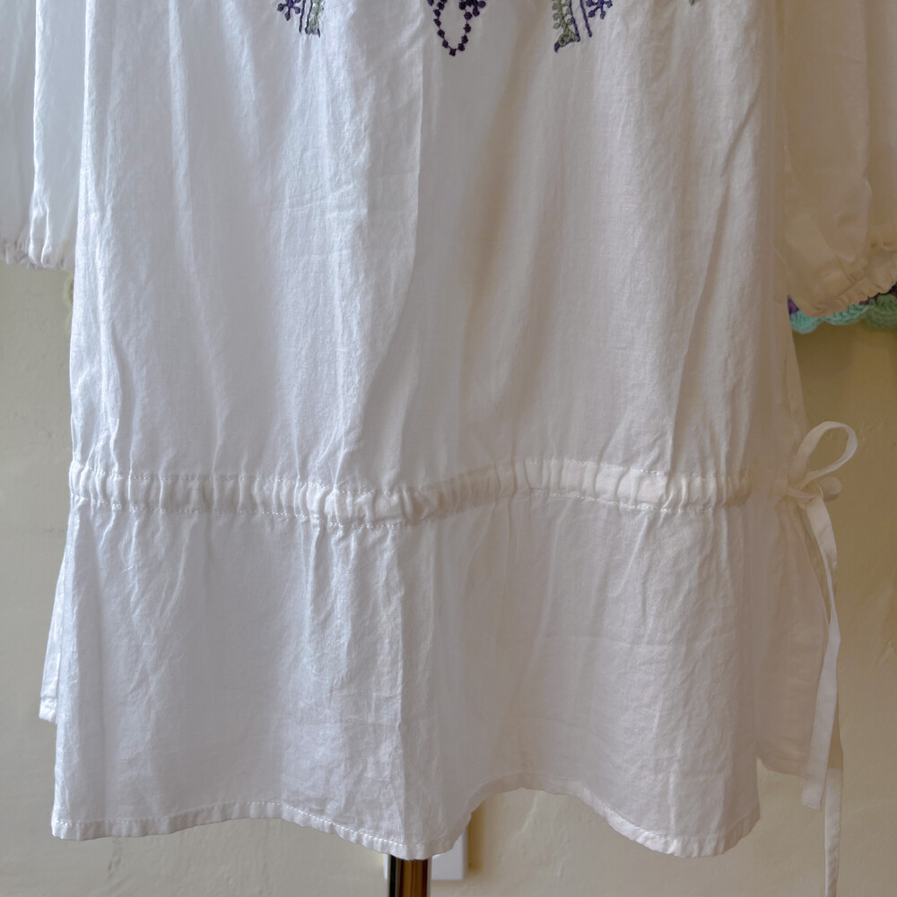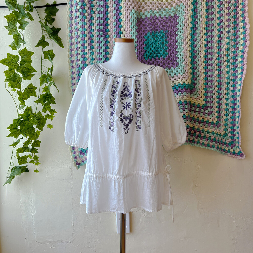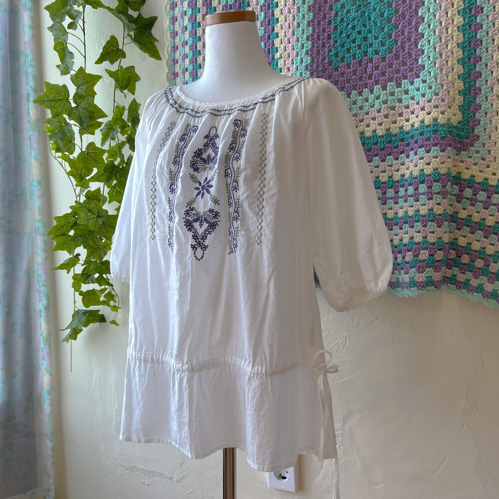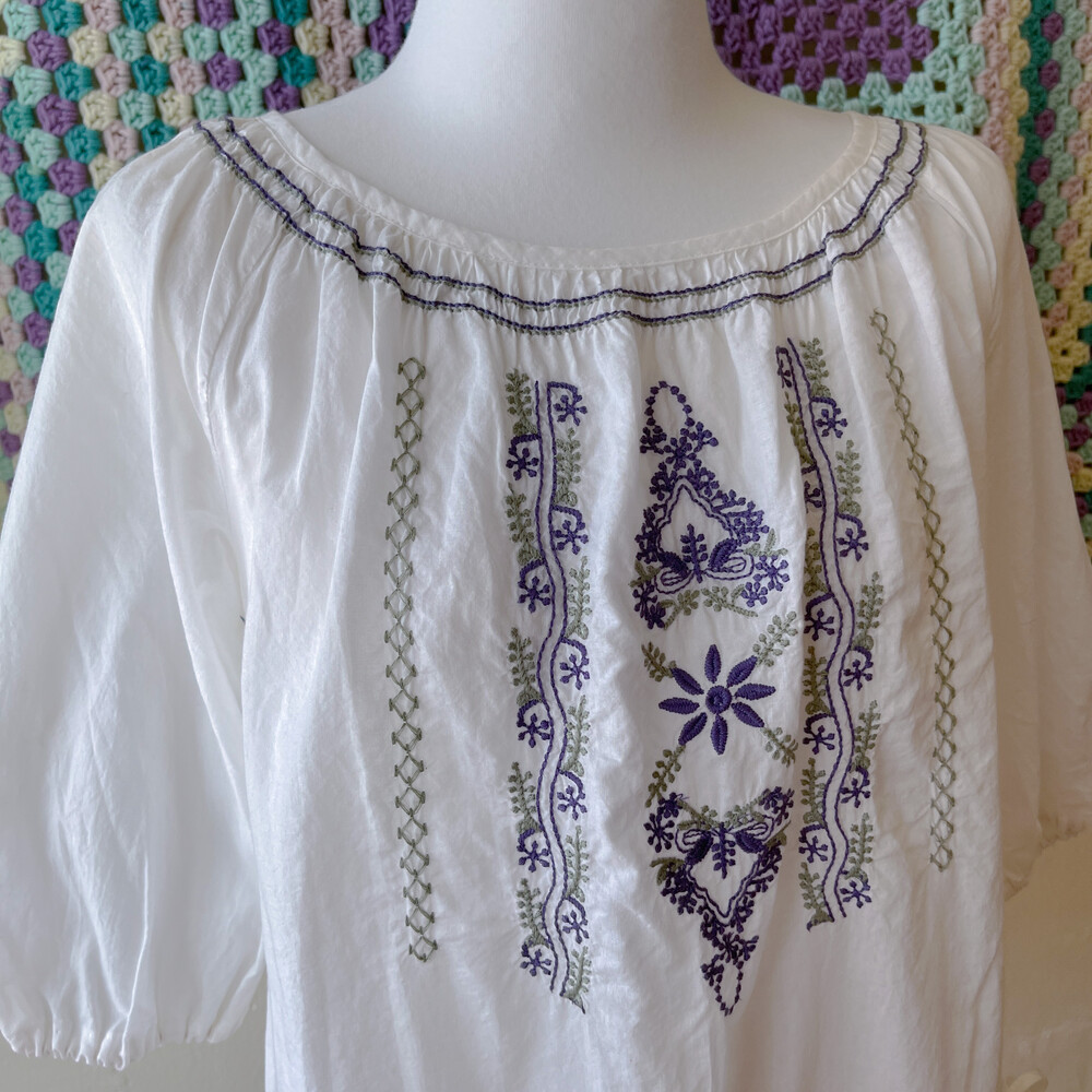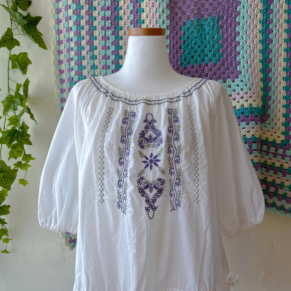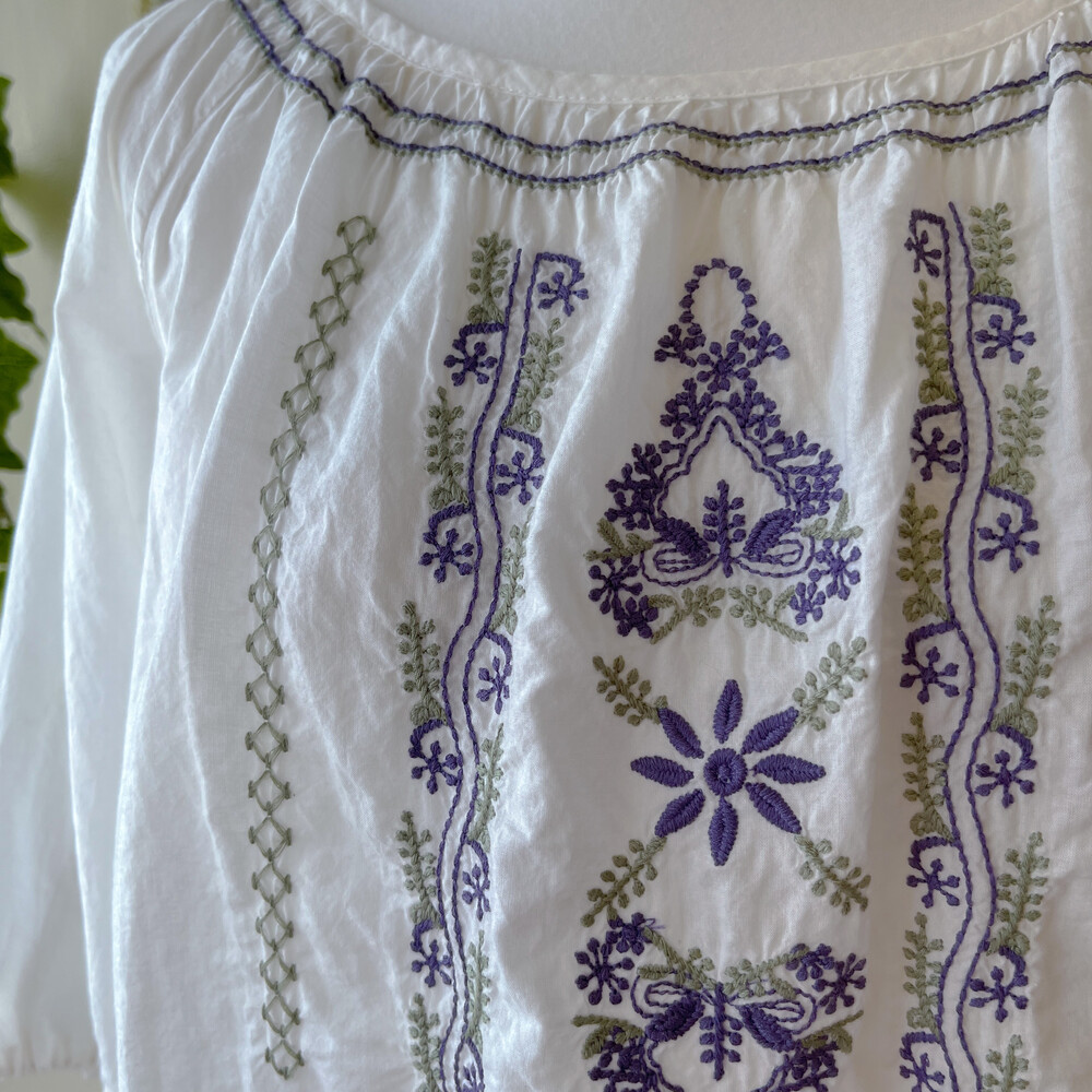 그린, 보라 색감 자수 포인트의 화이트 블라우스예요