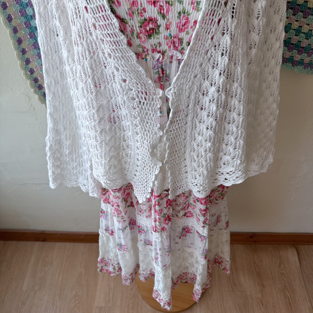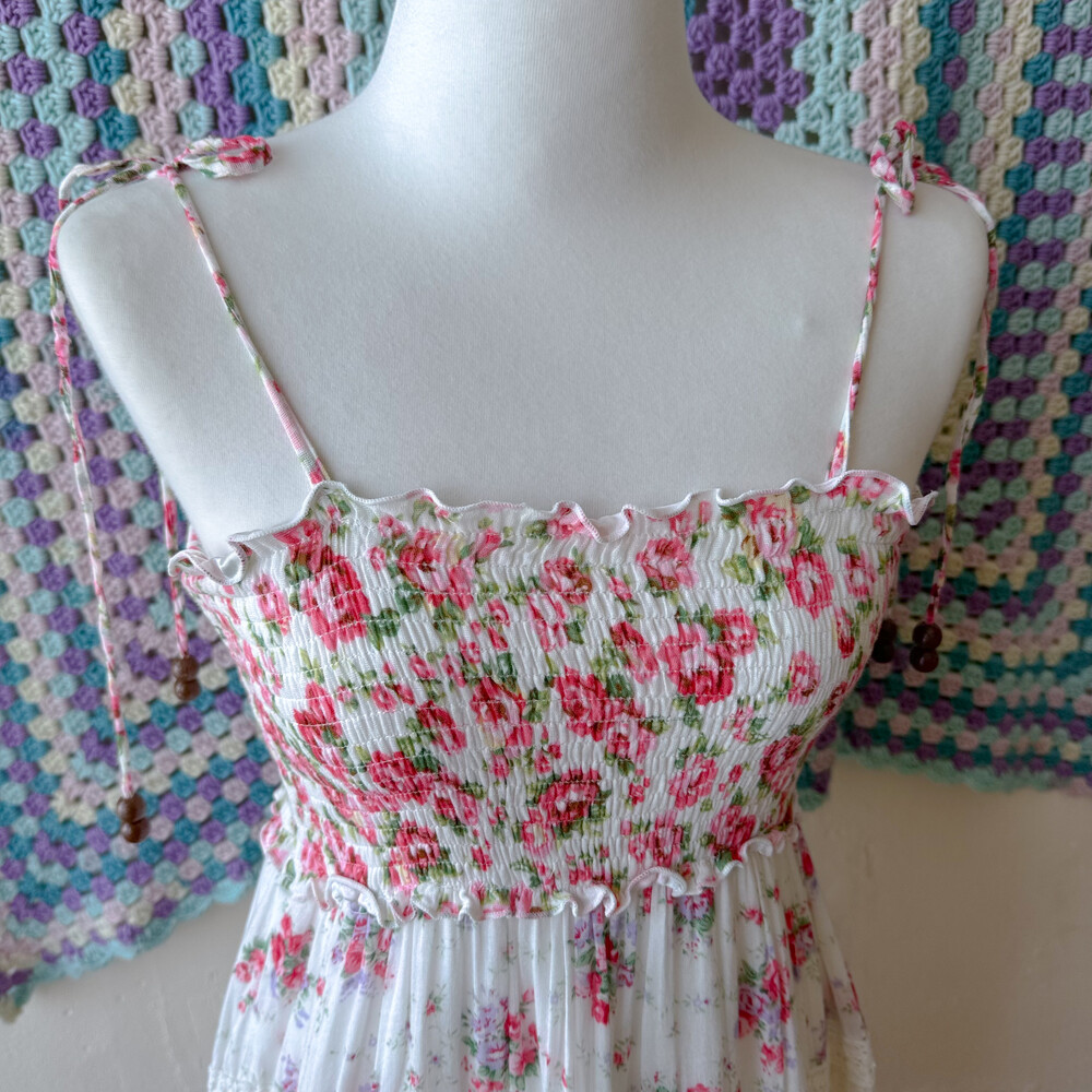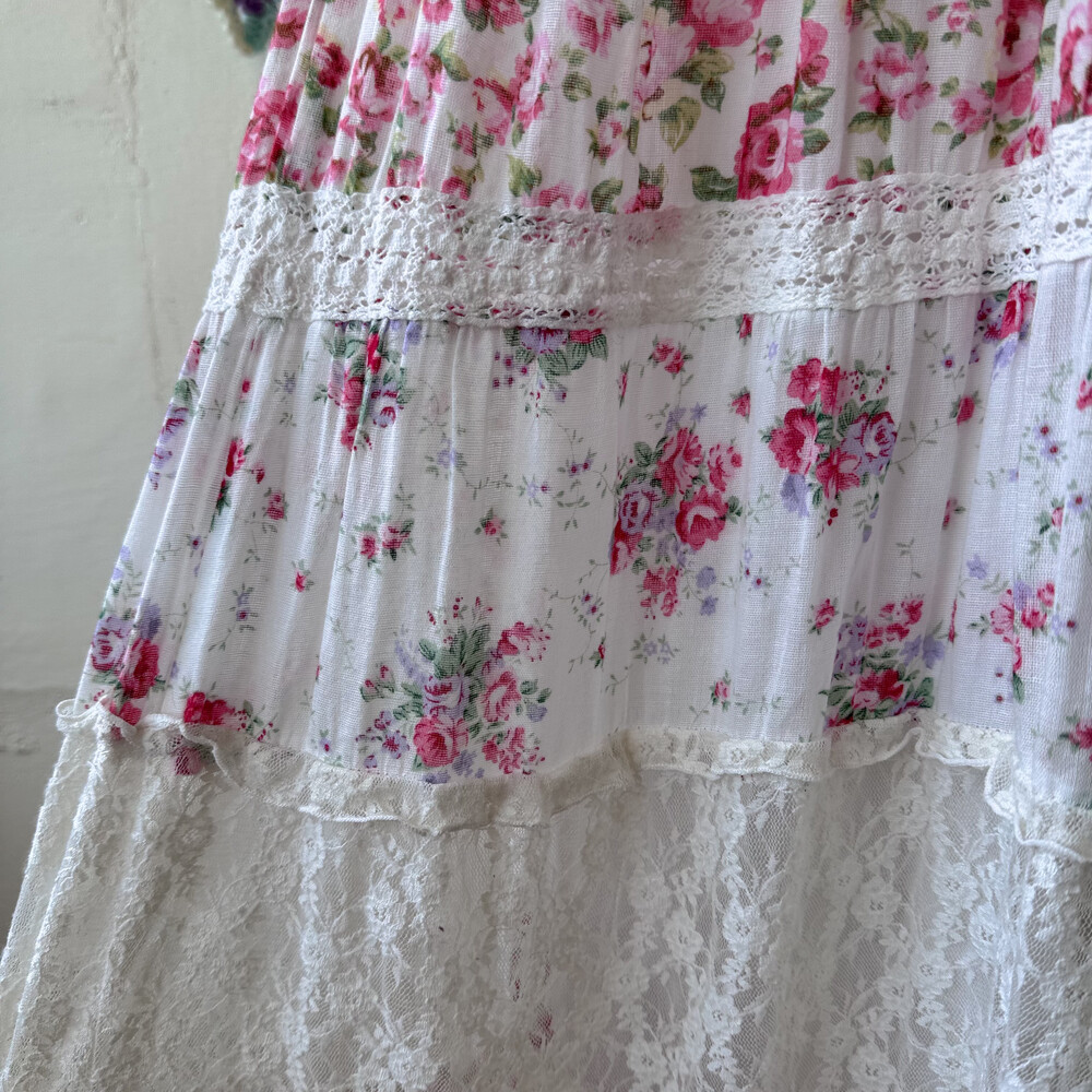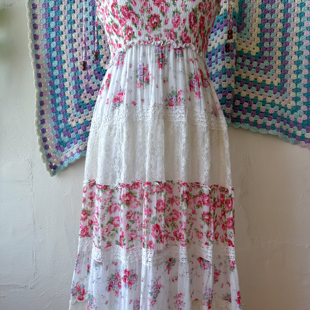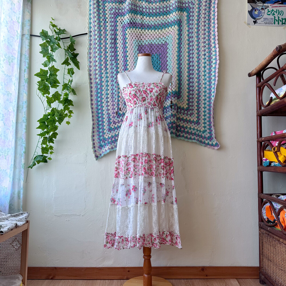 분홍색, 보라색 꽃무늬 패턴의 패치워크 끈원피스예요