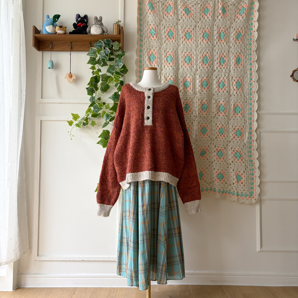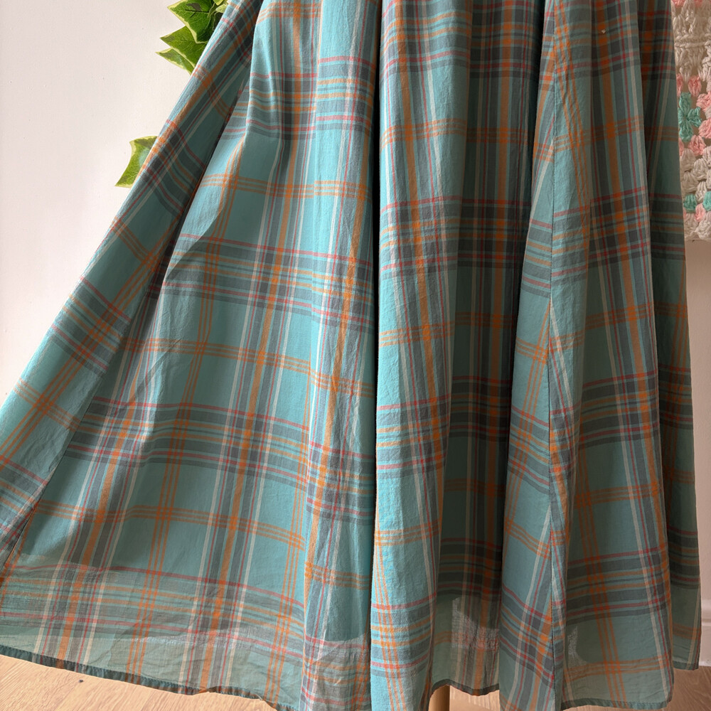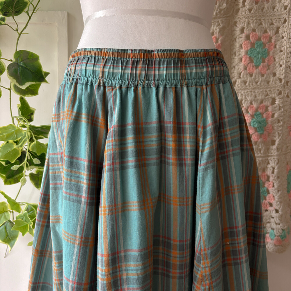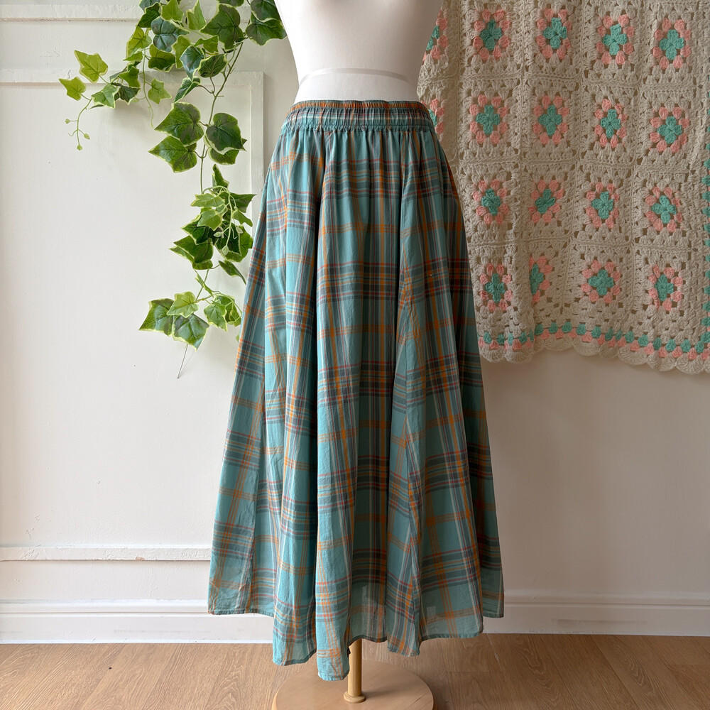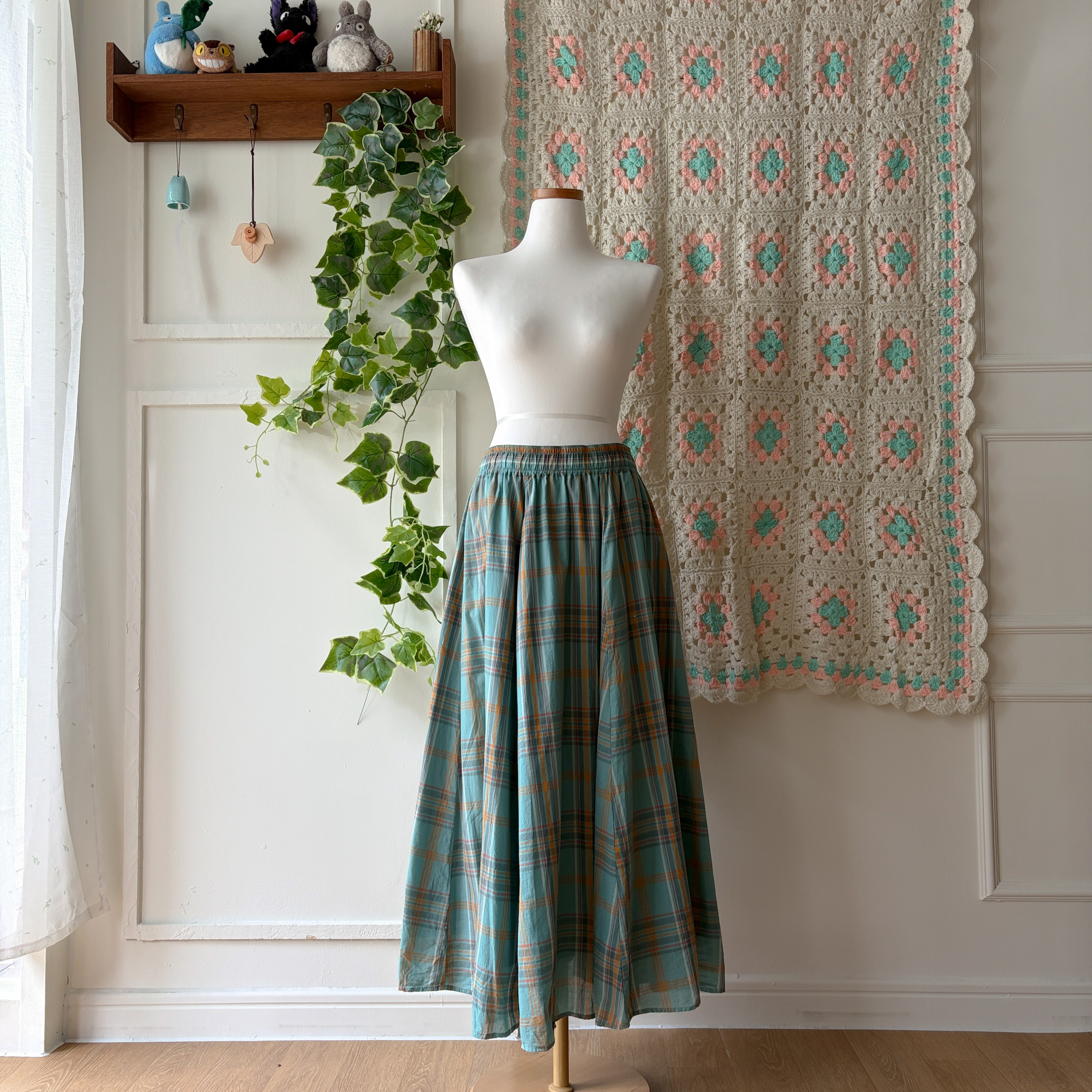 다크한 웜민트 색감 바탕의 체크 스커트예요