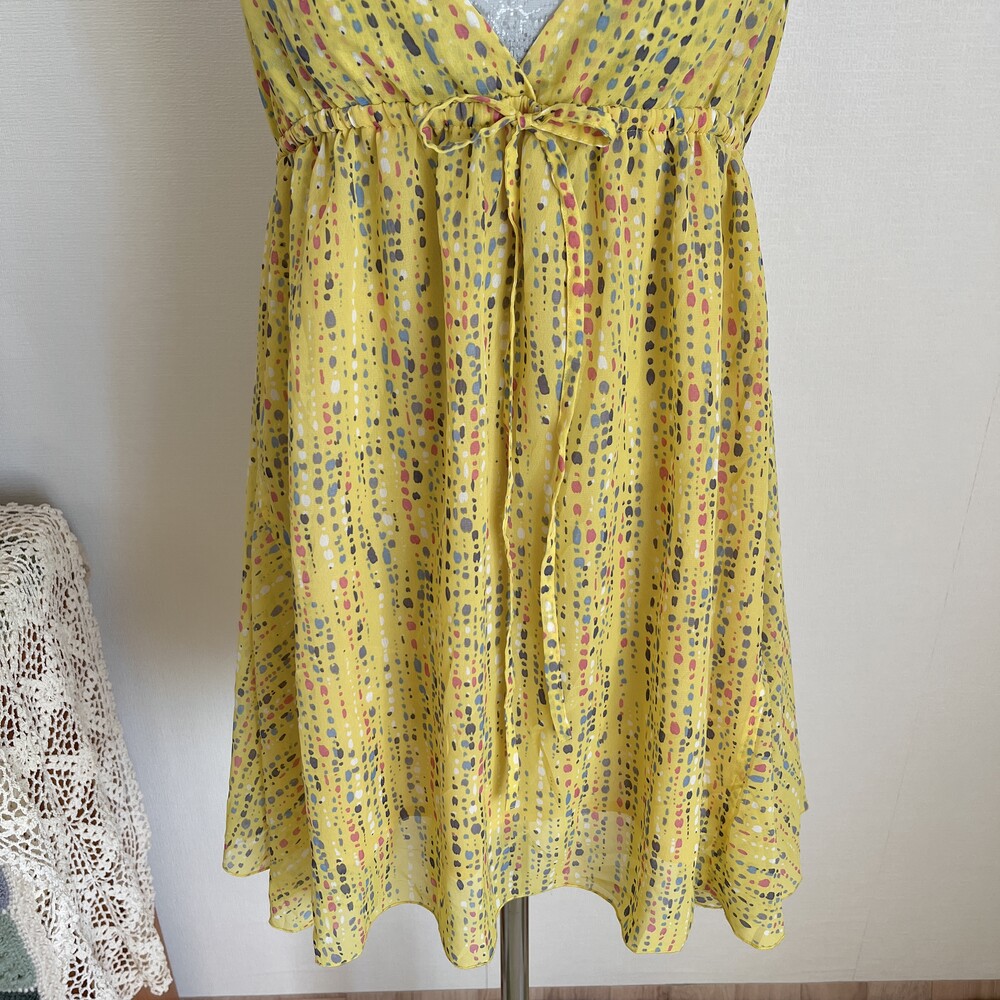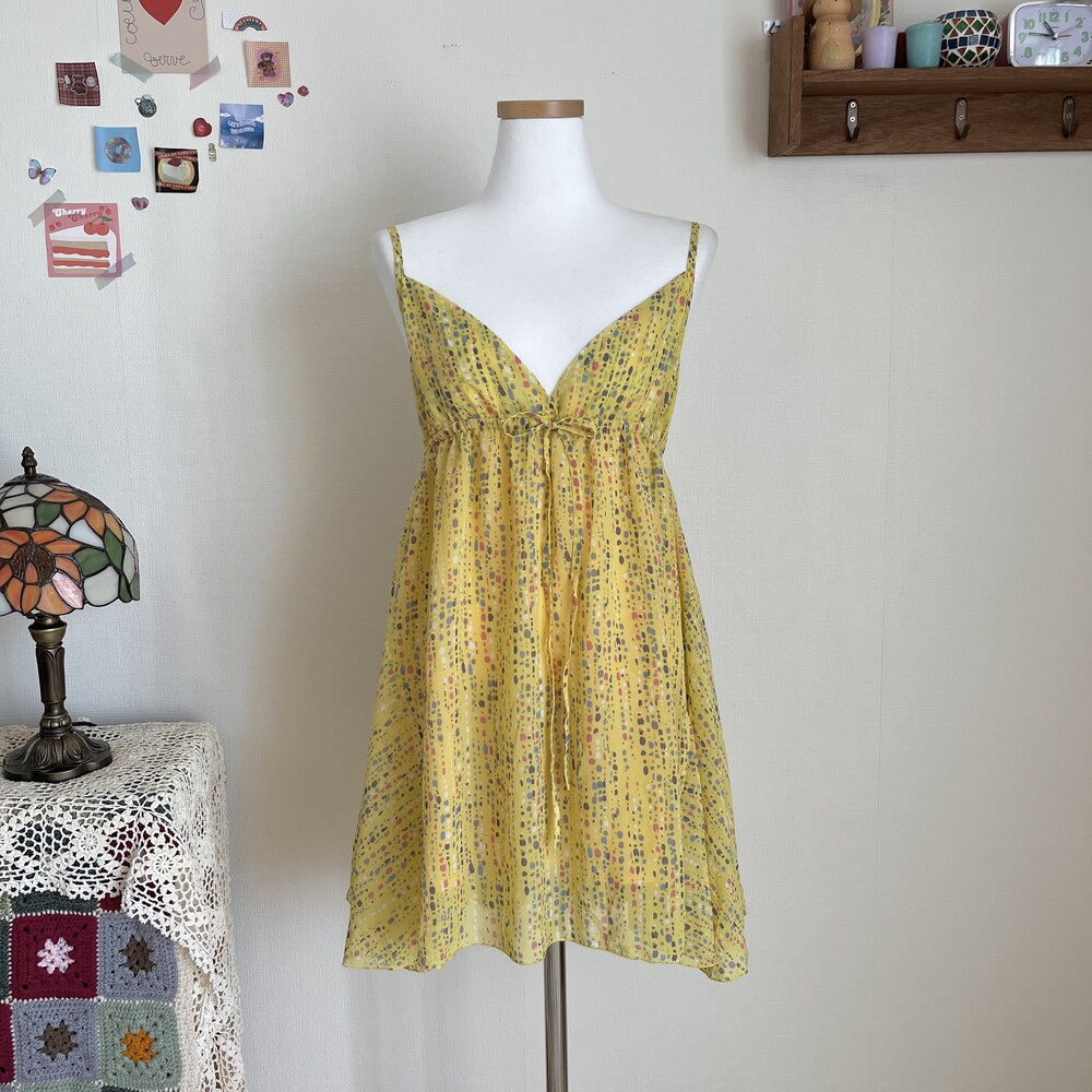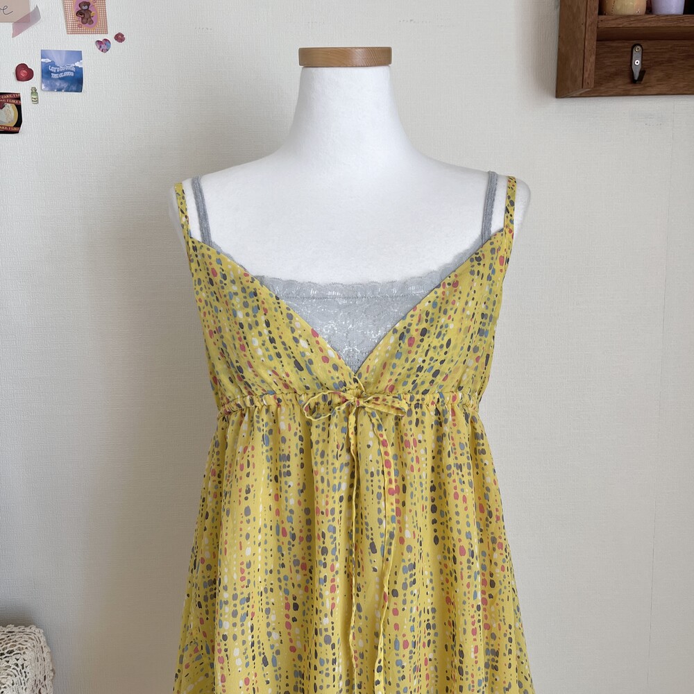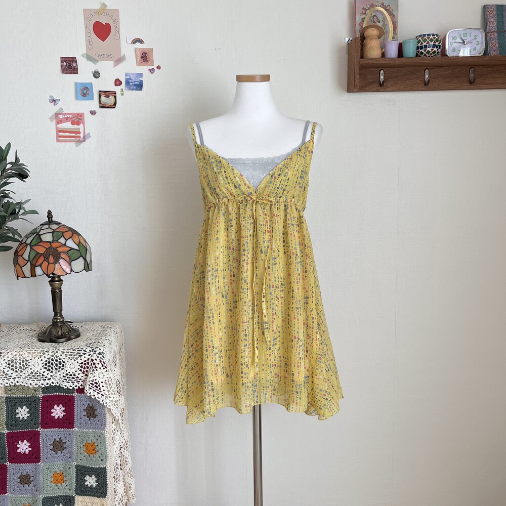 노랑 겨자 색감의 브이넥 쉬폰 끈원피스예요