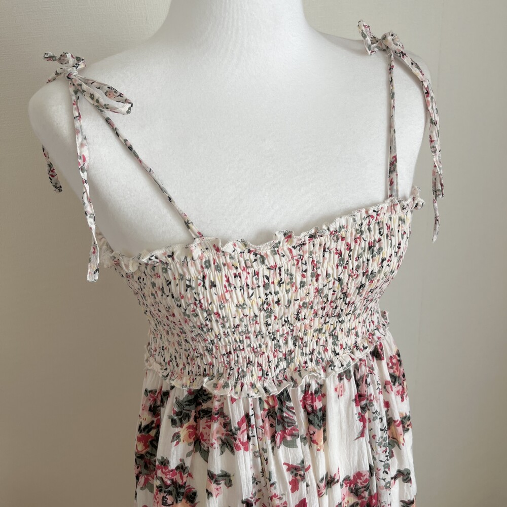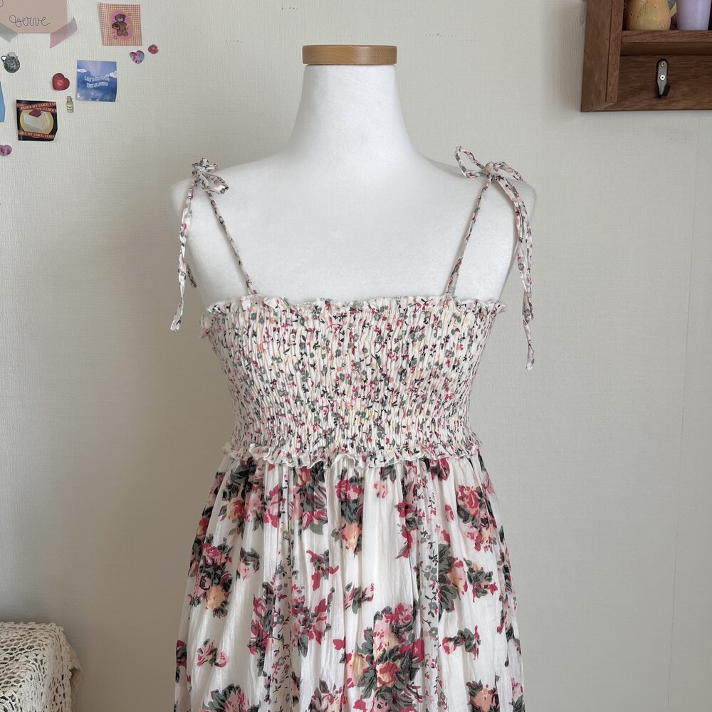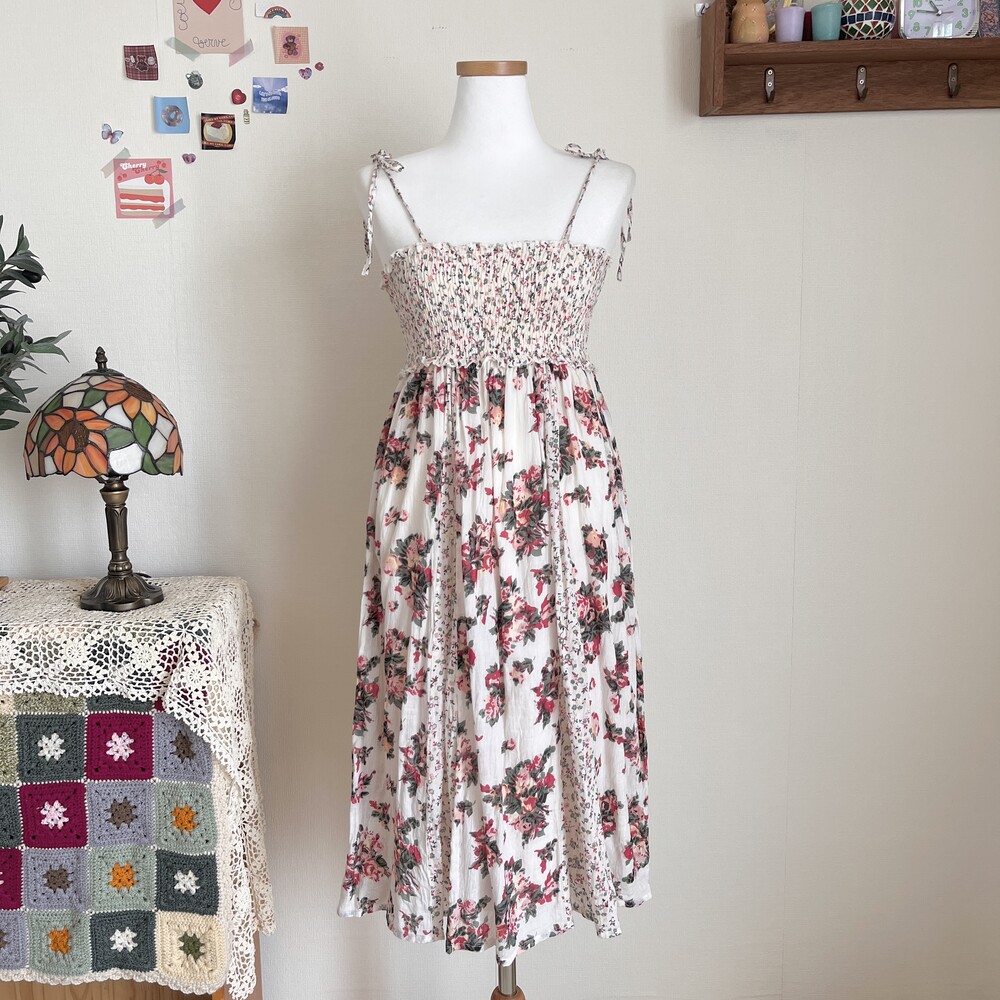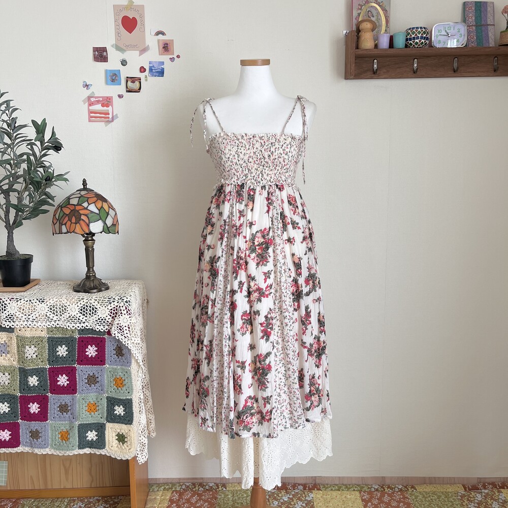 분홍, 다홍색감의 플라워 패턴 세로 패치 끈원피스예요