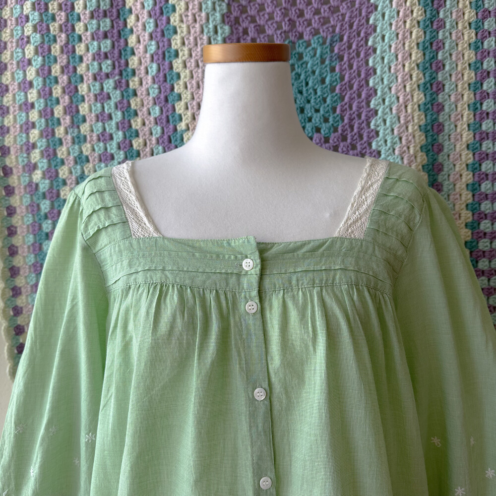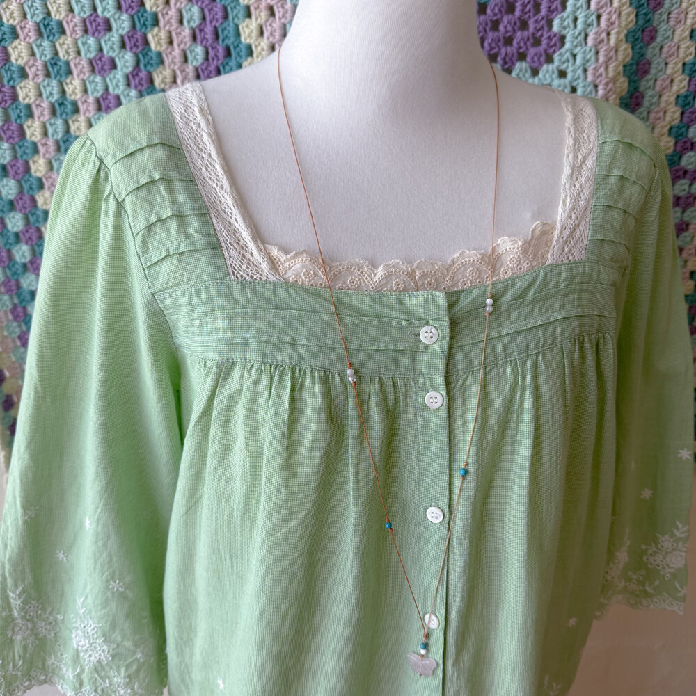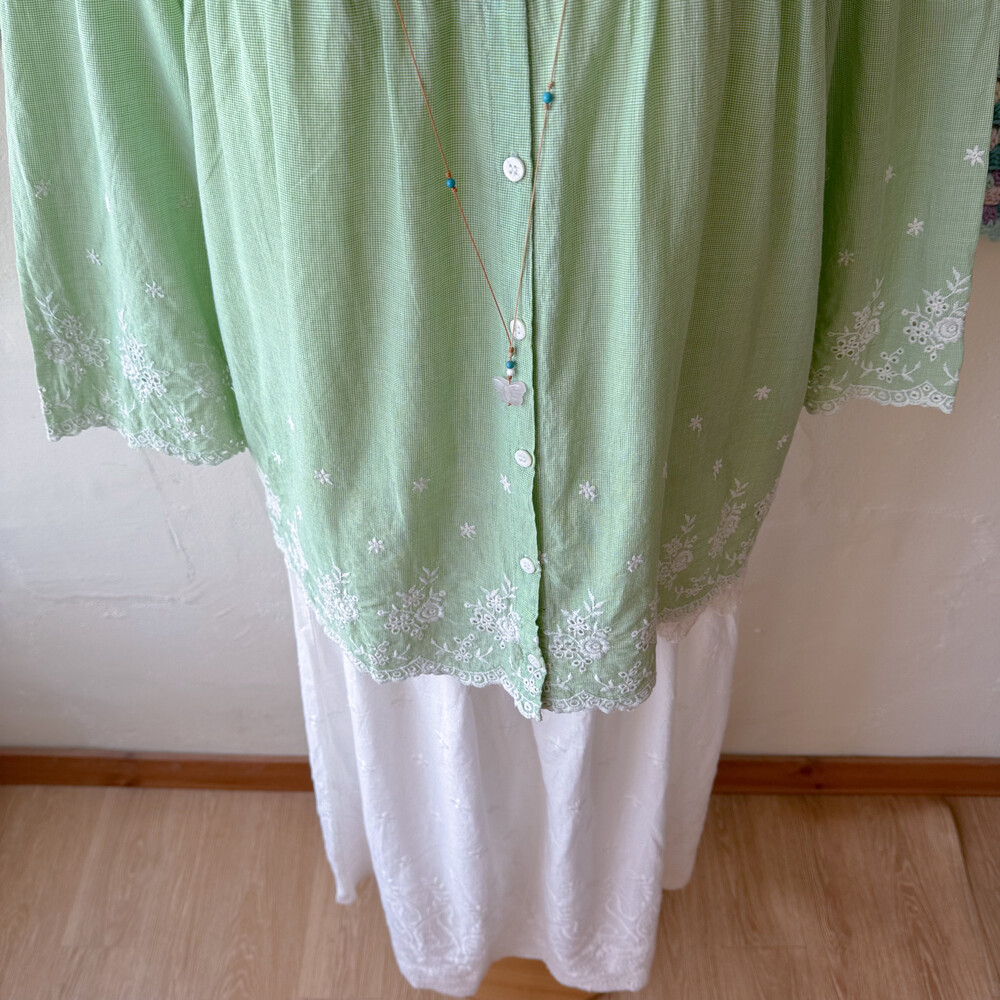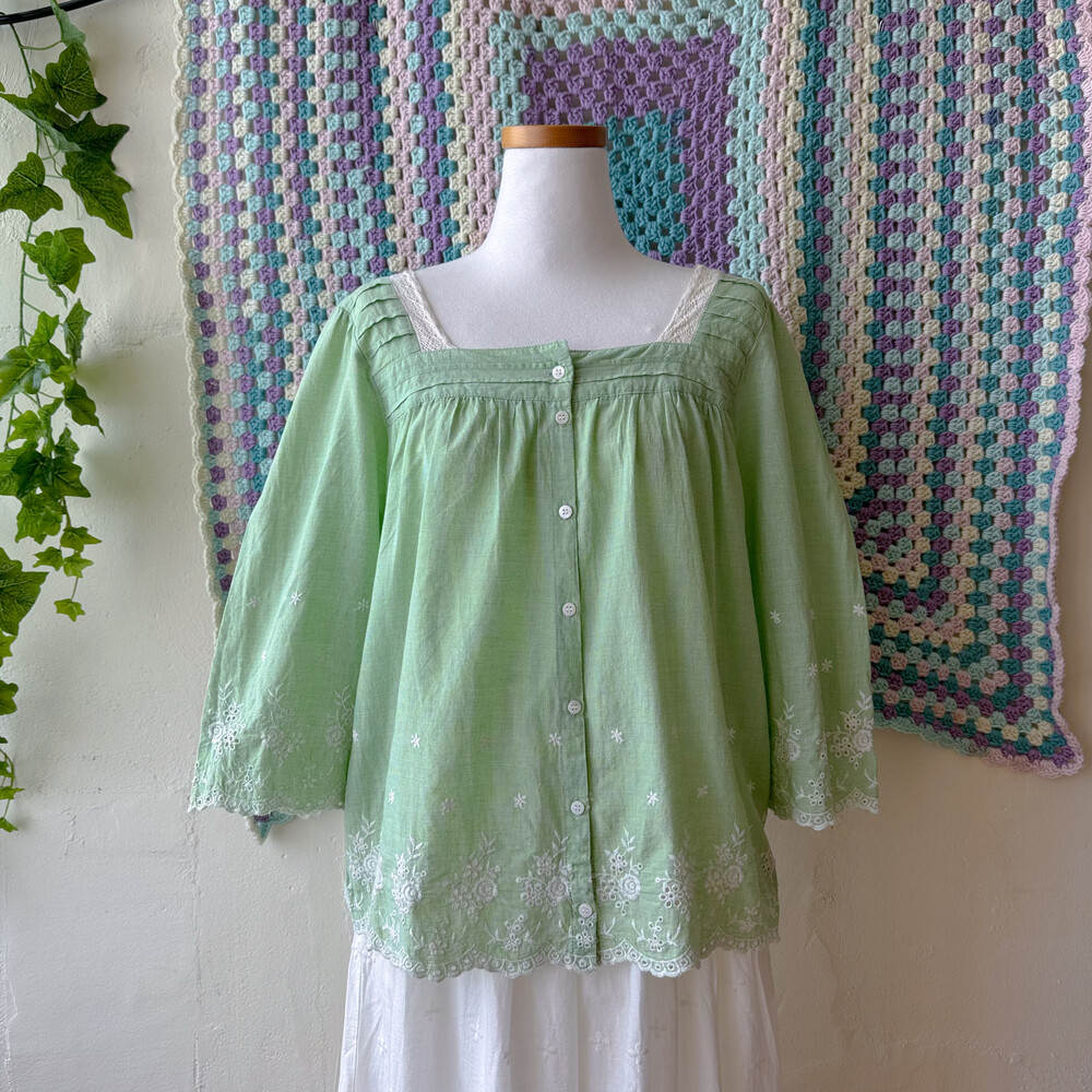 그린 색감의 스퀘어넥 코튼 블라우스예요