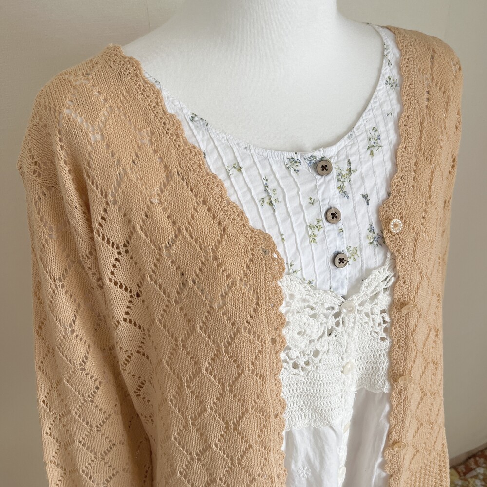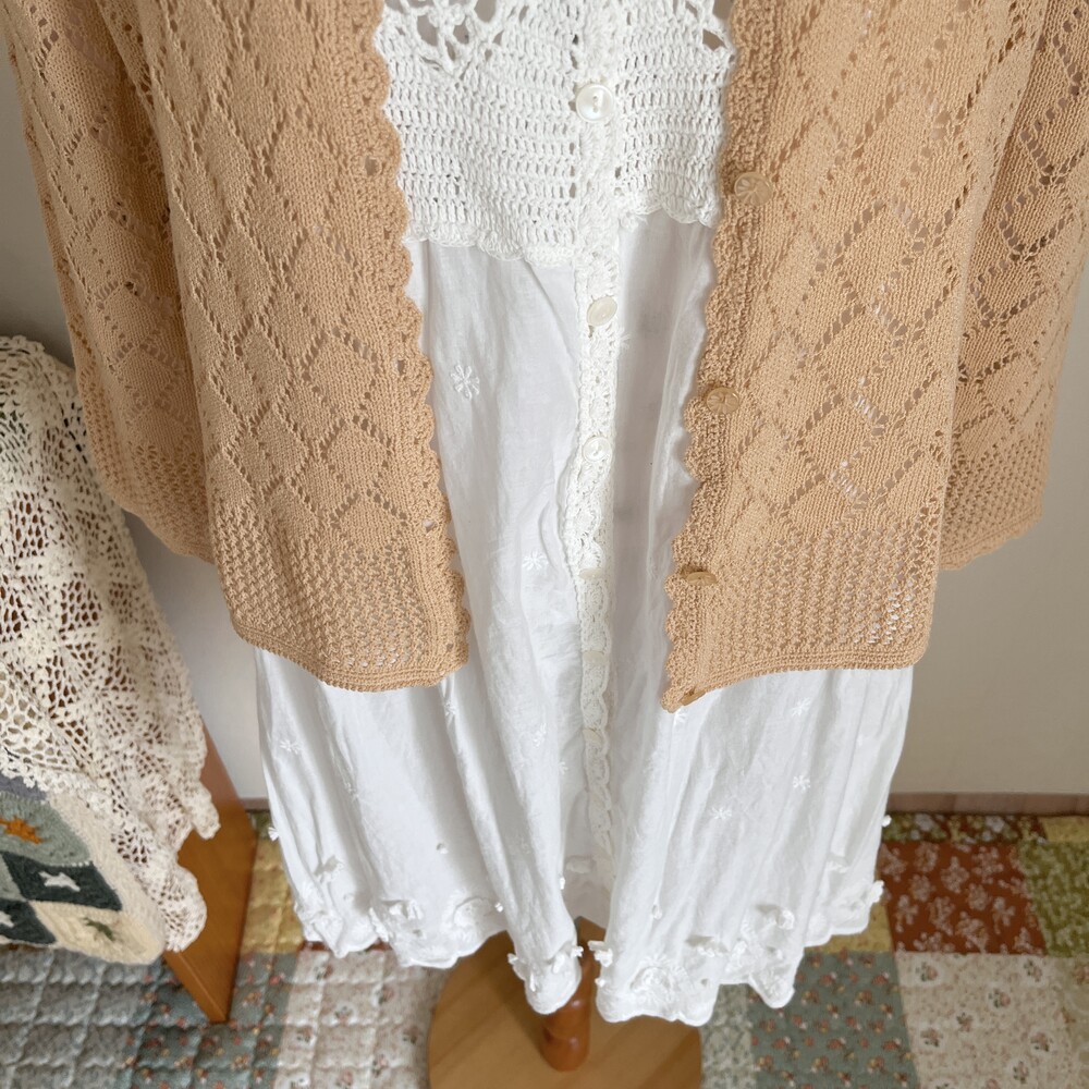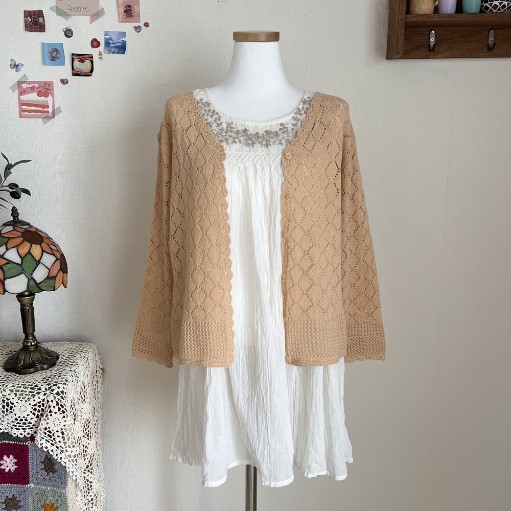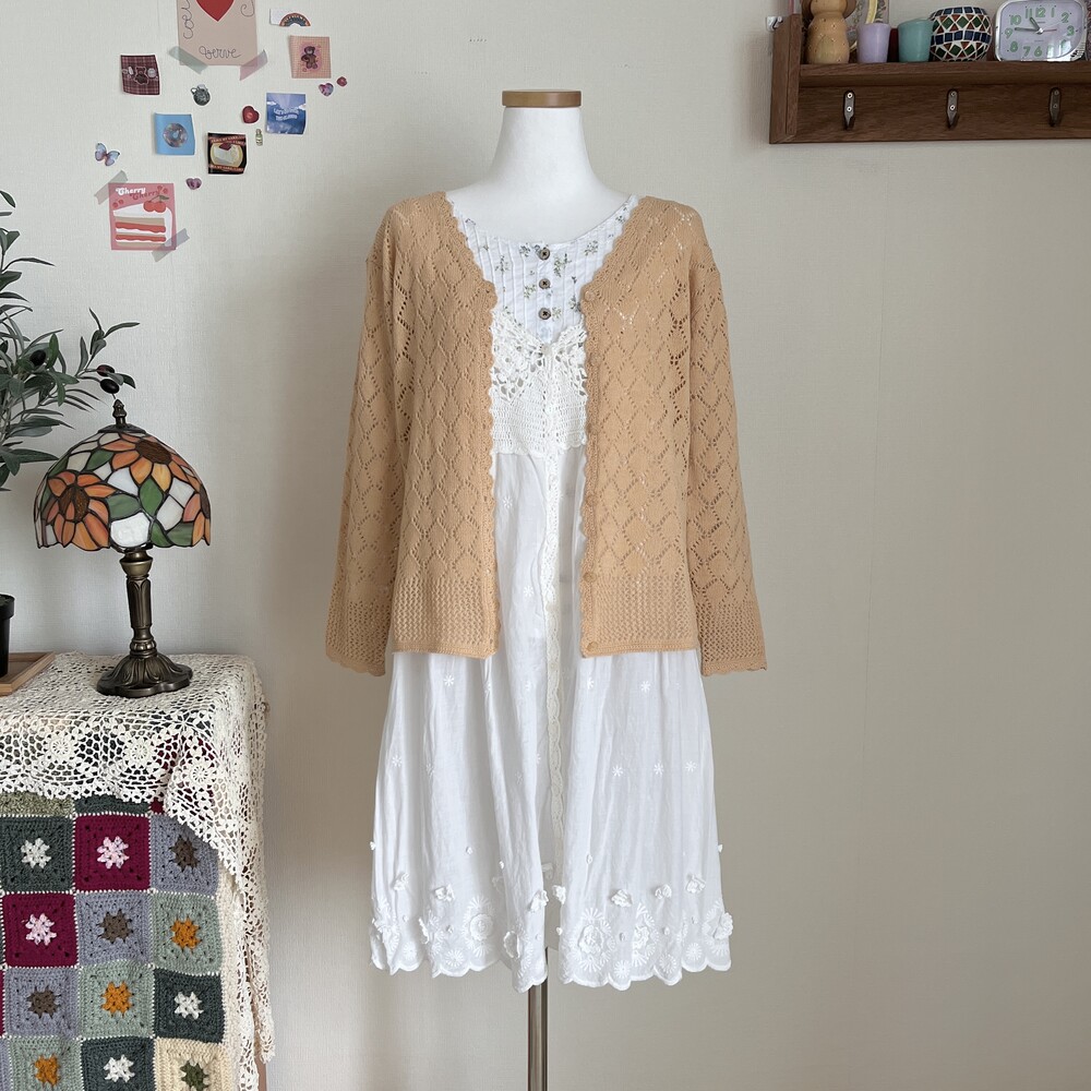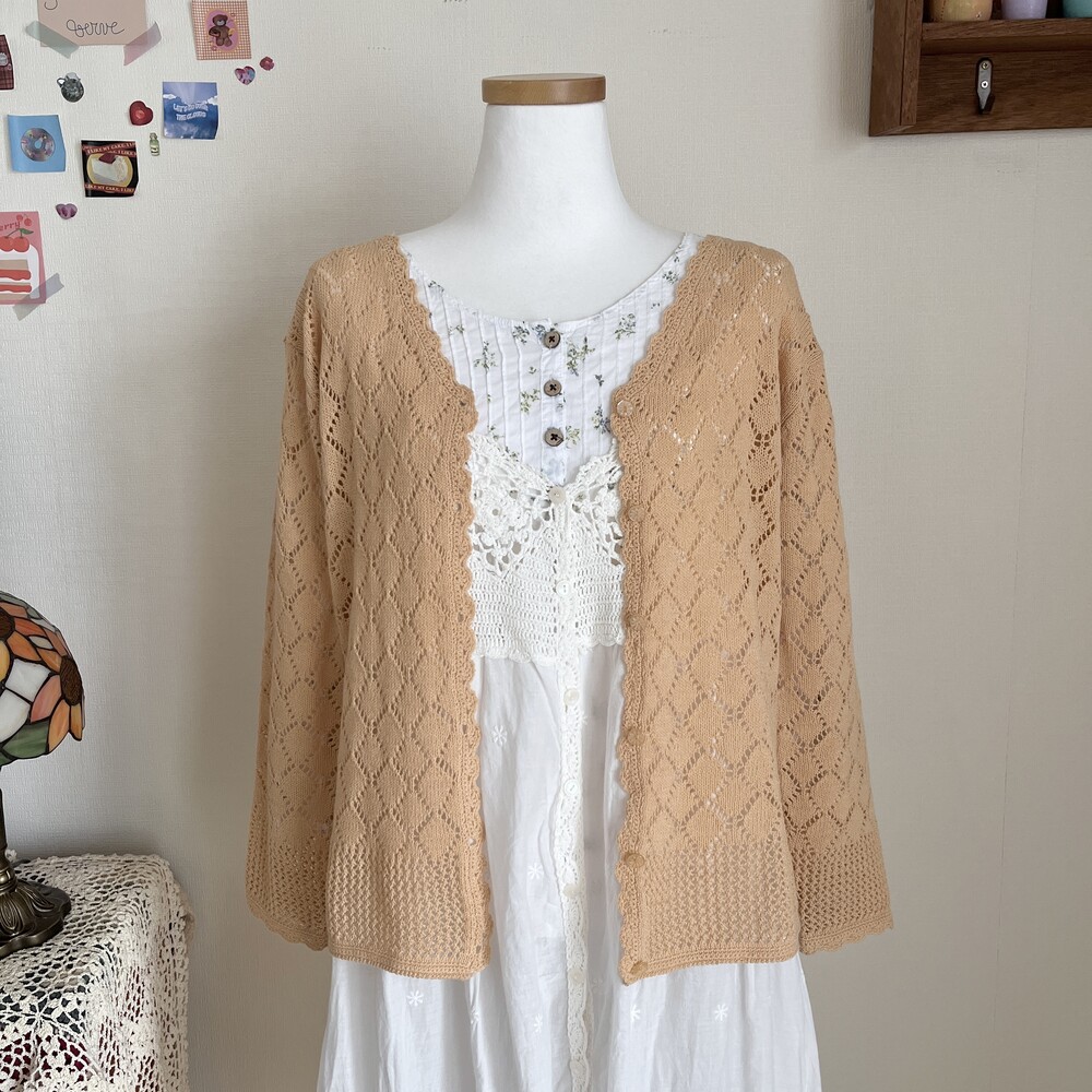 진한 베이지 색감의 크로셰 니트 가디건이에요