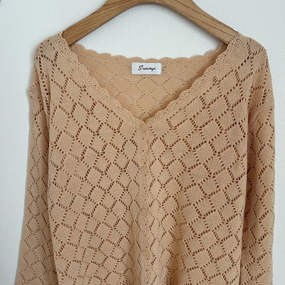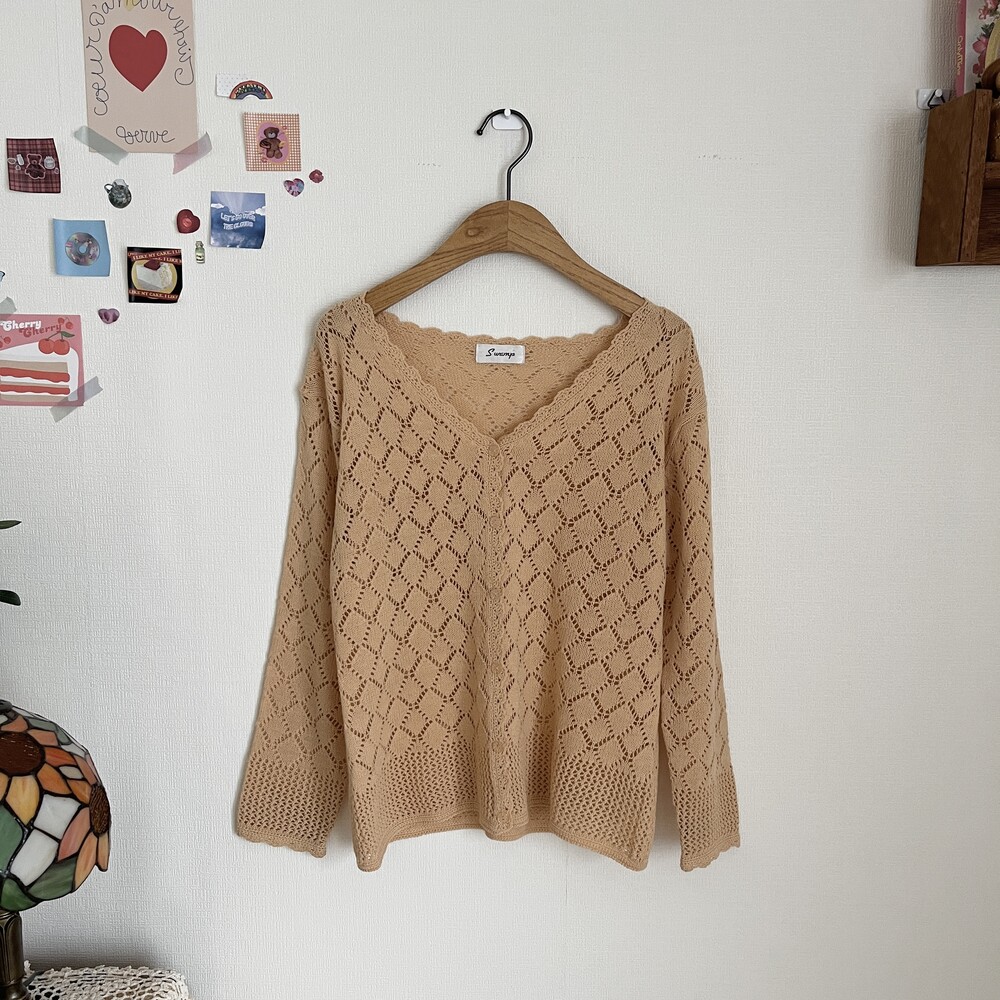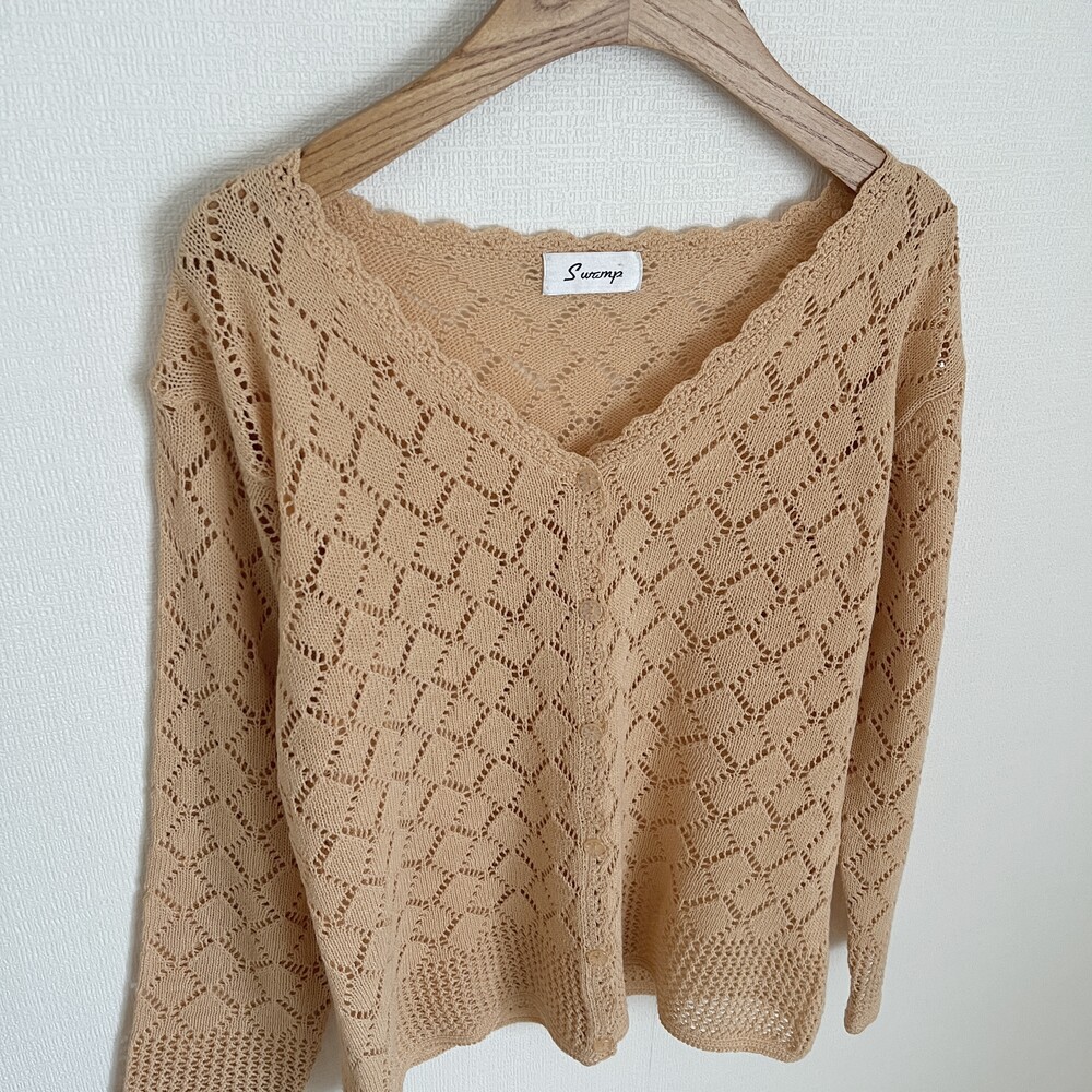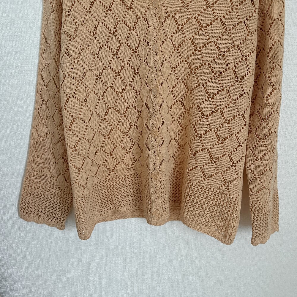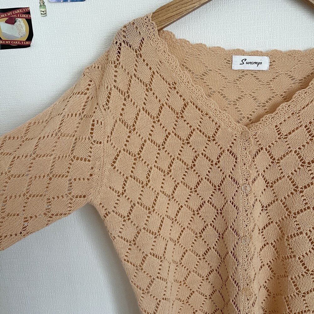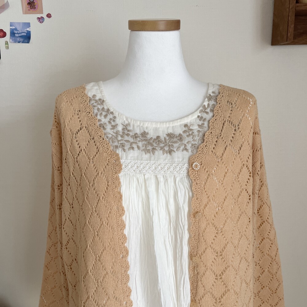 진한 베이지 색감의 크로셰 니트 가디건이에요