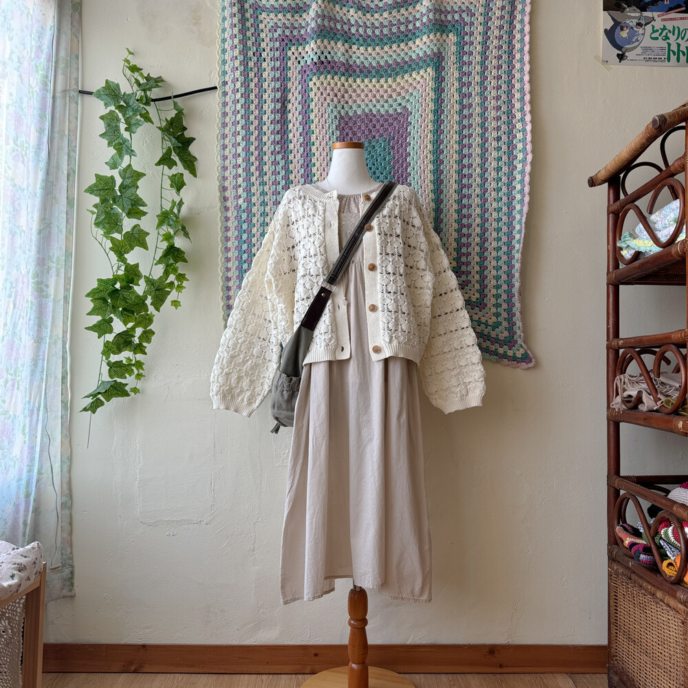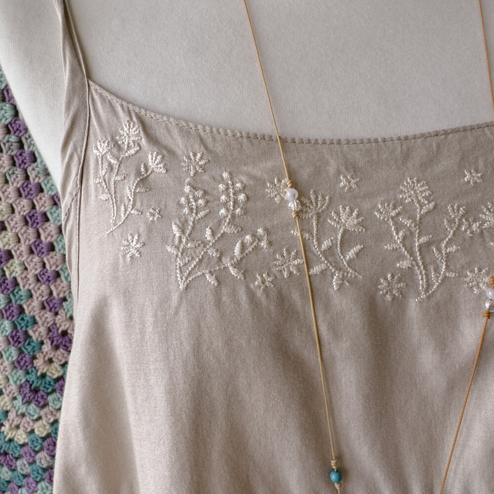 가슴 쪽에 꽃자수가 들어간 코지한 분위기의 원피스예요