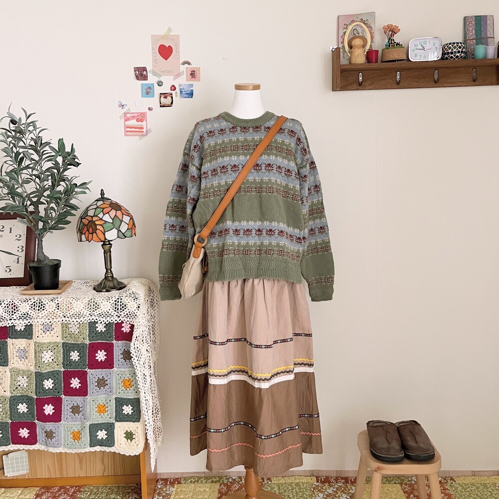 카키와 소라색감 조합의 니트예요
